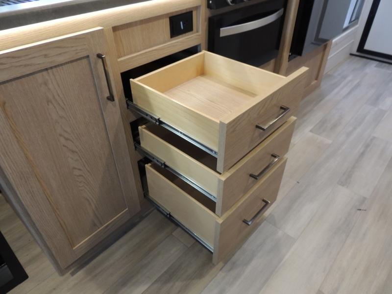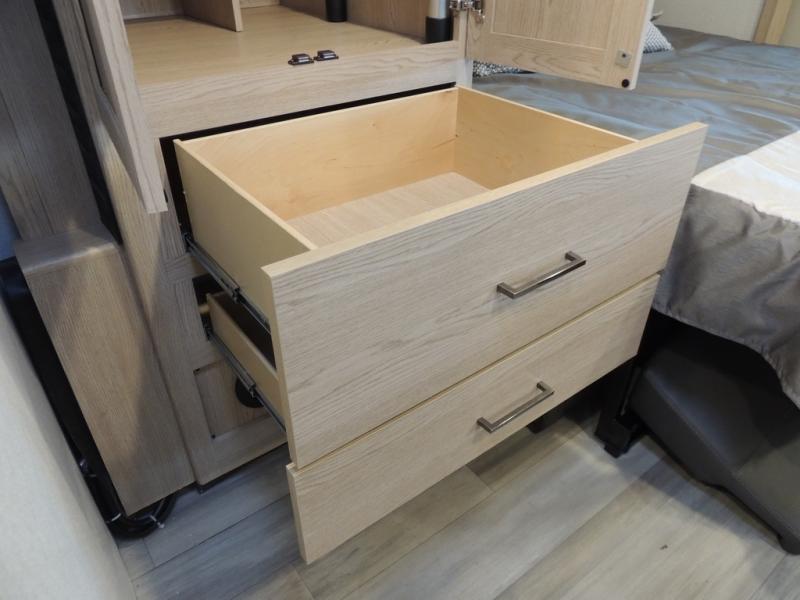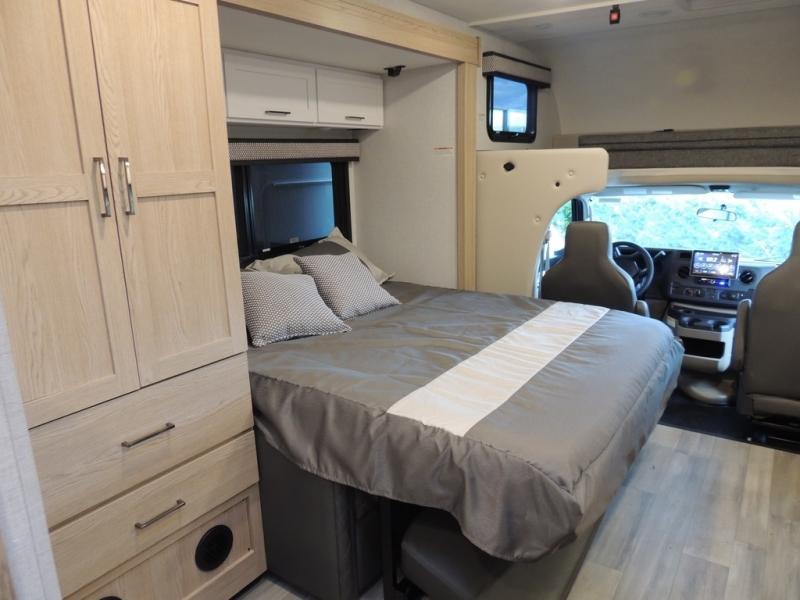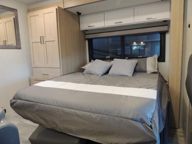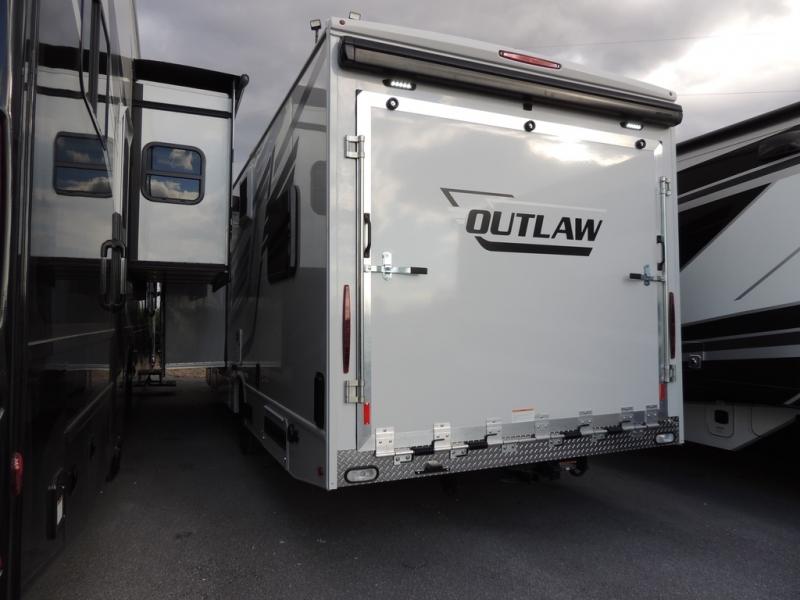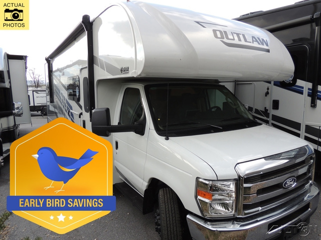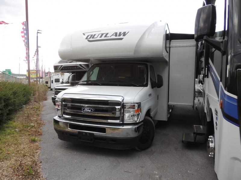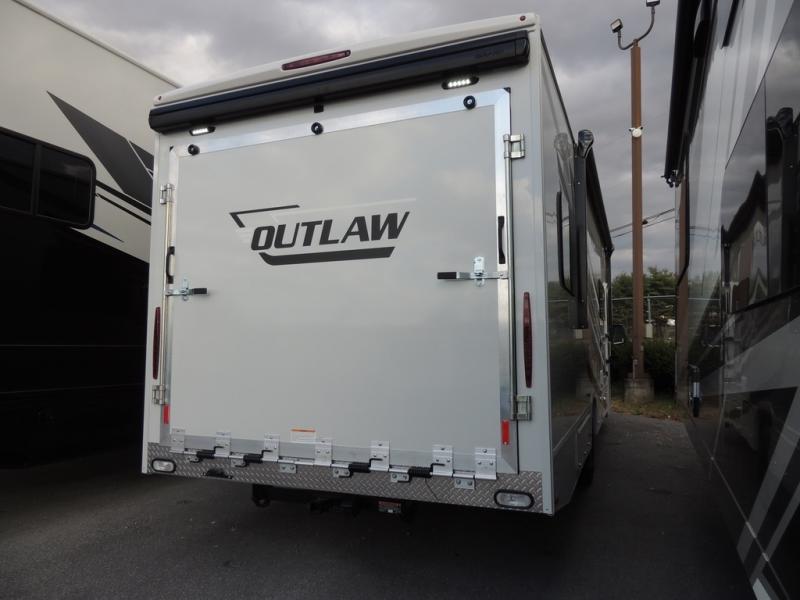 The Outlaw Class C gas motorhome toy hauler starts with the durable Ford E-Series chassis with a powerful 7.3L V8 engine that will allow you to adventure on! The 8,000 lb. hitch will be perfect for your car or motorcycle trailer, and the 10" touchscreen with a back-up monitor will let you maneuver the campground like a pro. This coach includes a Winegard ConnecT 2.0 WiFi/4G/TV antenna for all your connection needs, or you may want to unplug for a while with the 100-watt solar charging system with a power controller. The one-piece fiberglass front cap and sterling fiberglass exterior with a graphics package is sure to be eye-catching, and automatic leveling jacks come standard for easy set-up. Head inside to find pressed laminate countertops throughout, leatherette furniture, residential vinyl flooring, plus many more comforts you won't want to travel without!
