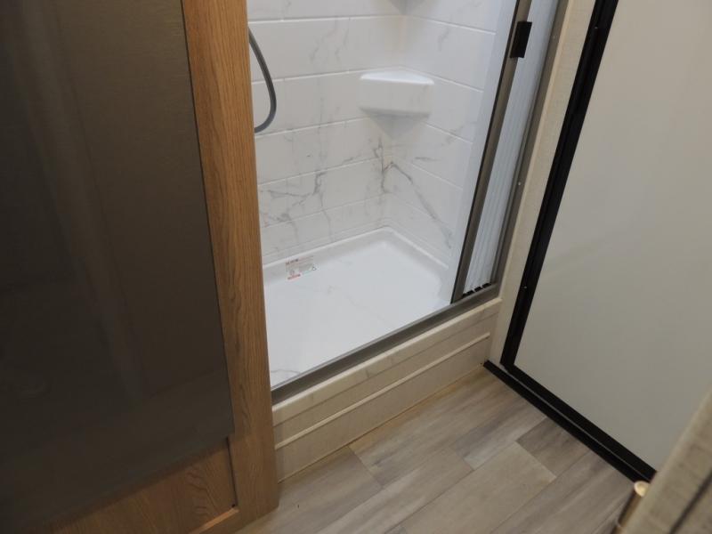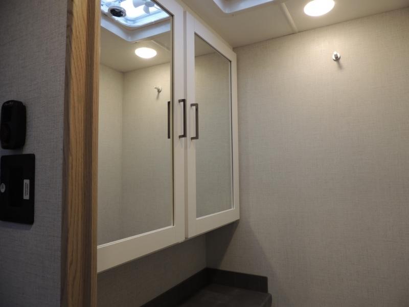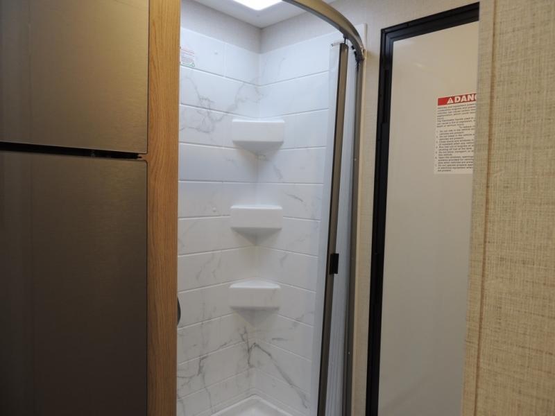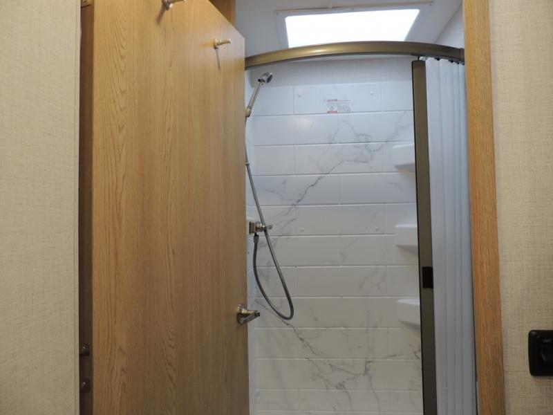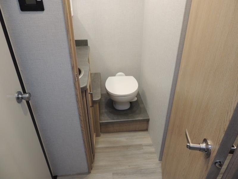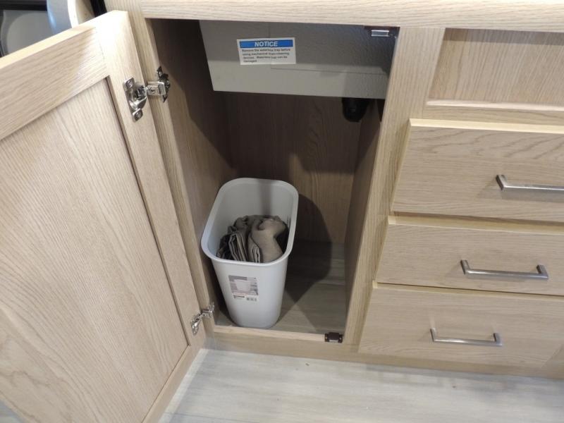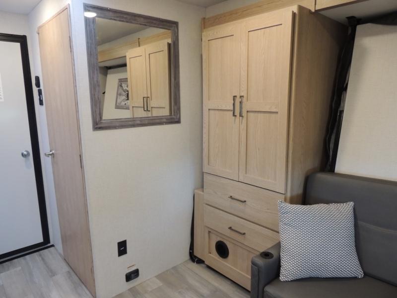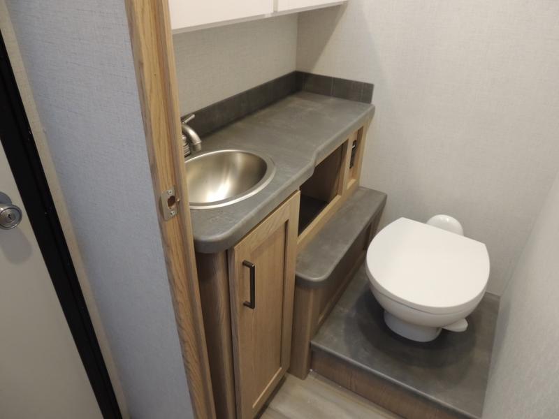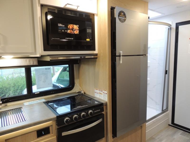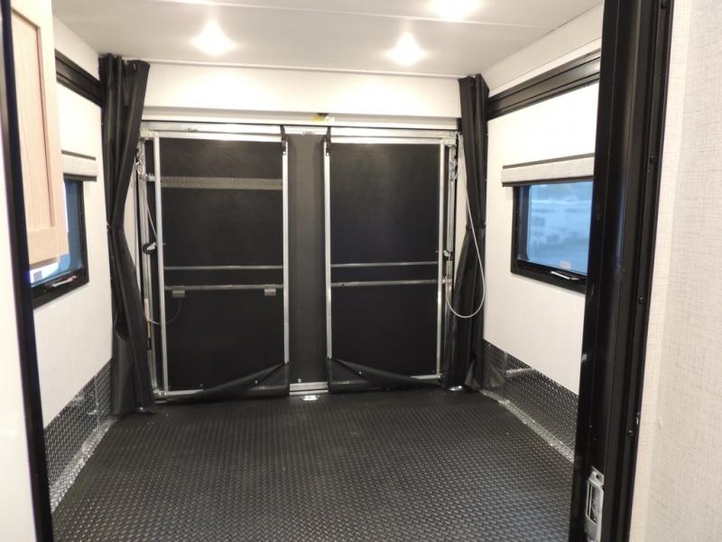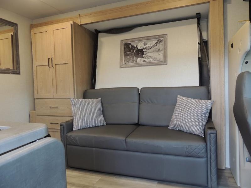 Hit the trails hard with this Class C toy hauler that includes a 8' x 10' garage with a ramp door. After you've kicked up some dirt, head back to the coach to freshen up in the split-style bath that includes a 24" x 36" shower across from the private toilet and sink. Your crew can relax on the sofa/Murphy bed you watch a movie on the 40" swivel TV in the cab-over. Cooking meals each day will be a breeze with a convection microwave oven with an air fryer and a three burner cooktop, plus there is a 12V refrigerator for perishables. You will also find plenty of storage space, including a closet within the slide out to keep your clothes tidy!