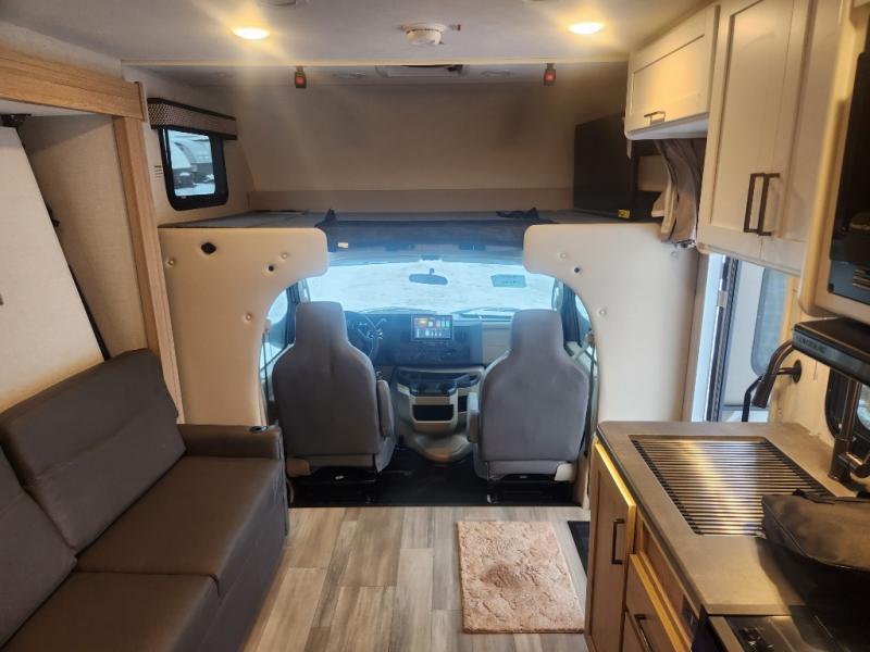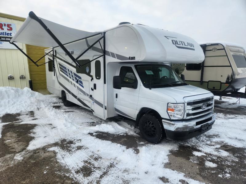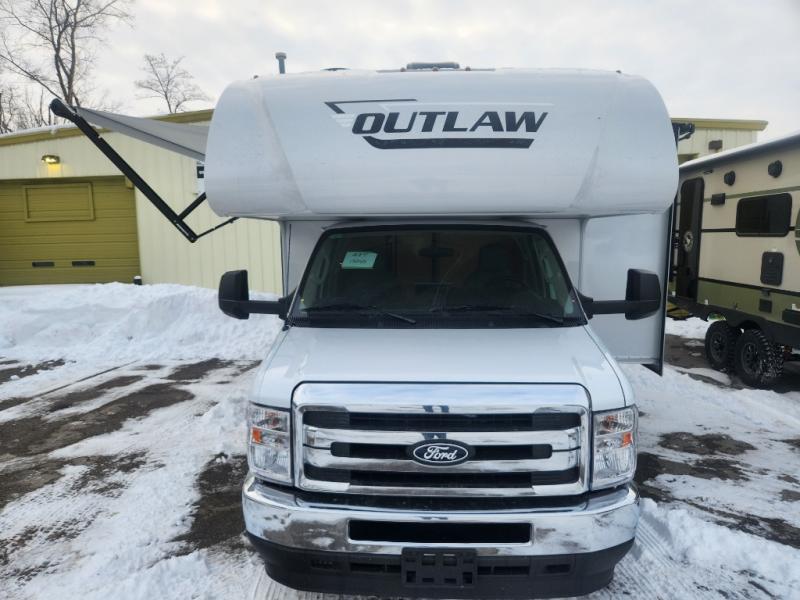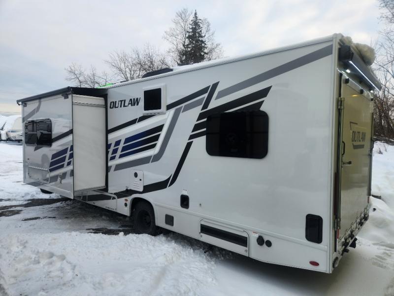 The Outlaw Class C gas motorhome toy hauler starts with the durable Ford E-Series chassis with a powerful 7.3L V8 engine that will allow you to adventure on! The 8,000 lb. hitch will be perfect for your car or motorcycle trailer, and the 10" touchscreen with a back-up monitor will let you maneuver the campground like a pro. This coach includes a Winegard ConnecT 2.0 WiFi/4G/TV antenna for all your connection needs, or you may want to unplug for a while with the 100-watt solar charging system with a power controller. The one-piece fiberglass front cap and sterling fiberglass exterior with a graphics package is sure to be eye-catching, and automatic leveling jacks come standard for easy set-up. Head inside to find pressed laminate countertops throughout, leatherette furniture, residential vinyl flooring, plus many more comforts you won't want to travel without!