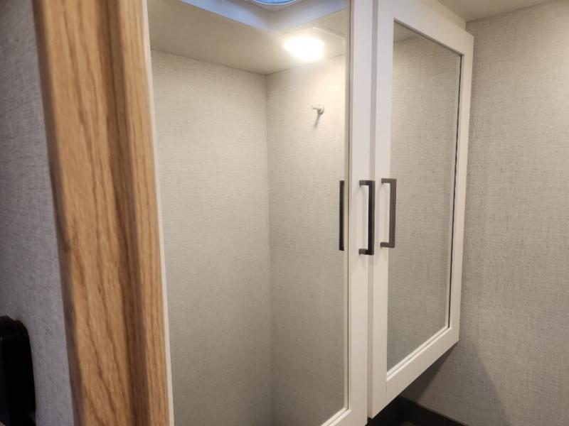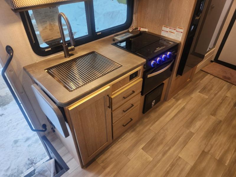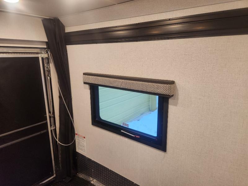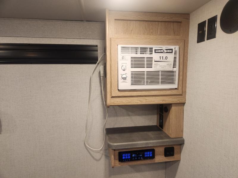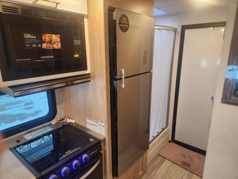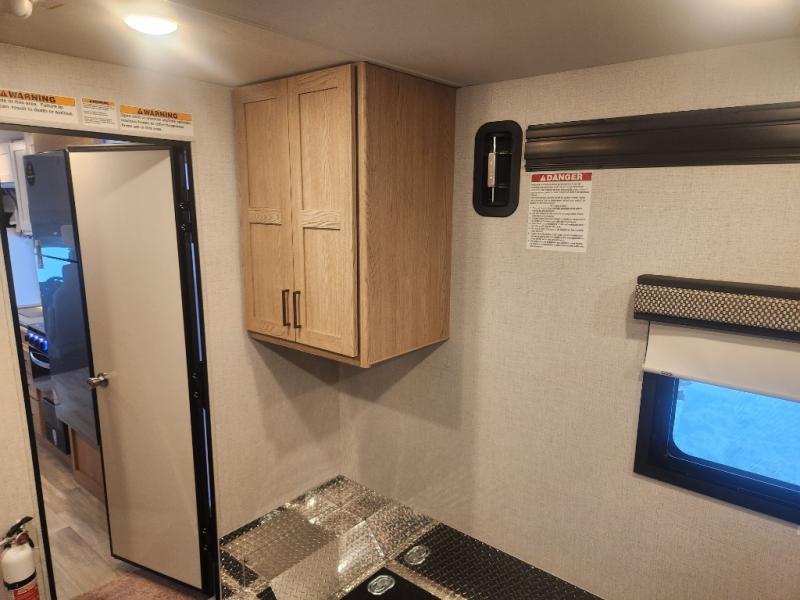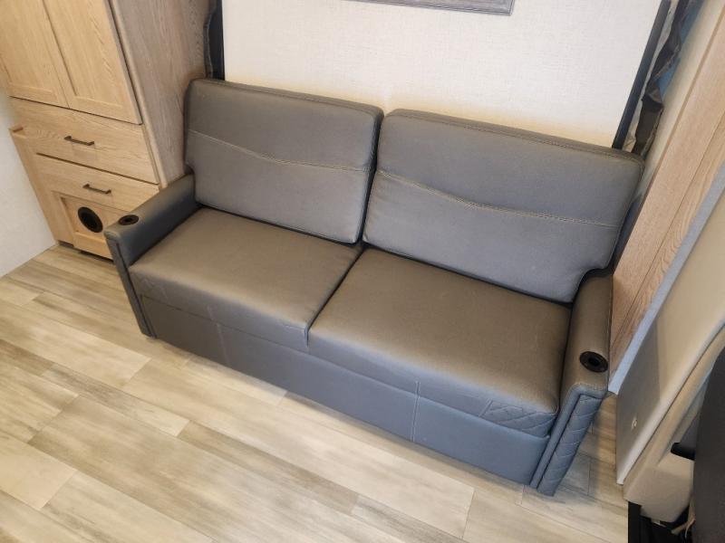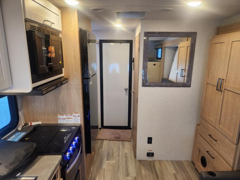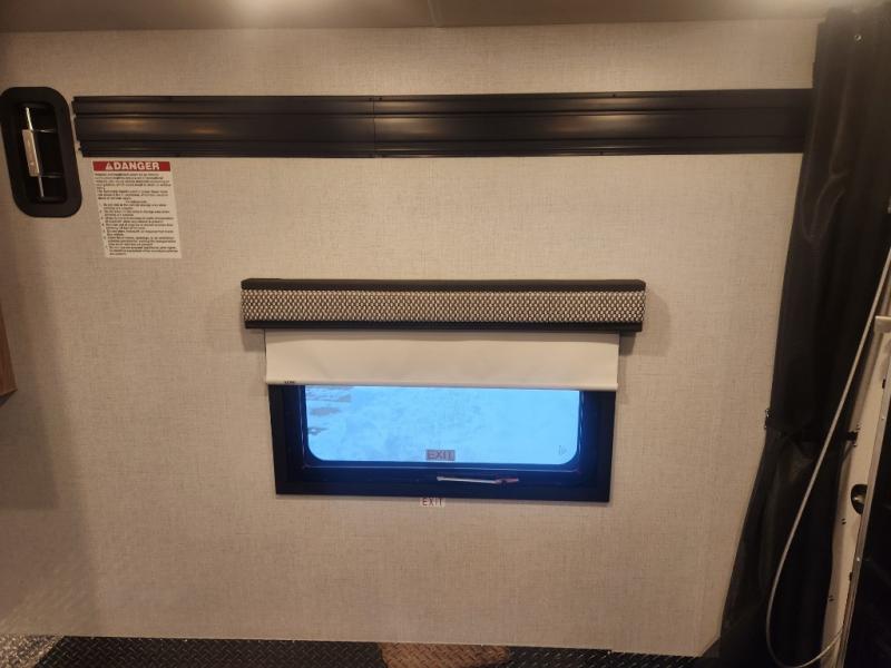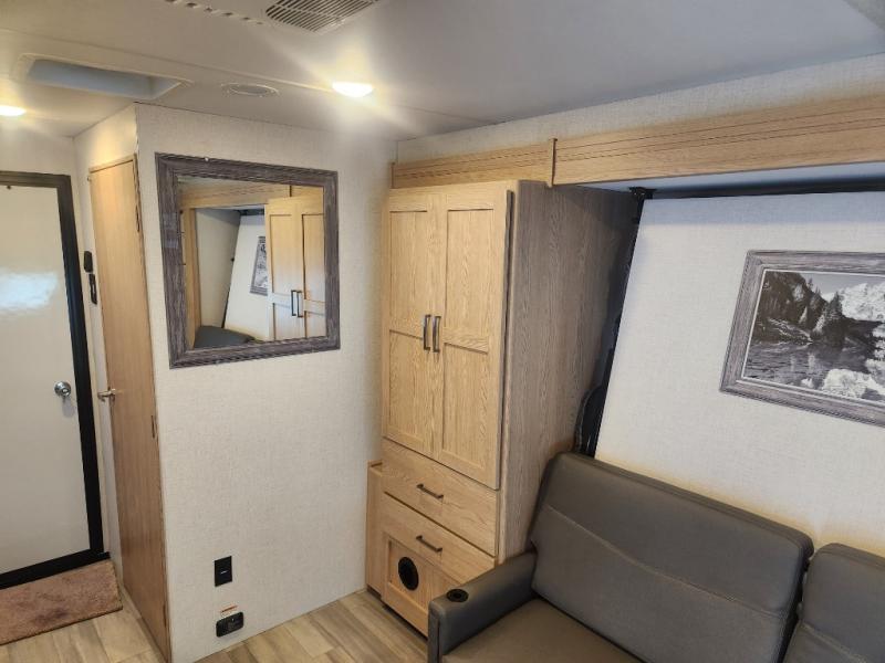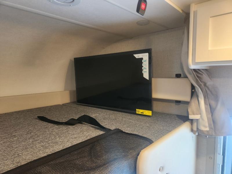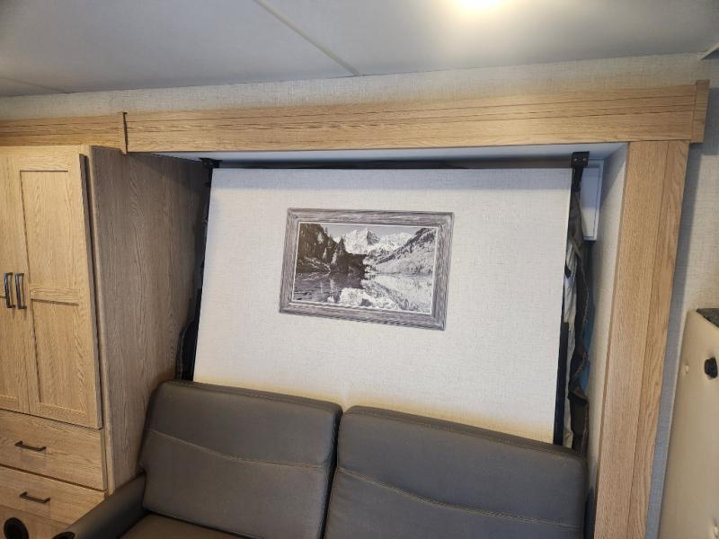Hit the trails hard with this Class C toy hauler that includes a 8' x 10' garage with a ramp door. After you've kicked up some dirt, head back to the coach to freshen up in the split-style bath that includes a 24" x 36" shower across from the private toilet and sink. Your crew can relax on the sofa/Murphy bed you watch a movie on the 40" swivel TV in the cab-over. Cooking meals each day will be a breeze with a convection microwave oven with an air fryer and a three burner cooktop, plus there is a 12V refrigerator for perishables. You will also find plenty of storage space, including a closet within the slide out to keep your clothes tidy!