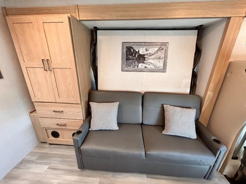 - Leatherette Sofa + Murphy Bed Conversion and Arm Mounted Tables, Window Privacy Roller Shades