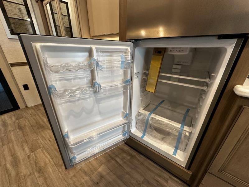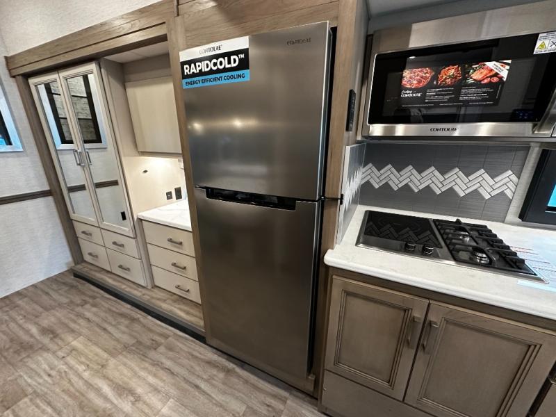 The heart of the Outlaw 38M is its well-equipped kitchen. With solid surface countertops, a large residential-style refrigerator, a three-burner range, and abundant storage, this kitchen makes meal prep simple whether you’re cooking for two or hosting friends. The adjacent dining area offers a comfortable place to enjoy meals, share stories, and plan your next destination.