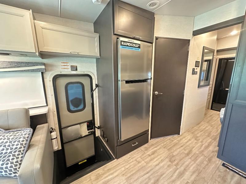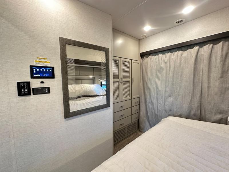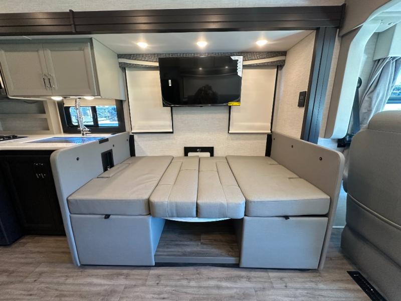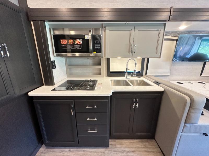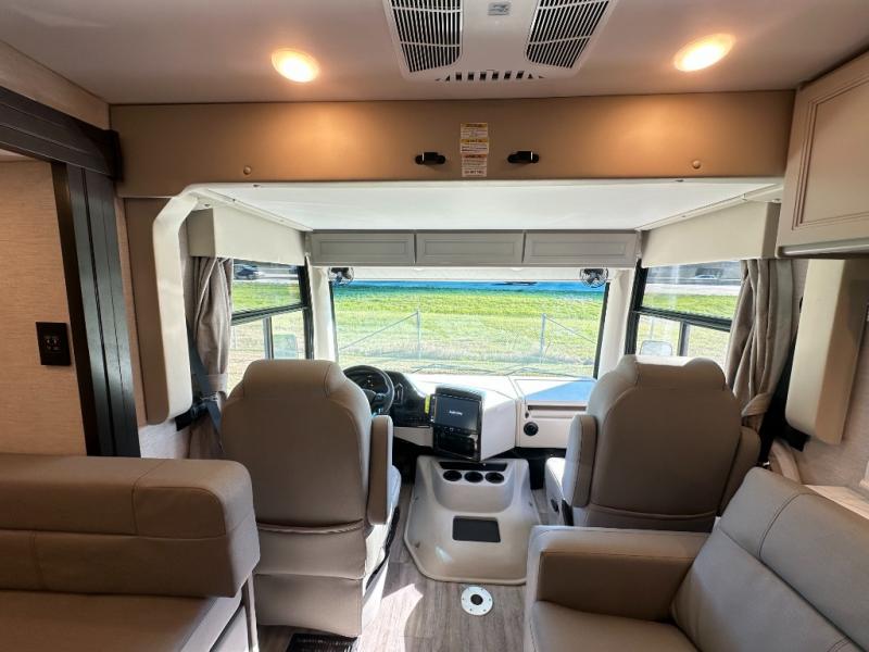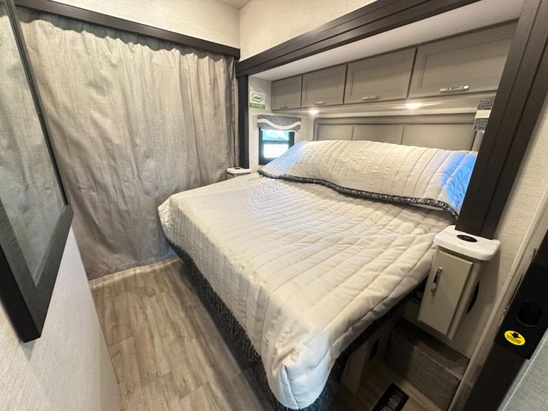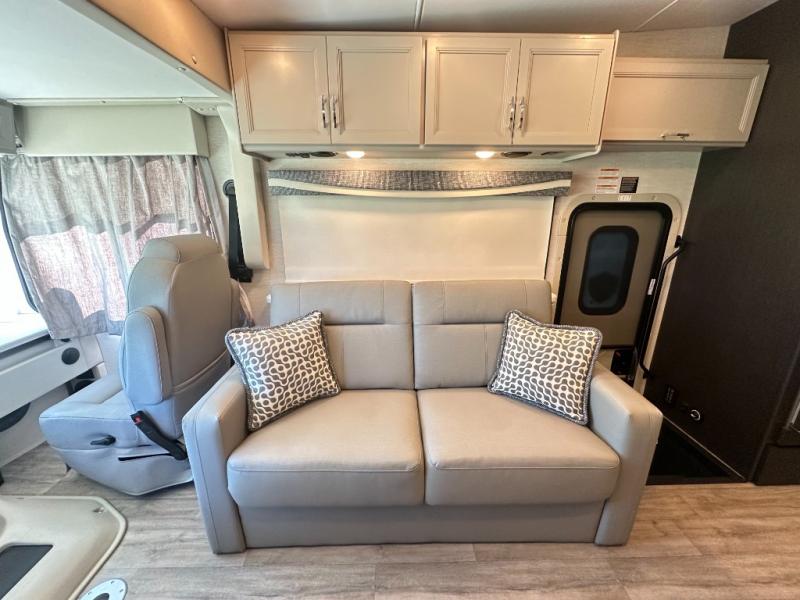 With any Outlaw Wild West Edition Class A gas toy hauler by Thor Motor Coach, you will have a capable and powerful motorhome for all your adventures. There is a vacu-bond laminated roof, walls, and floor with block foam insulation, a premium one-piece domed roof membrane, and a welded tubular steel floor for added strength. You will love having an 8,000 lb. trailer hitch for your towing needs, and the air ventilation sidewalls vents in the garage will be appreciated when gas and oil odors are present. Head inside to find residential vinyl flooring, full extension soft close metal ball-bearing drawer guides, and solid surface countertops in the kitchen. Some of the cockpit features the driver will enjoy are the 10.1" touchscreen dash radio, the blind spot detection, and the back-up monitor for easier parking. The RapidCamp+ multiplex wiring control system with a 7" screen also comes standard, along with an Onan RV QG 5500 gas generator with automatic generator start for added convenience. More utilities include a tankless water heater, a whole coach water filtration system, a 100-watt solar charging system, and more!