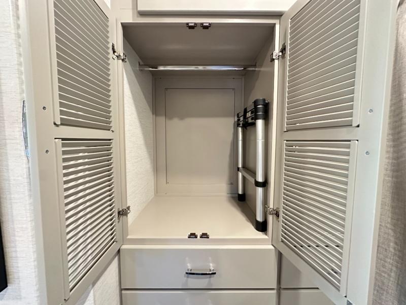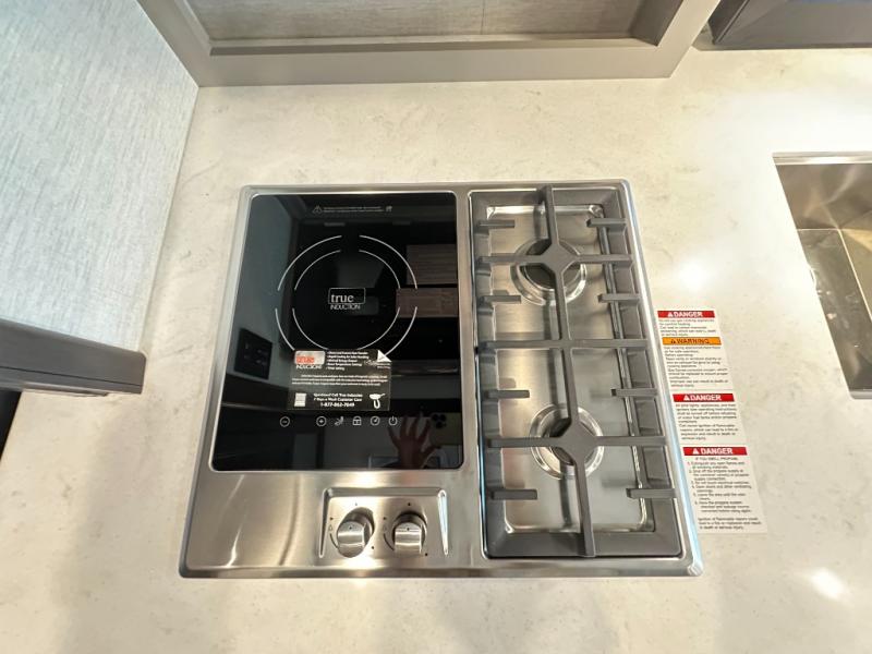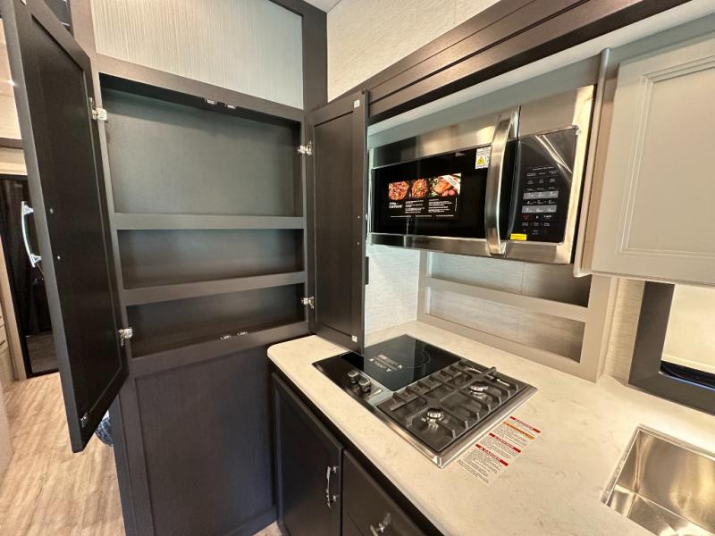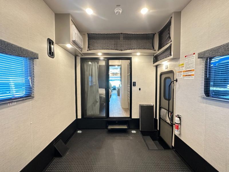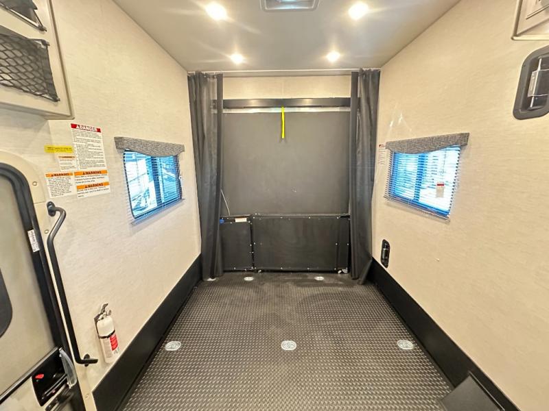 Whether you're heading to the lake, a bike show, or business expo, this toy hauler coach will be perfect for all your needs. You will have an 8' x 10' 2" garage with ample space for your items, and the bug screen on the back will let you enjoy fresh air without the bugs. You can also use the ramp door as a patio deck when you want to entertain guests! The private bedroom includes a king bed slide out across from TV prep and a closet with washer and dryer prep if you want the option to make laundry day easier. The kitchen includes a two burner gas range with a single induction cooktop, an over-the-range convection microwave, and a residential refrigerator for generous food storage. Your crew can get comfortable on the Dream Dinette and sofa bed, and there is a drop-down overhead bunk for more sleeping space!