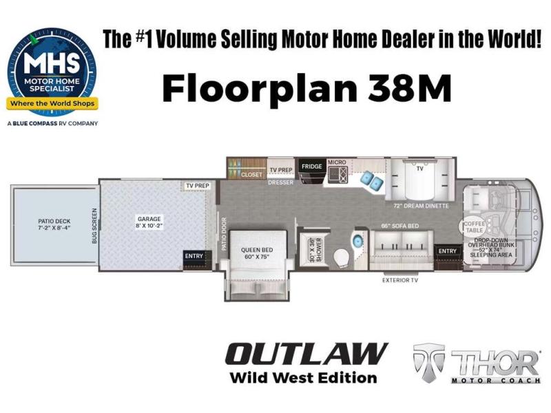 This RV is approximately 39 feet 10 inches in length with 2 slide-out rooms, high polished aluminum wheels, residential refrigerator, bug screens at rear in the garage, roller shades on the driver & passenger windows, as well as drop down ramp door with spring assist & railing for patio use. This beautiful new motorhome also features the new Ford chassis with 7.3L PFI V-8, a 6-speed TorqShift® automatic transmission, an updated instrument cluster, automatic headlights and a tilt/telescoping steering wheel. The Outlaw Wild West toy hauler RV has an incredible list of standard features including beautiful wood & interior decor packages, LED TVs, (2) A/C units, power patio awing with integrated LED lighting, dual side entrance doors, 1-piece windshield, 3 camera monitoring system, automatic leveling system, Soft Touch leather furniture and day/night shades.