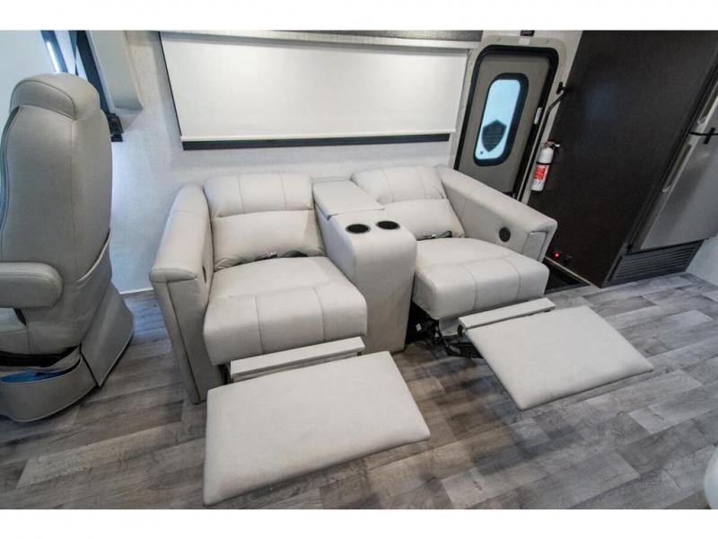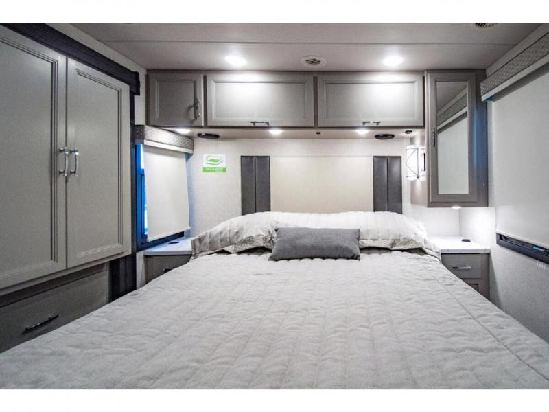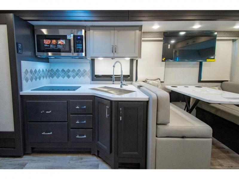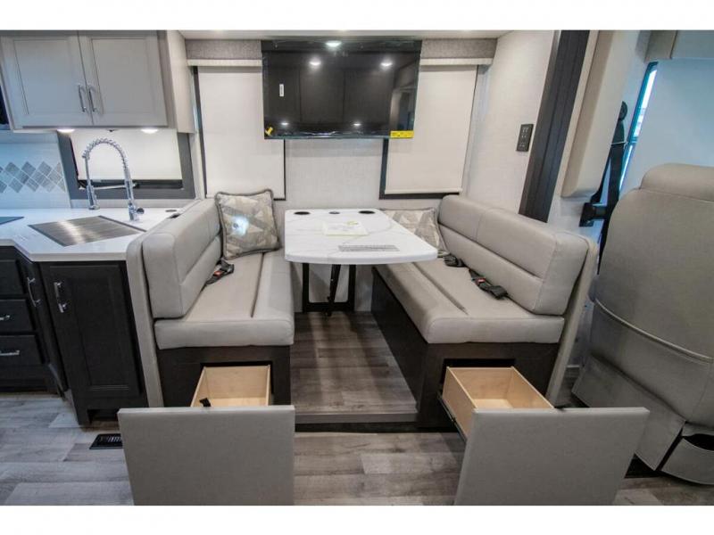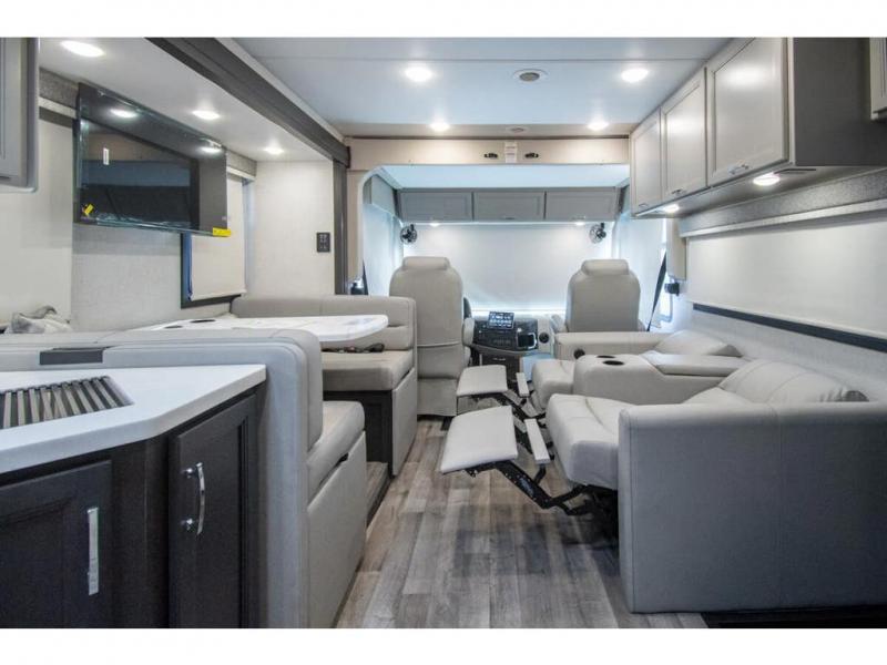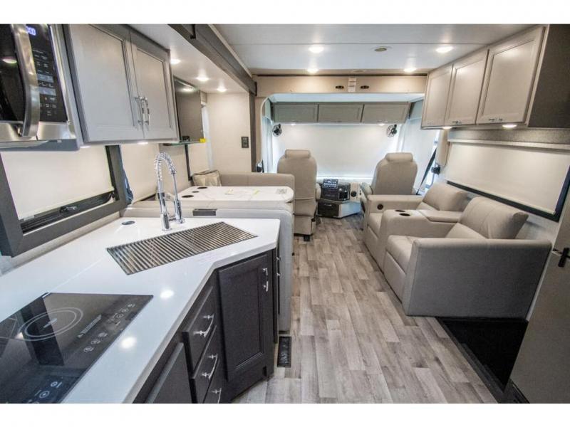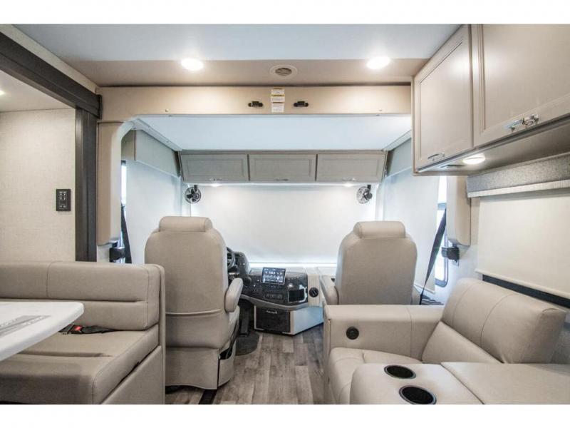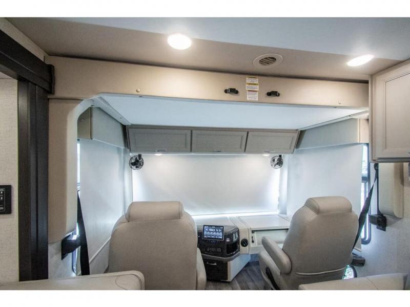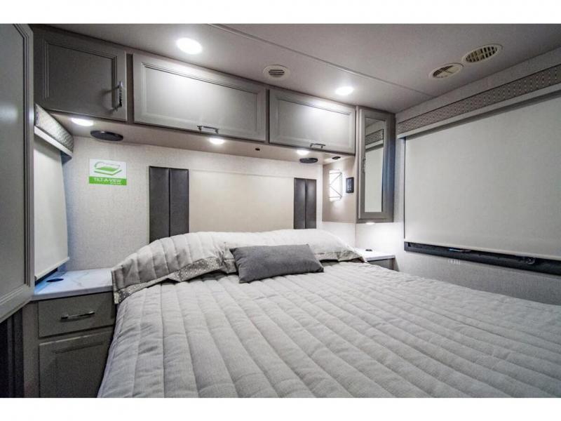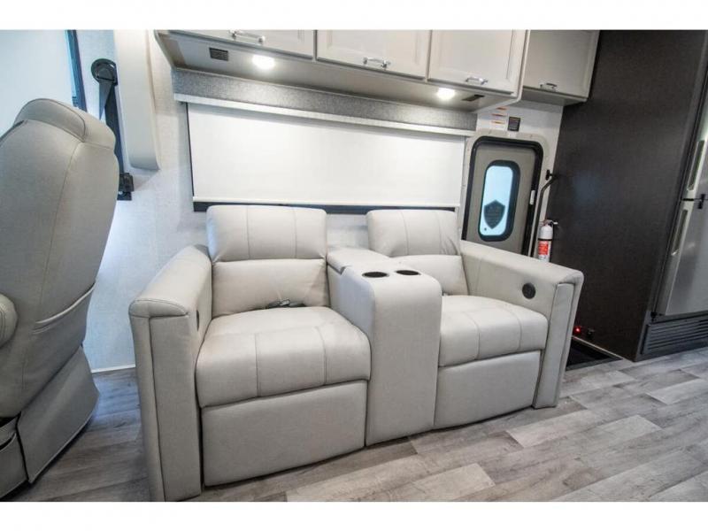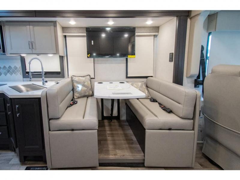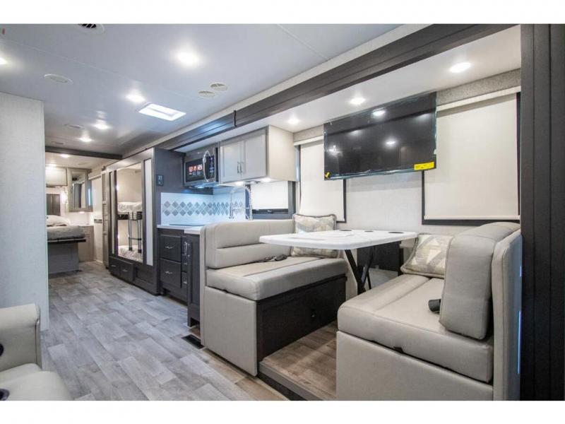 The whole family can travel together in this motorhome! The kiddos can sleep on the 24" x 27" bunk beds that can convert to a wardrobe and the 48" x 74" bunk over cab provides additional sleeping space. The rear private bedroom has a Tilt-A-View inclining queen bed for a good night's rest, a closet slide, a 32" LED TV to watch your favorite movies in comfort, and an area that has stacking washer and dryer prep. You could even transform the 72" Dream Dinette and 67" jackknife sofa into extra sleeping spaces or switch out the sofa for the optional 67" theater seats. Freshen up each morning in the full bathroom with the 30" x 36" shower, and enjoy entertainment even outdoors with the outside TV!