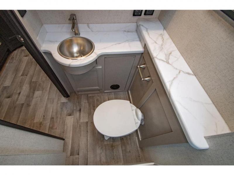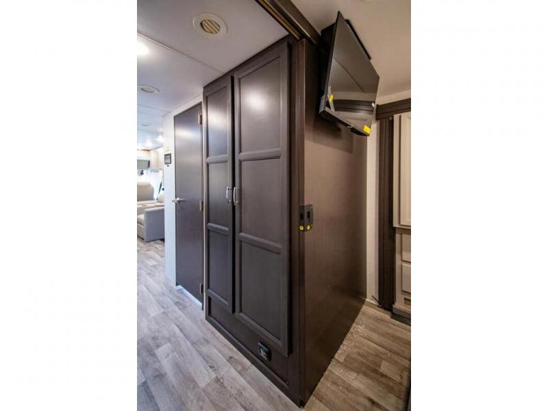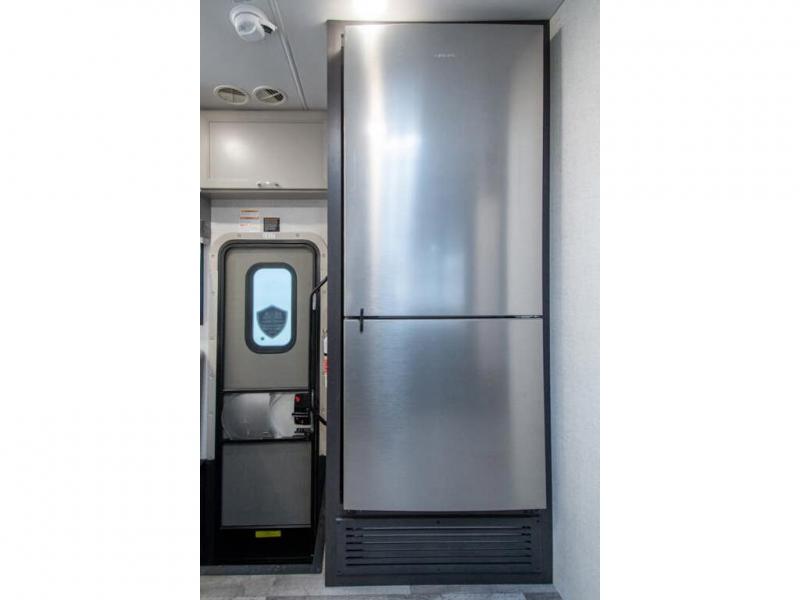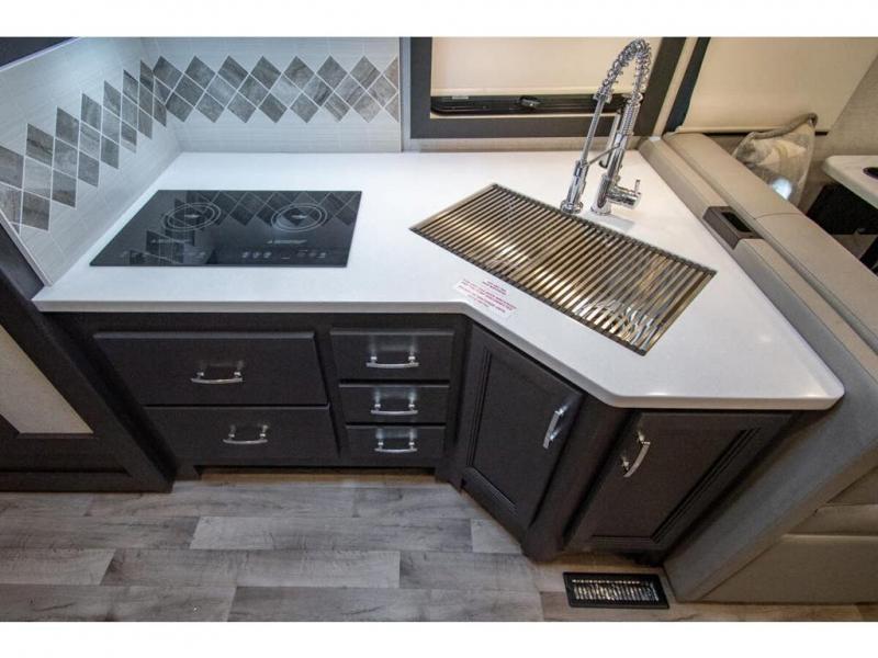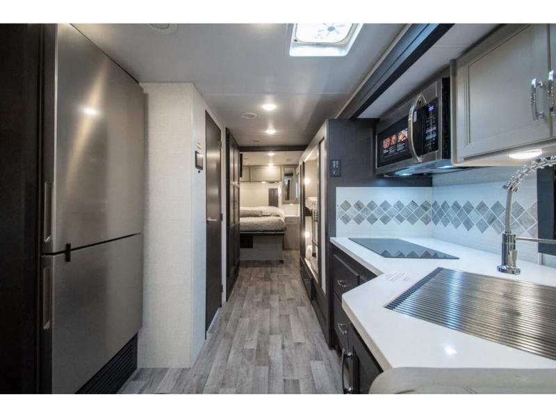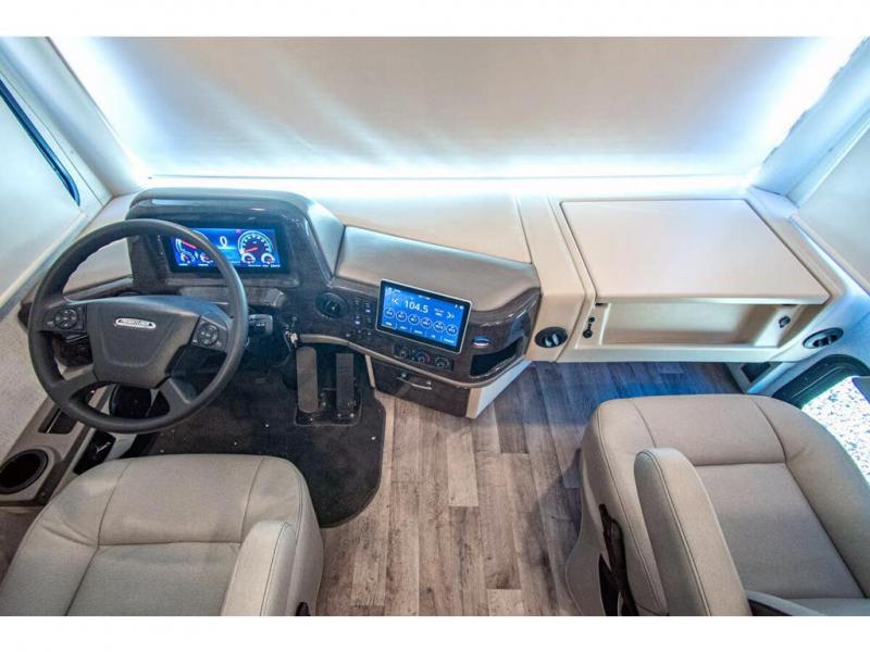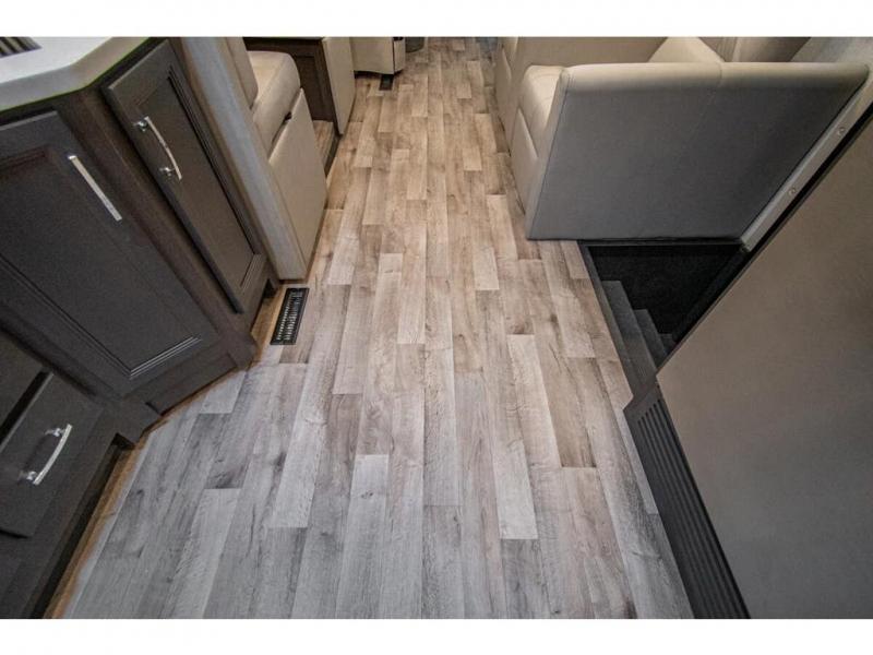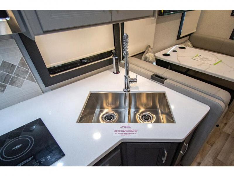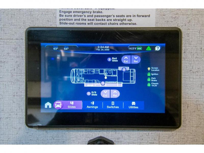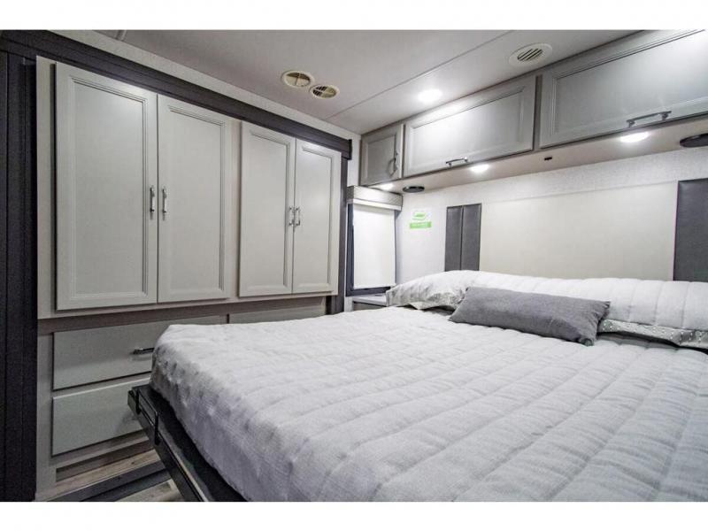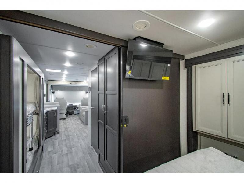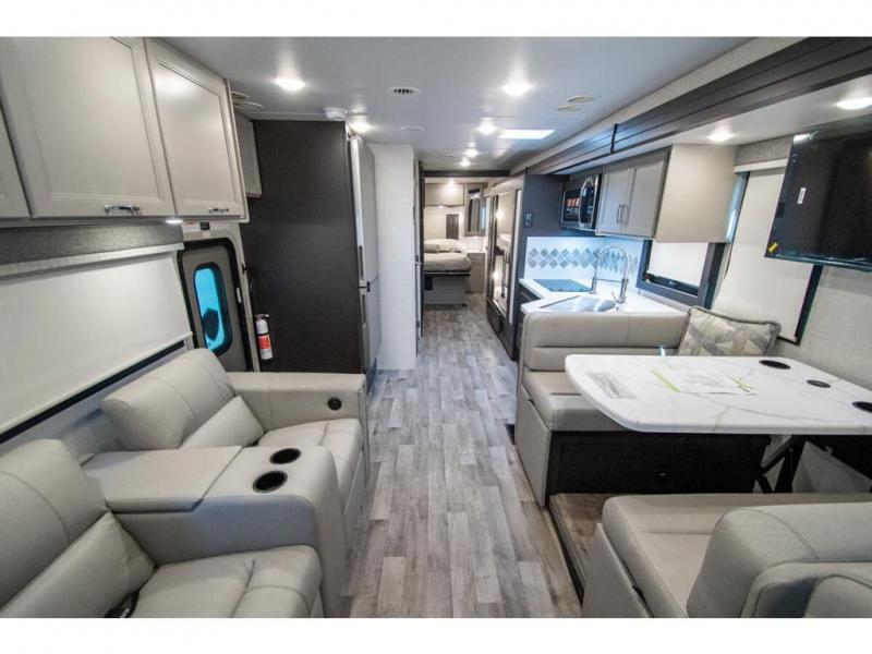 The whole family can travel together in this motorhome! The kiddos can sleep on the 24" x 27" bunk beds that can convert to a wardrobe and the 48" x 74" bunk over cab provides additional sleeping space. The rear private bedroom has a Tilt-A-View inclining queen bed for a good night's rest, a closet slide, a 32" LED TV to watch your favorite movies in comfort, and an area that has stacking washer and dryer prep. You could even transform the 72" Dream Dinette and 67" jackknife sofa into extra sleeping spaces or switch out the sofa for the optional 67" theater seats. Freshen up each morning in the full bathroom with the 30" x 36" shower, and enjoy entertainment even outdoors with the outside TV!