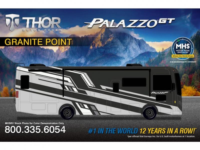 Start traveling affordably with the ultimate comfort and conveniences with any one of these Thor Motor Coach Palazzo GT Class A diesel motorhomes! They are built on a robust foundation with the Freightliner XC-S straight rail chassis with Atlas foundation, and powered by a Cummins diesel engine. The full body paint package with gel-coated sidewalls will turn heads on the highway and the invisible front paint protection will protect it from road debris. The inviting interiors have everything you need to feel right at home with features like an electric fireplace, easy-to-maintain rolled vinyl flooring, solid surface countertops, and residential refrigerator to fit your whole grocery haul. Come find your favorite one today!