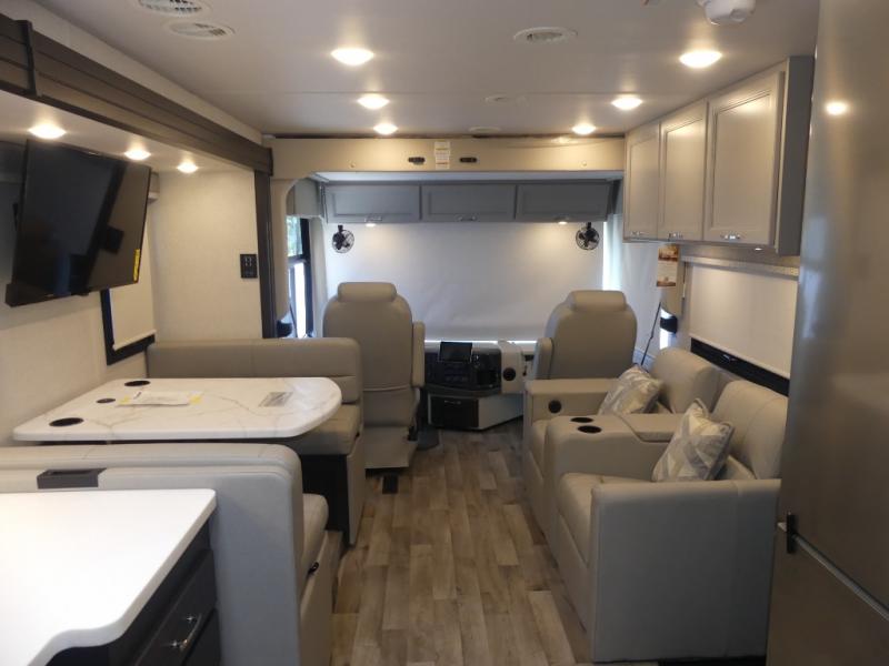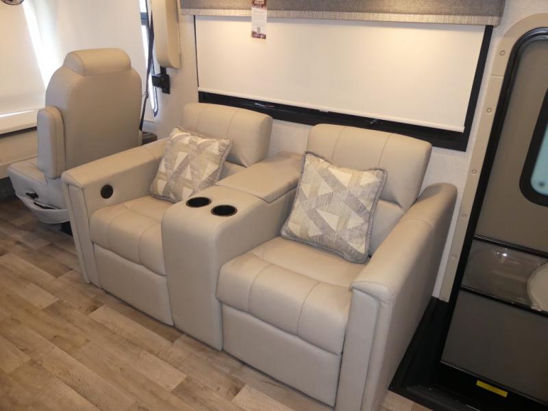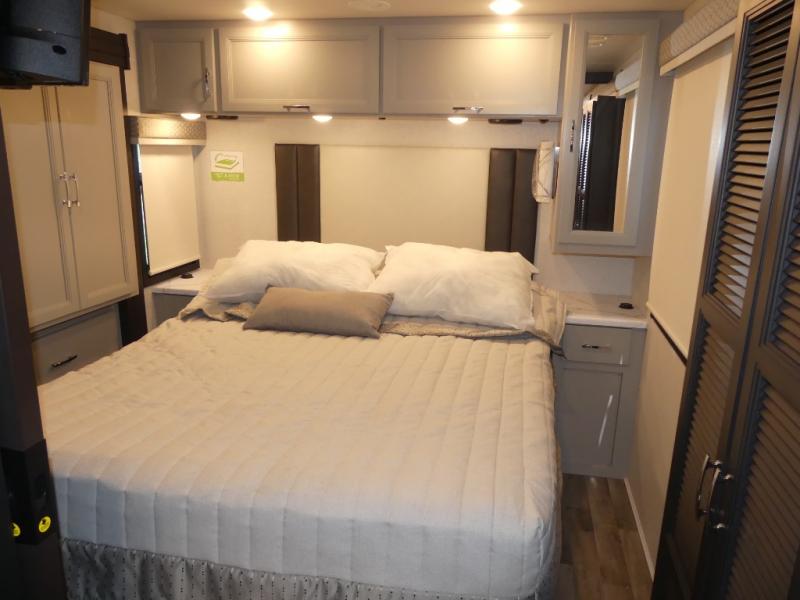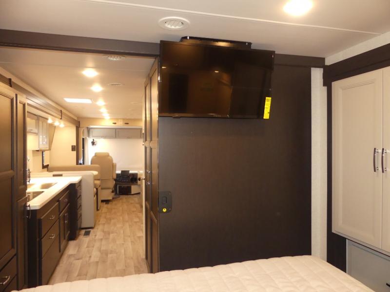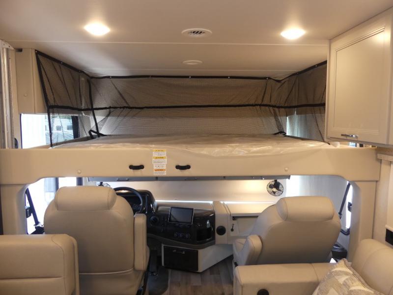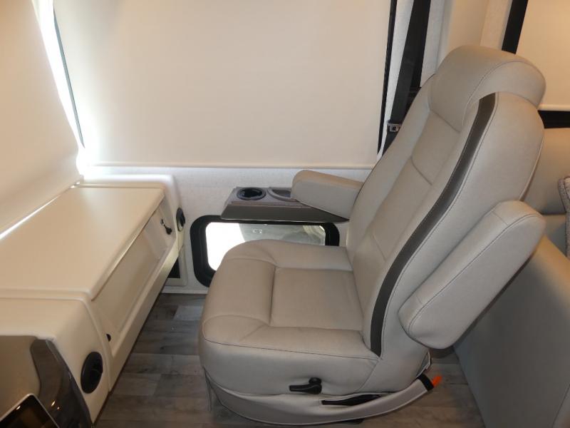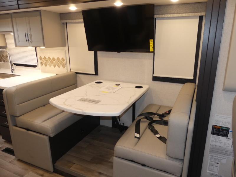 This motorhome is ready to hit the road whenever you are! The 48" x 74" bunk over cab provides sleeping space in addition to the rear private bedroom which has a Tilt-A-View inclining queen bed for a good night's rest, a closet slide, a 32" LED TV to watch your favorite movies in comfort, and an area that has stacking washer and dryer prep next to a closet and pantry. You could even transform the 80" Dream Dinette into extra sleeping space. Freshen up each morning in the full bathroom with the 30" x 36" shower, and enjoy entertainment even outdoors with the outside TV!