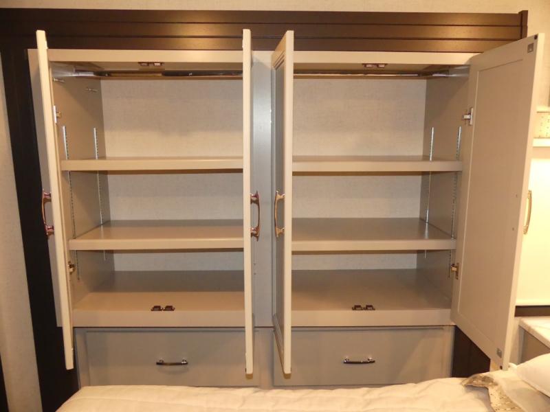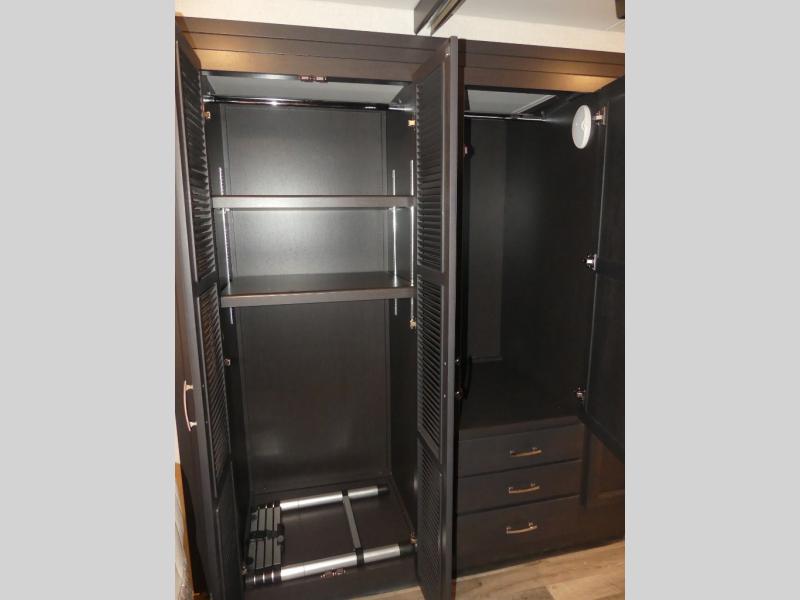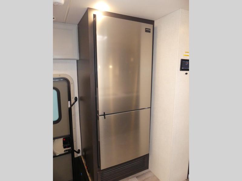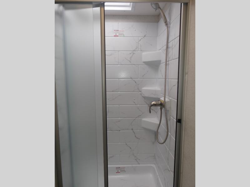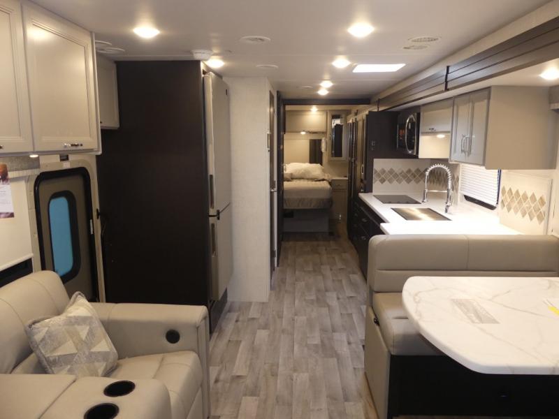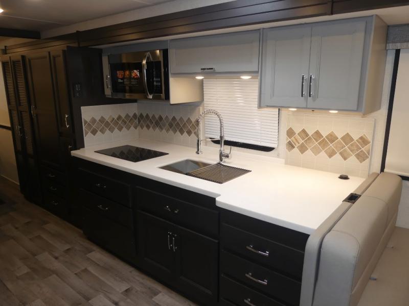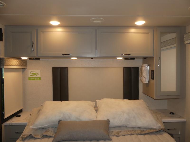 This motorhome is ready to hit the road whenever you are! The 48" x 74" bunk over cab provides sleeping space in addition to the rear private bedroom which has a Tilt-A-View inclining queen bed for a good night's rest, a closet slide, a 32" LED TV to watch your favorite movies in comfort, and an area that has stacking washer and dryer prep next to a closet and pantry. You could even transform the 80" Dream Dinette into extra sleeping space. Freshen up each morning in the full bathroom with the 30" x 36" shower, and enjoy entertainment even outdoors with the outside TV!