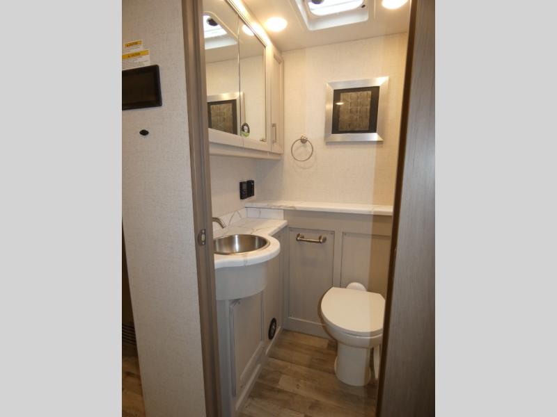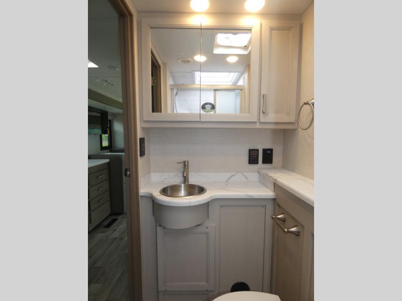 This motorhome is ready to hit the road whenever you are! The 48" x 74" bunk over cab provides sleeping space in addition to the rear private bedroom which has a Tilt-A-View inclining queen bed for a good night's rest, a closet slide, a 32" LED TV to watch your favorite movies in comfort, and an area that has stacking washer and dryer prep next to a closet and pantry. Freshen up each morning in the full bathroom with the 30" x 36" shower, and enjoy entertainment even outdoors with the outside TV!