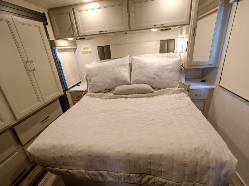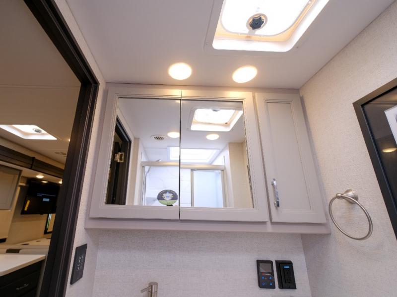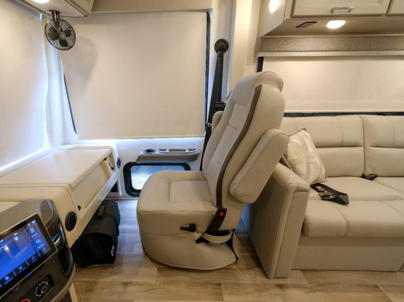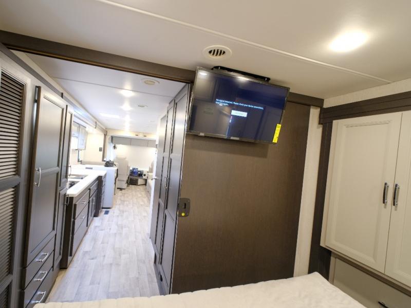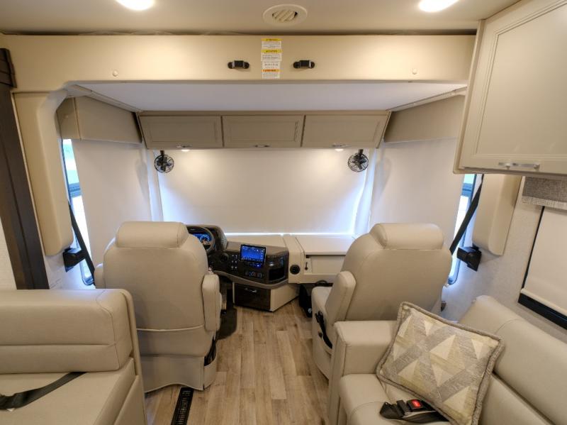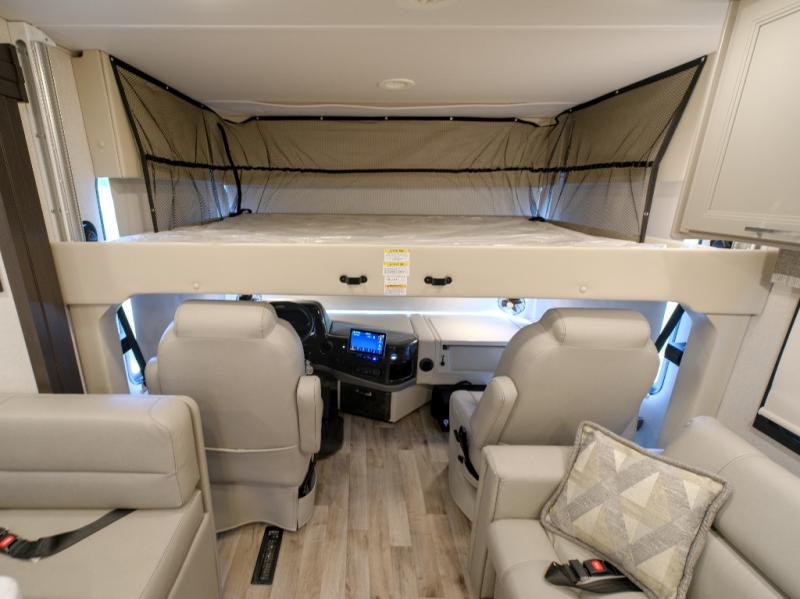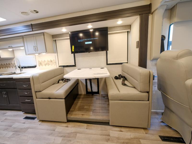 This motorhome is ready to hit the road whenever you are! The 48" x 74" bunk over cab provides sleeping space in addition to the rear private bedroom which has a Tilt-A-View inclining queen bed for a good night's rest, a closet slide, a 32" LED TV to watch your favorite movies in comfort, and an area that has stacking washer and dryer prep next to a closet and pantry. You could even transform the 80" Dream Dinette and 67" jackknife sofa into extra sleeping spaces or switch out the sofa for the optional 67" theater seats. Freshen up each morning in the full bathroom with the 30" x 36" shower, and enjoy entertainment even outdoors with the outside TV!