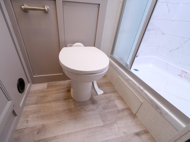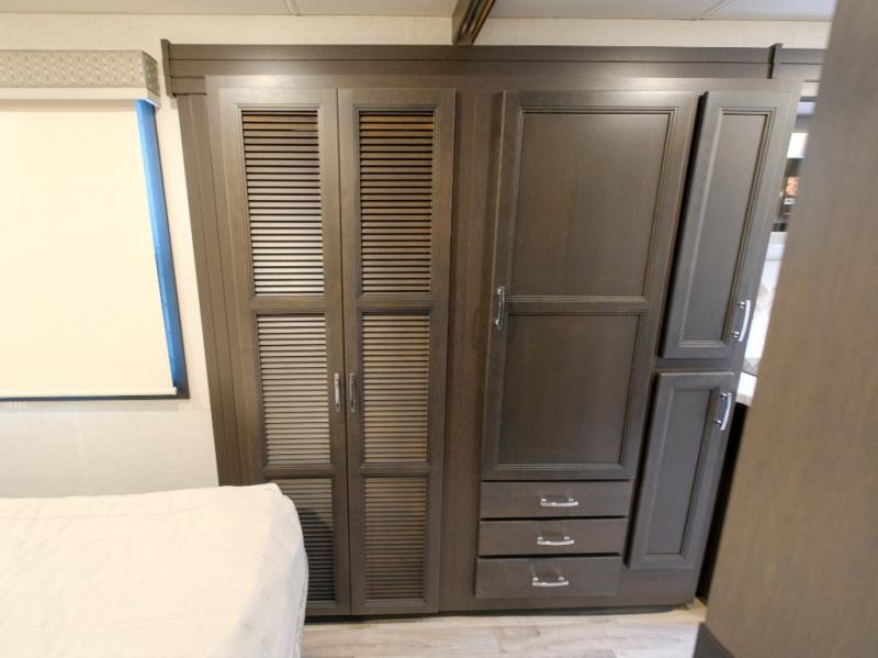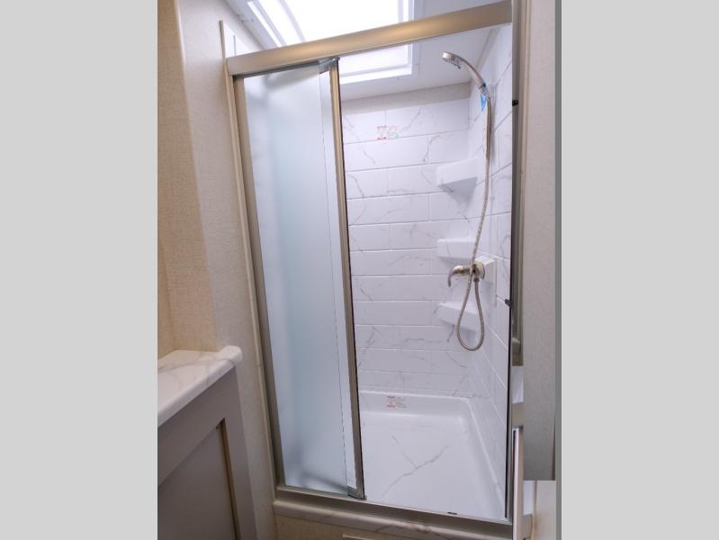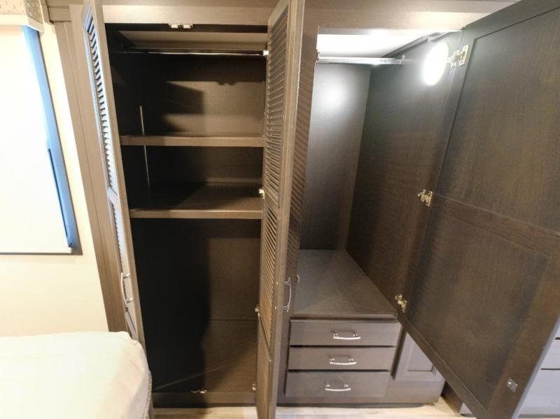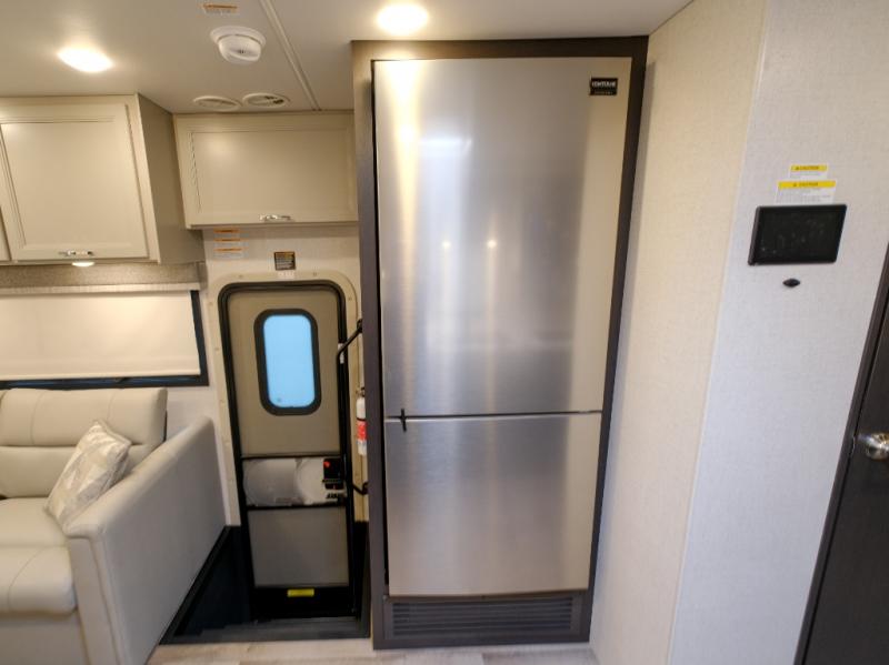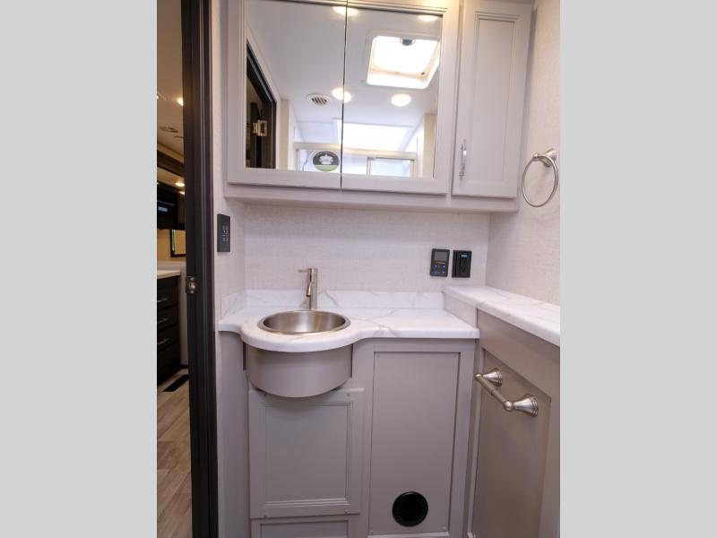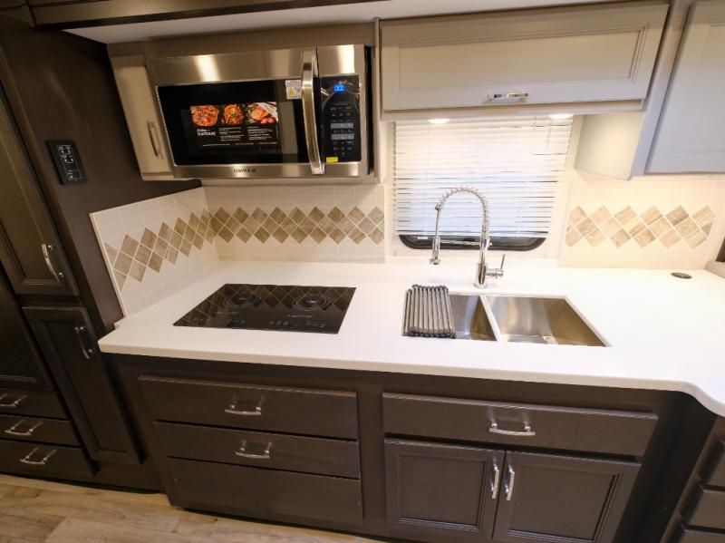 This motorhome is ready to hit the road whenever you are! The 48" x 74" bunk over cab provides sleeping space in addition to the rear private bedroom which has a Tilt-A-View inclining queen bed for a good night's rest, a closet slide, a 32" LED TV to watch your favorite movies in comfort, and an area that has stacking washer and dryer prep next to a closet and pantry. You could even transform the 80" Dream Dinette and 67" jackknife sofa into extra sleeping spaces or switch out the sofa for the optional 67" theater seats. Freshen up each morning in the full bathroom with the 30" x 36" shower, and enjoy entertainment even outdoors with the outside TV!