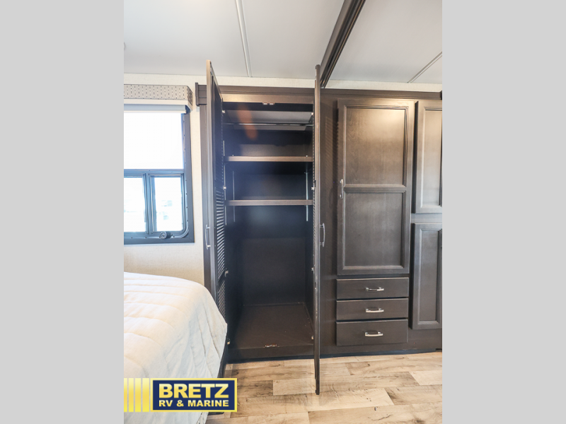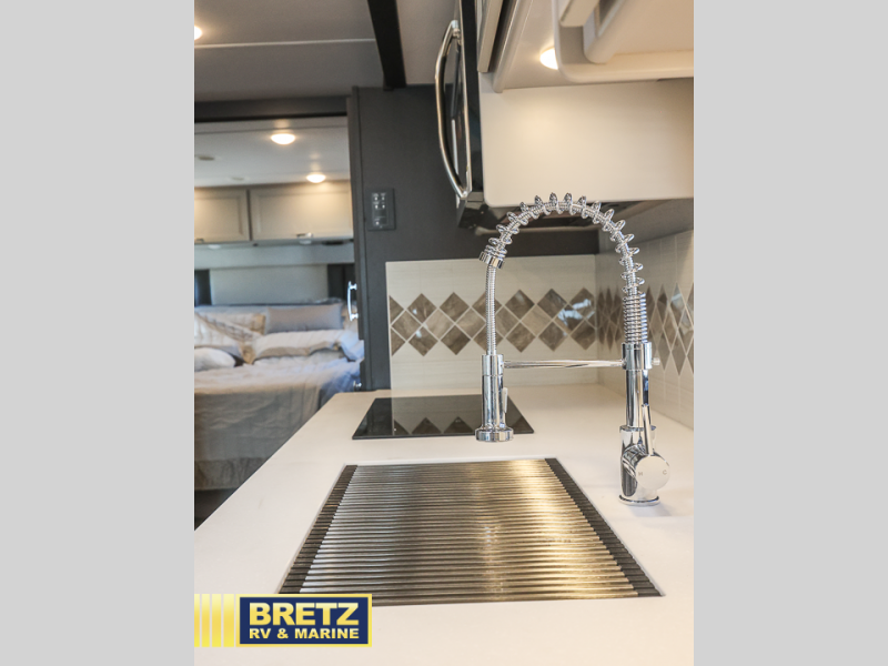 This motorhome is ready to hit the road whenever you are! The 48" x 74" bunk over cab provides sleeping space in addition to the rear private bedroom which has a Tilt-A-View inclining queen bed for a good night's rest, a closet slide, a 32" LED TV to watch your favorite movies in comfort, and an area that has stacking washer and dryer prep next to a closet and pantry. You could even transform the 80" Dream Dinette and 67" jackknife sofa into extra sleeping spaces or switch out the sofa for the optional 67" theater seats. Freshen up each morning in the full bathroom with the 30" x 36" shower, and enjoy entertainment even outdoors with the outside TV!