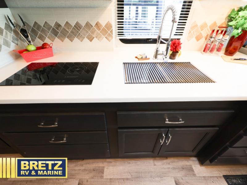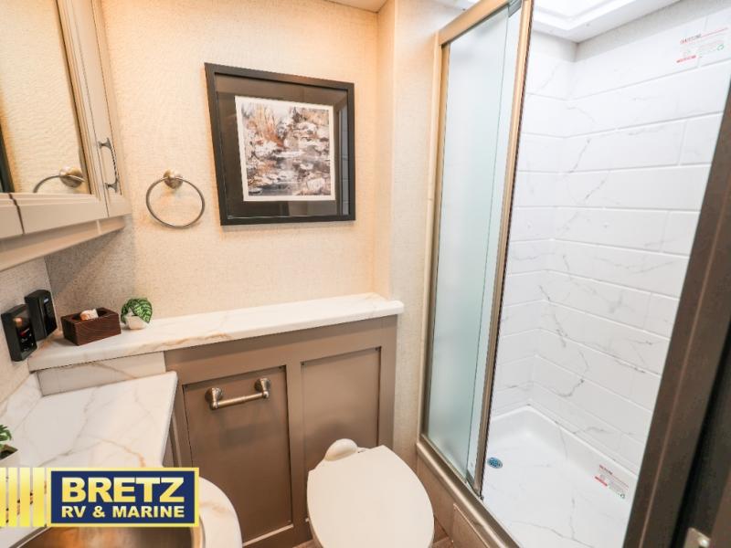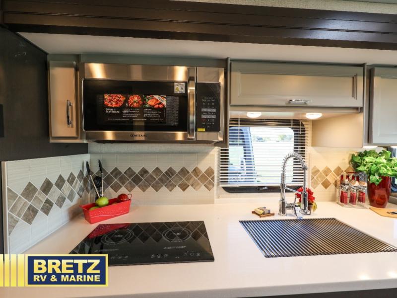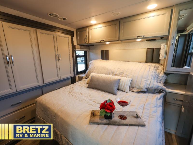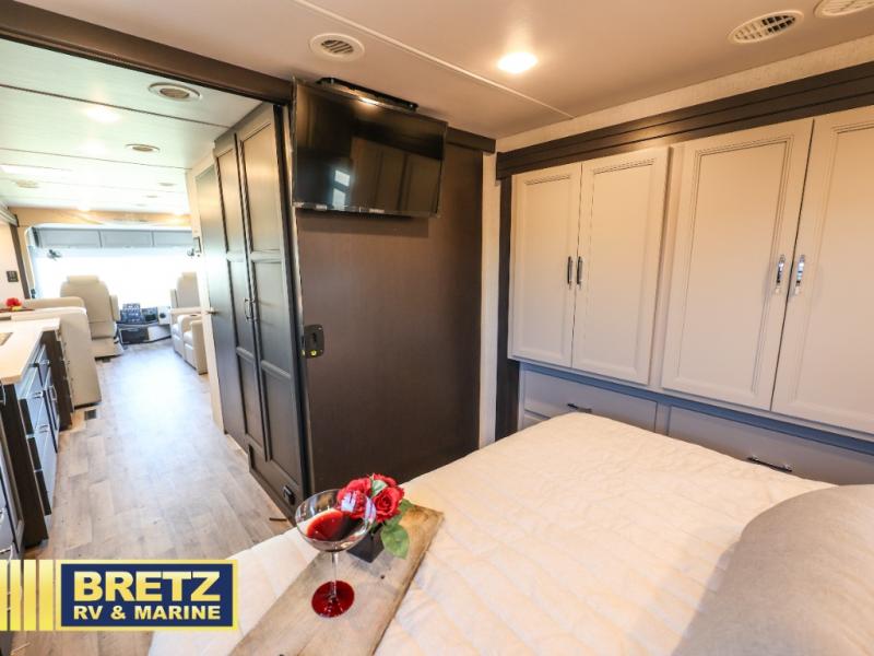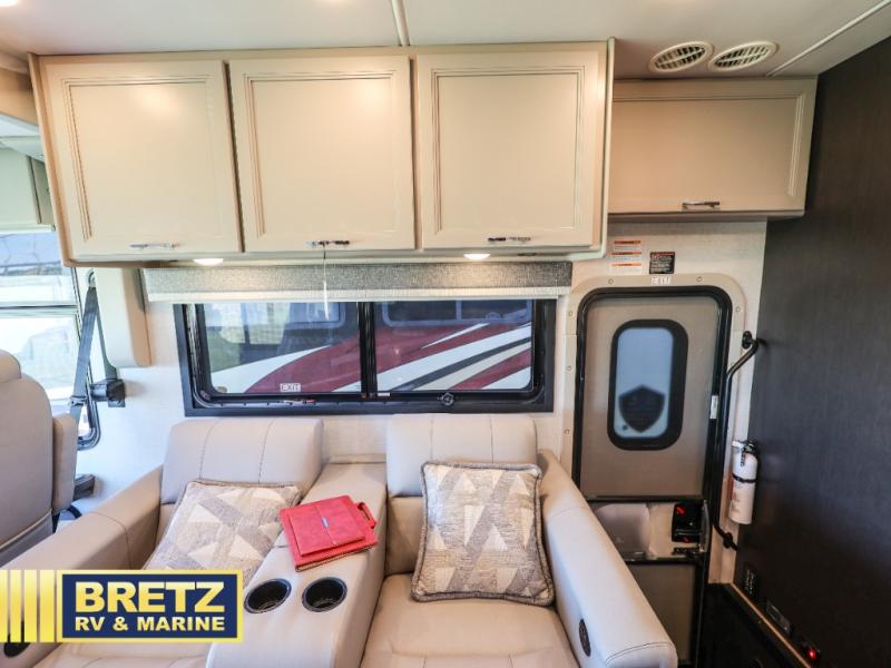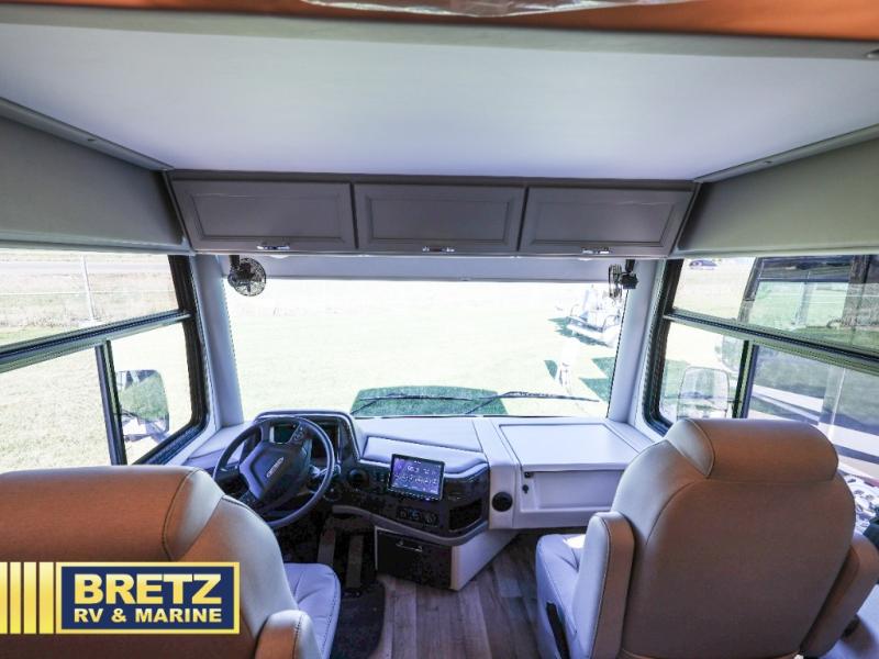 This motorhome is ready to hit the road whenever you are! The 48" x 74" bunk over cab provides sleeping space in addition to the rear private bedroom which has a Tilt-A-View inclining queen bed for a good night's rest, a closet slide, a 32" LED TV to watch your favorite movies in comfort, and an area that has stacking washer and dryer prep next to a closet and pantry. You could even transform the 80" Dream Dinette and 67" jackknife sofa into extra sleeping spaces or switch out the sofa for the optional 67" theater seats. Freshen up each morning in the full bathroom with the 30" x 36" shower, and enjoy entertainment even outdoors with the outside TV!