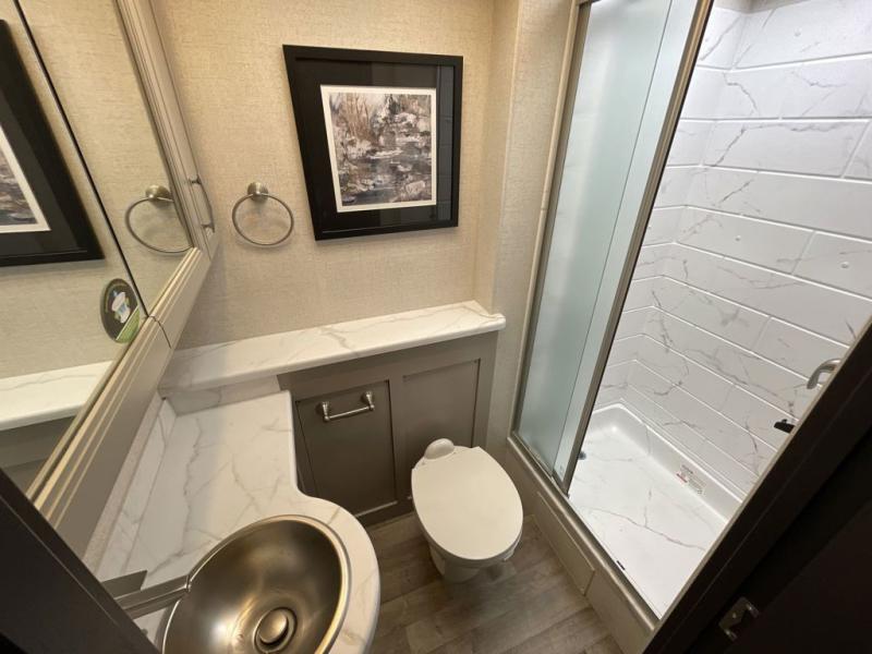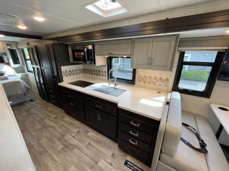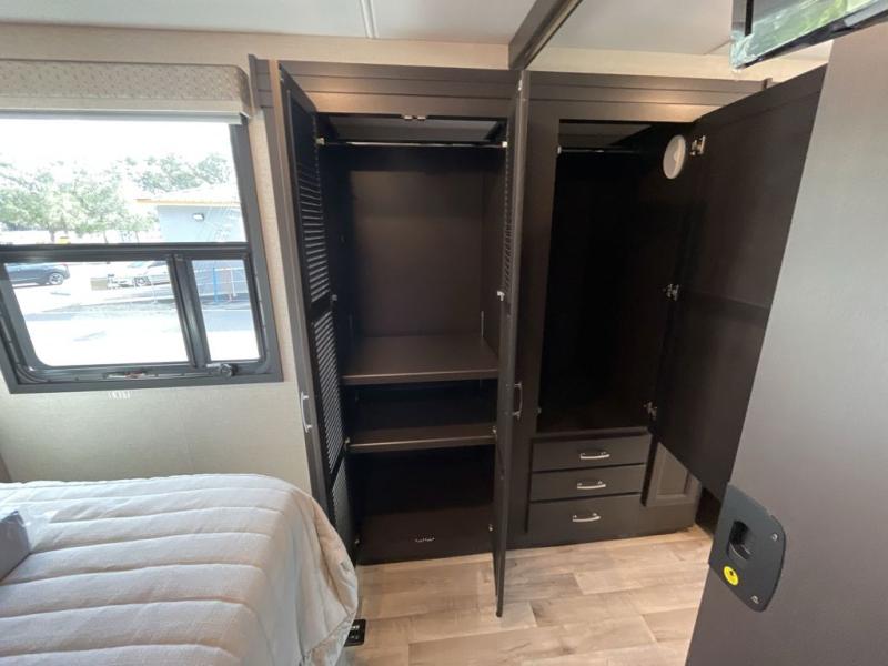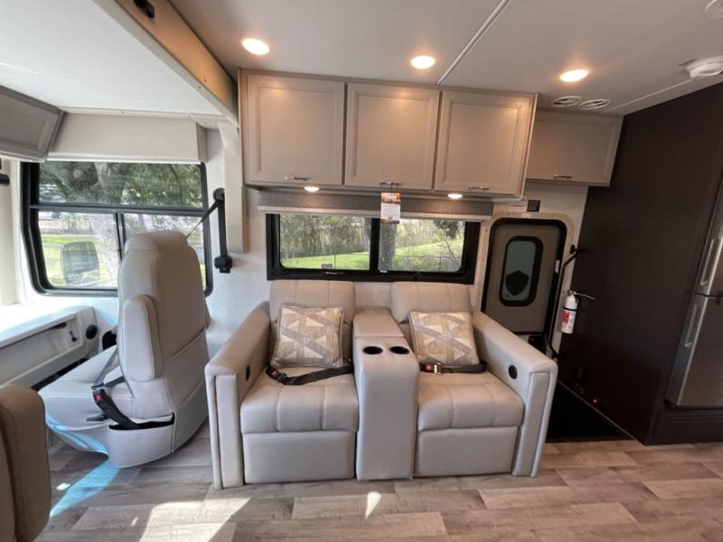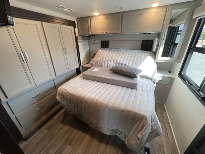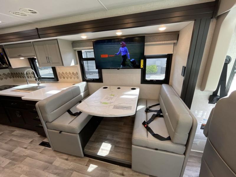 This motorhome is ready to hit the road whenever you are! The 48" x 74" bunk over cab provides sleeping space in addition to the rear private bedroom which has a Tilt-A-View inclining queen bed for a good night's rest, a closet slide, a 32" LED TV to watch your favorite movies in comfort, and an area that has stacking washer and dryer prep next to a closet and pantry. You could even transform the 80" Dream Dinette and 67" jackknife sofa into extra sleeping spaces or switch out the sofa for the optional 67" theater seats. Freshen up each morning in the full bathroom with the 30" x 36" shower, and enjoy entertainment even outdoors with the outside TV!