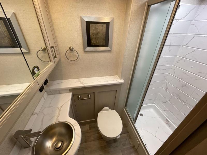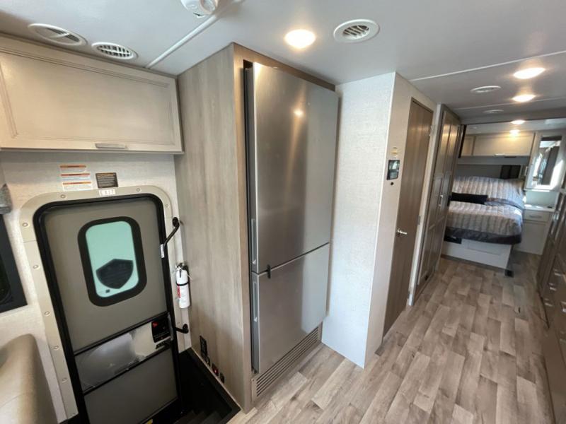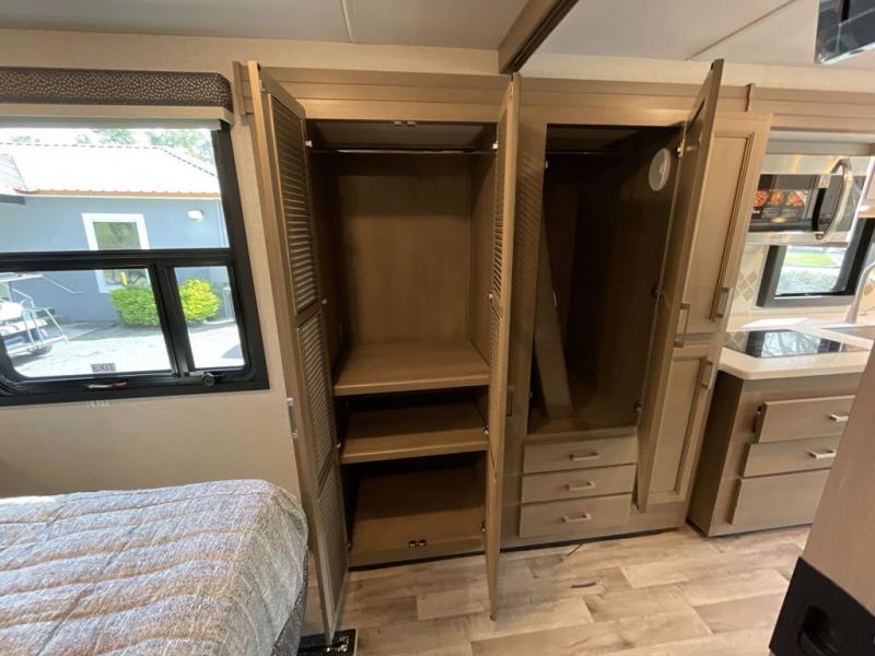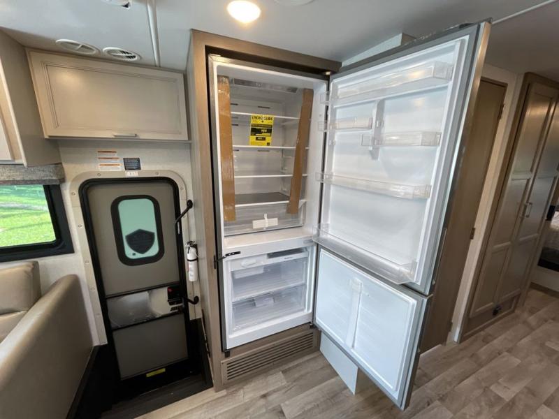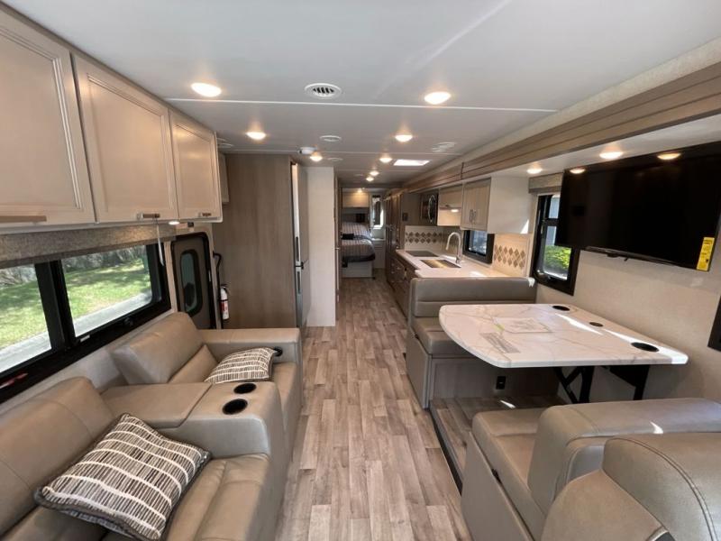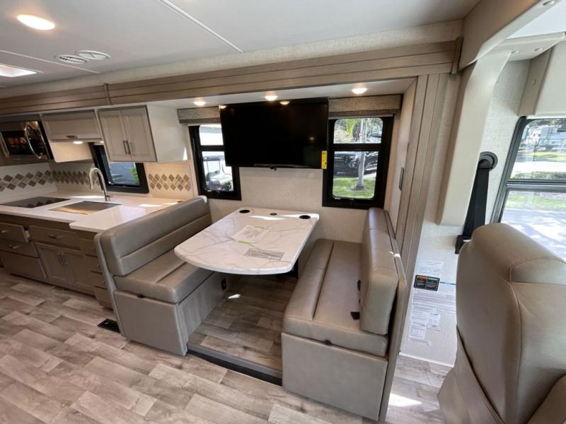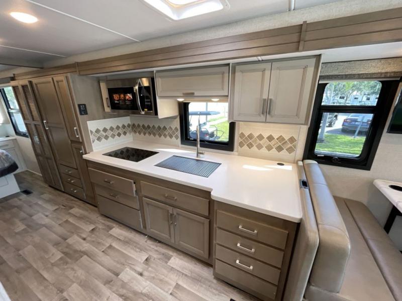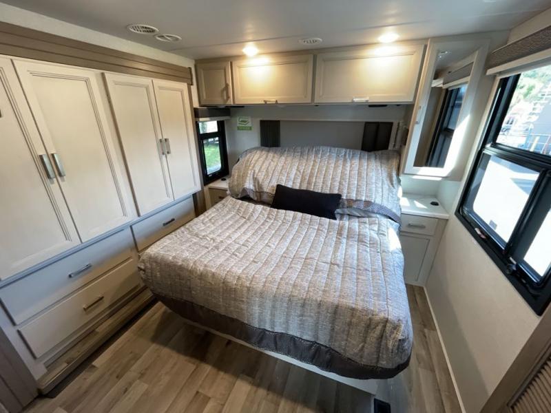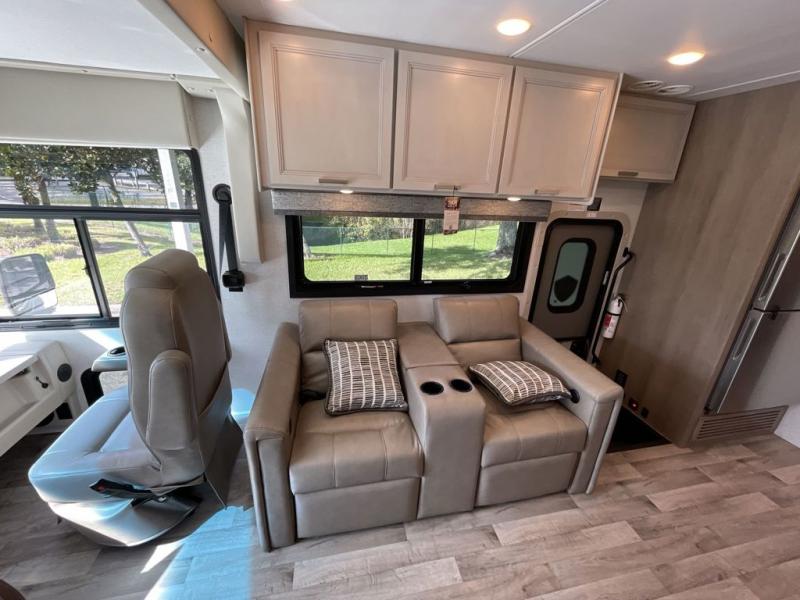 This motorhome is ready to hit the road whenever you are! The 48" x 74" bunk over cab provides sleeping space in addition to the rear private bedroom which has a Tilt-A-View inclining queen bed for a good night's rest, a closet slide, a 32" LED TV to watch your favorite movies in comfort, and an area that has stacking washer and dryer prep next to a closet and pantry. You could even transform the 80" Dream Dinette and 67" jackknife sofa into extra sleeping spaces or switch out the sofa for the optional 67" theater seats. Freshen up each morning in the full bathroom with the 30" x 36" shower, and enjoy entertainment even outdoors with the outside TV!