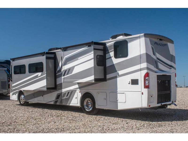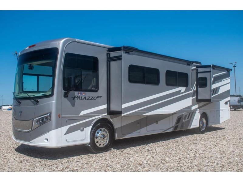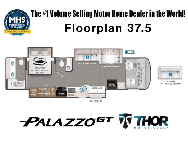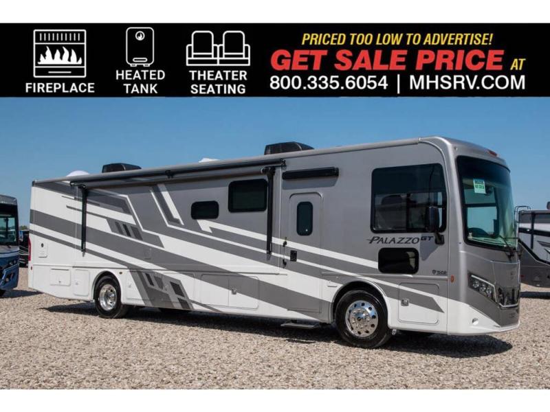 MSRP $334,019. The New 2026 Thor Motor Coach Palazzo GT Diesel Pusher Model 37.5 features a power drop down loft, double sink and a large bathroom, 340 HP Cummins diesel engine with 700 lbs. of torque and a Freightliner XC chassis. Standard features include bluetooth soundbar & large LED TV in the exterior entertainment center, induction cooktop, touchscreen multiplex control system with smartphone app, Winegard ConnecT 2.0 4G/Wi-Fi system, 360 Siphon Vent cap and outside shower. The Palazzo also features a power patio awning with integrated LED lighting, invisible front paint protection & front electric drop-down overhead loft, diesel generator, solid surface counters, power driver's seat, inverter, residential refrigerator, solid surface countertops, (2) ducted roof A/C units, 3-camera monitoring system, one piece windshield, fiberglass storage compartments, fully automatic hydraulic leveling system, automatic entry step and much more. Options include upgraded cabinetry, theater seats and stealth package. **Unit Not California CARB Compliant and Cannot be Registered in California**. Shop a huge selection of diesel pusher motorhomes all at 1 location! Choose from Thor Motor Coach Palazzo – Riviera – Aria – Fleetwood Discovery – Frontier – Holiday Rambler Endeavor – Nautica – Entegra Coach Reatta – Aspire and more. We also buy and sell quality pre-owned models such Newmar Mountain Aire – Dutch Star – New Aire – Ventana – Kountry Star – Northern Star - Allegro Bus – Phaeton – Allegro Red – Byway – Allegro Breeze – Winnebago Journey – Forza – Coachmen Sportscoach – Thor Venetian – Tuscany and much more. Visit MHSRV.com for our complete line-up and the sale prices that have made us the #1 volume selling motor home dealership in the world 12 years in a row! For additional details on this unit and our entire inventory including brochures, window sticker, videos, photos, reviews & testimonials as well as additional information about Motor Home Specialist and our manufacturers please visit us at MHSRV.com or call 800-335-6054. At Motor Home Specialist, we DO NOT charge any prep or orientation fees like you will find at other dealerships. All sale prices include a 200-point inspection, interior & exterior wash, detail service and a fully automated high-pressure rain booth test and coach wash that is a standout service unlike that of any other in the industry. You will also receive a thorough coach orientation with an MHSRV technician, a night stay in our delivery park featuring landscaped and covered pads with full hook-ups and much more! Read Thousands upon Thousands of 5-Star Reviews at MHSRV.com and See What They Had to Say About Their Experience at Motor Home Specialist. WHY PAY MORE? WHY SETTLE FOR LESS?