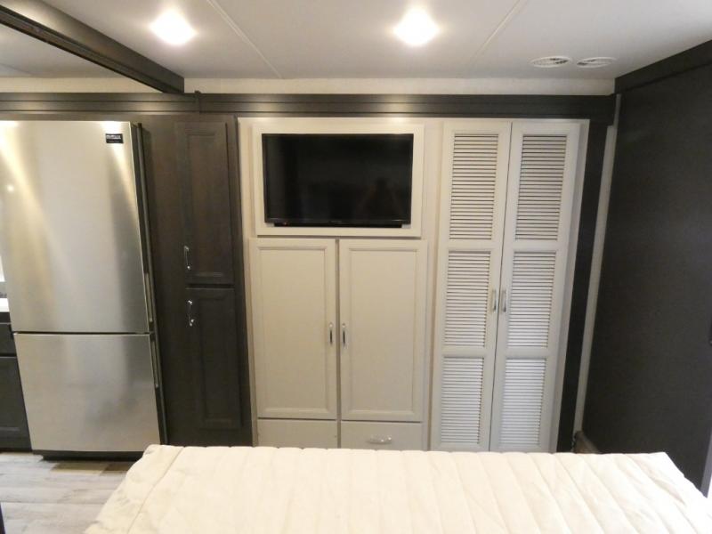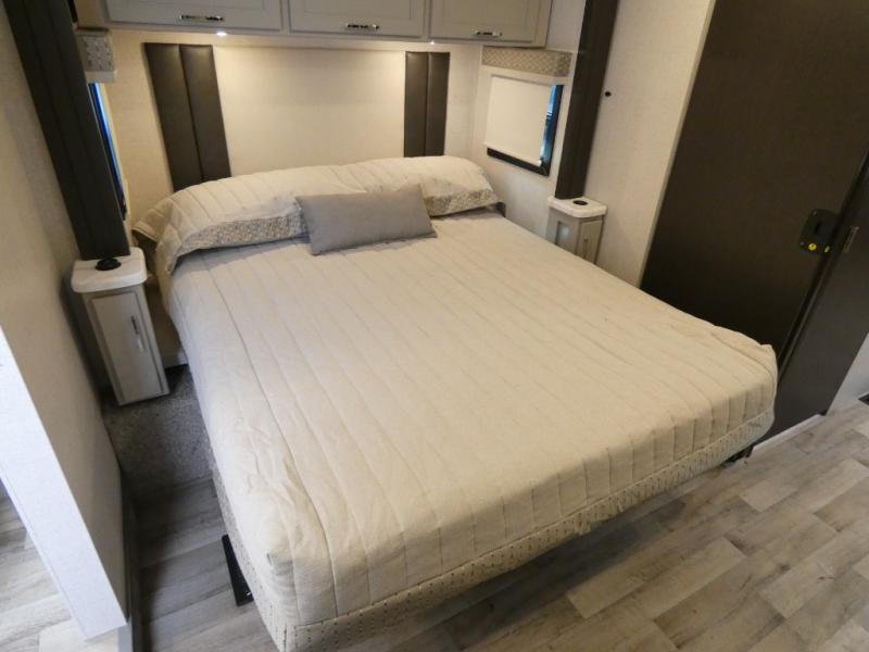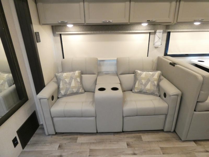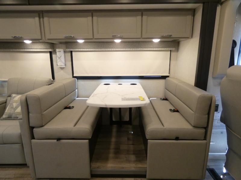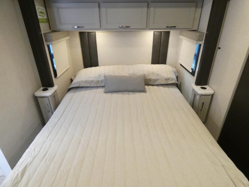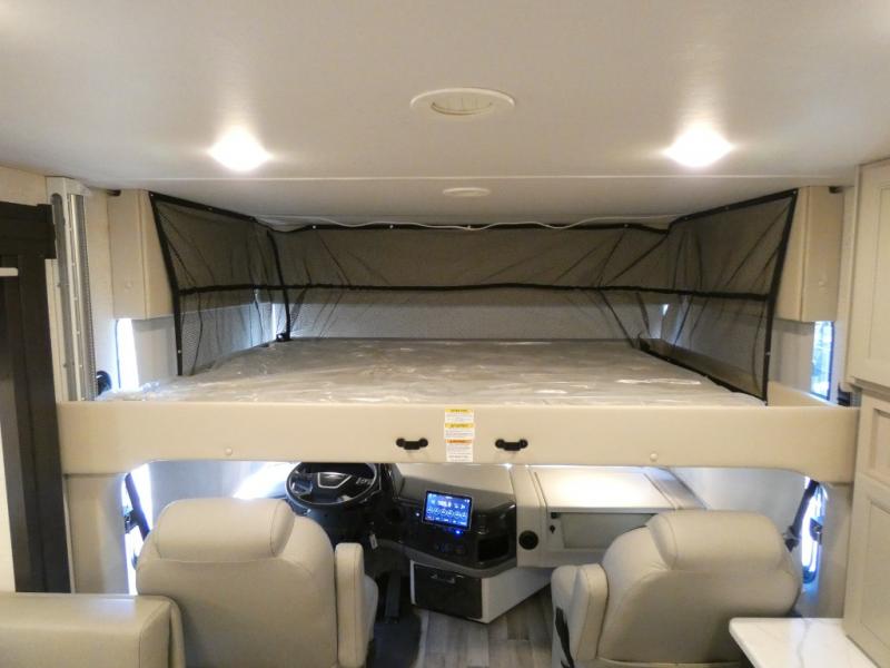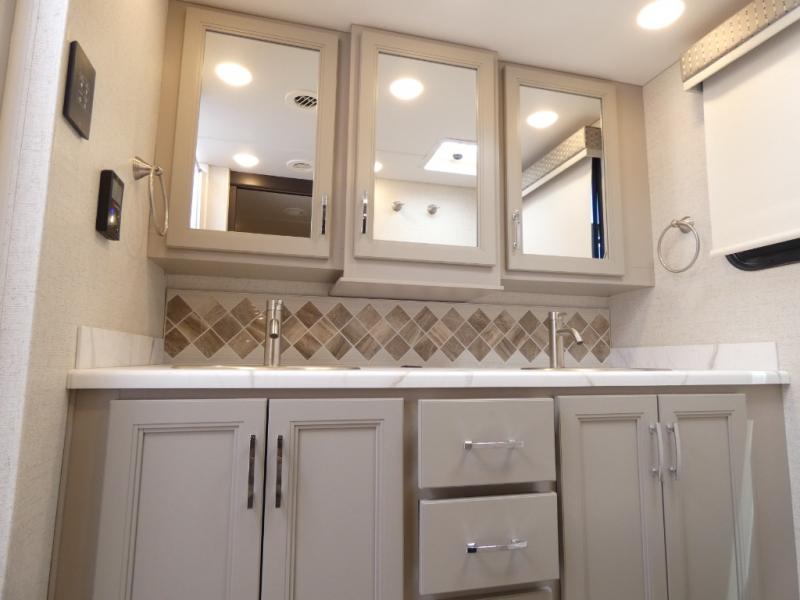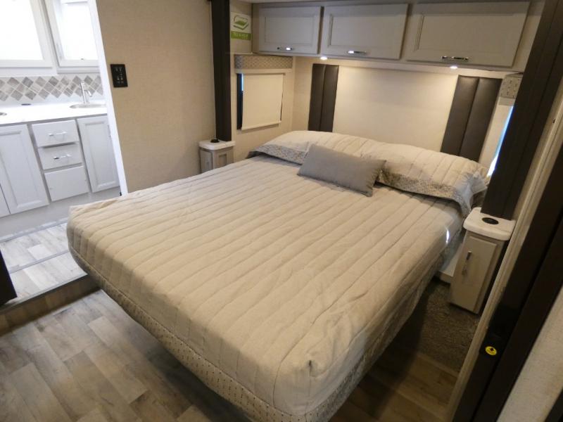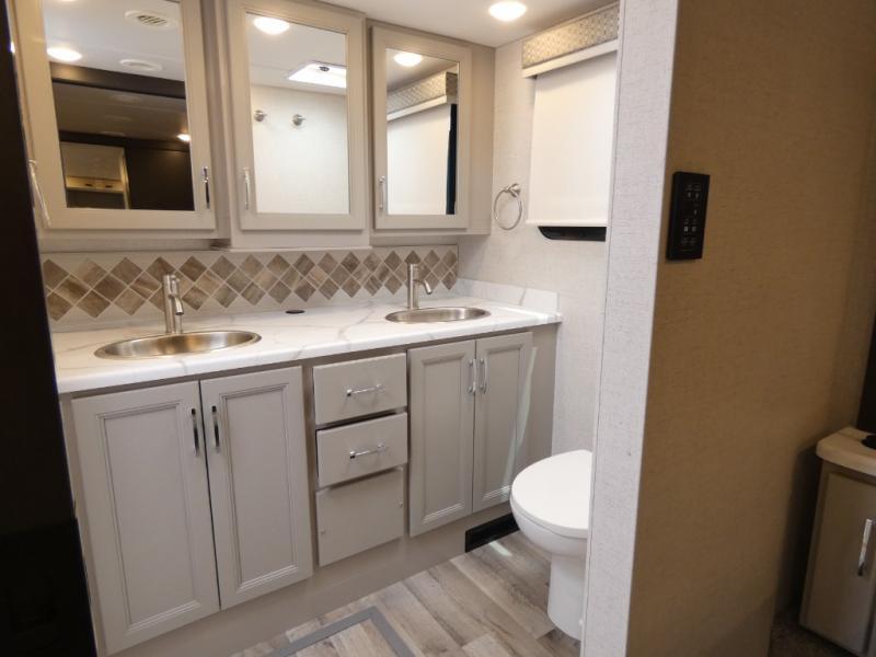 It's a clean decision to take this motorhome on your next vacation with a bath and a half! The 48" x 74" bunk over cab provides sleeping space in addition to the private bedroom which has a Tilt-A-View inclining queen bed slide for a good night's rest, a closet, a 32" LED TV to watch your favorite movies in comfort, and an area that has stacking washer and dryer prep next to a closet and pantry. Plus, you have access to the full rear bathroom which has a dual sink vanity and a 52" x 30" shower with a seat.