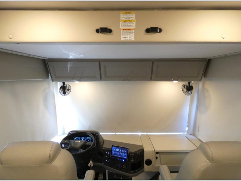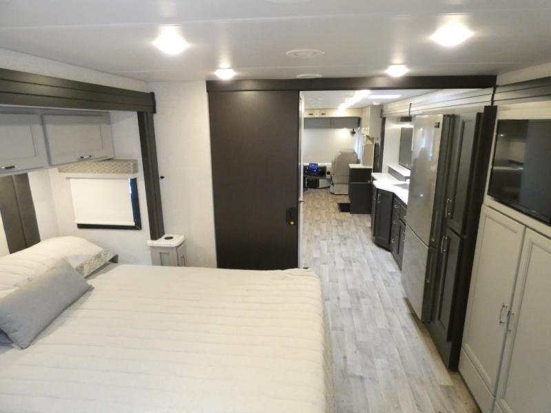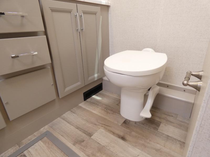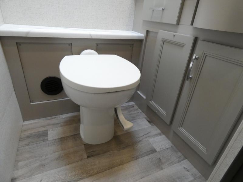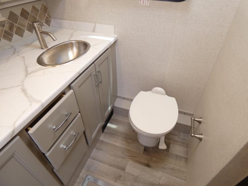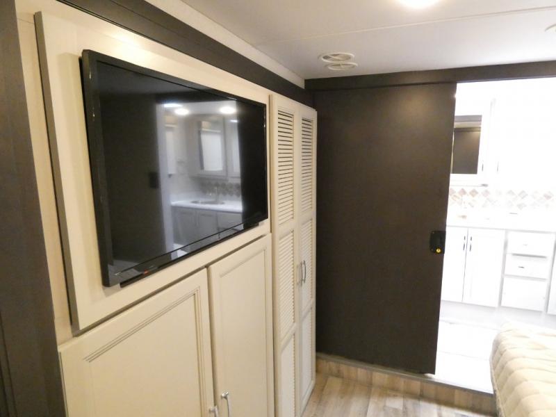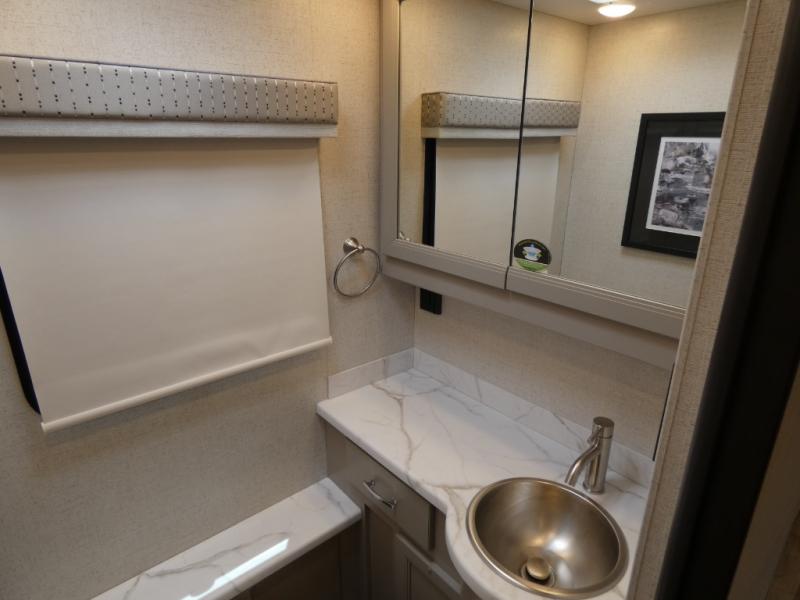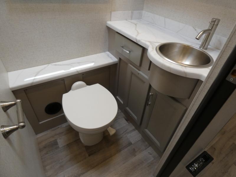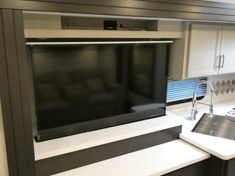 It's a clean decision to take this motorhome on your next vacation with a bath and a half! The 48" x 74" bunk over cab provides sleeping space in addition to the private bedroom which has a Tilt-A-View inclining queen bed slide for a good night's rest, a closet, a 32" LED TV to watch your favorite movies in comfort, and an area that has stacking washer and dryer prep next to a closet and pantry. Plus, you have access to the full rear bathroom which has a dual sink vanity and a 52" x 30" shower with a seat.