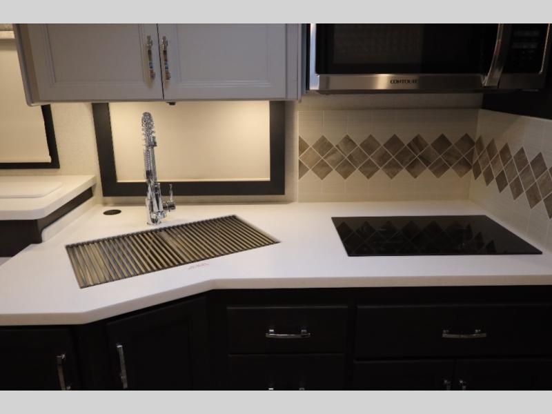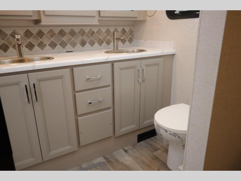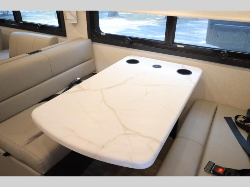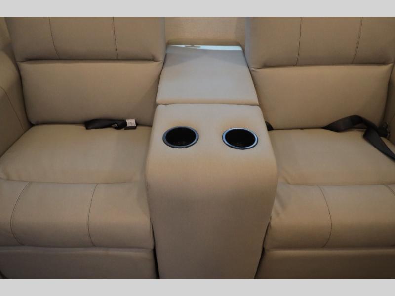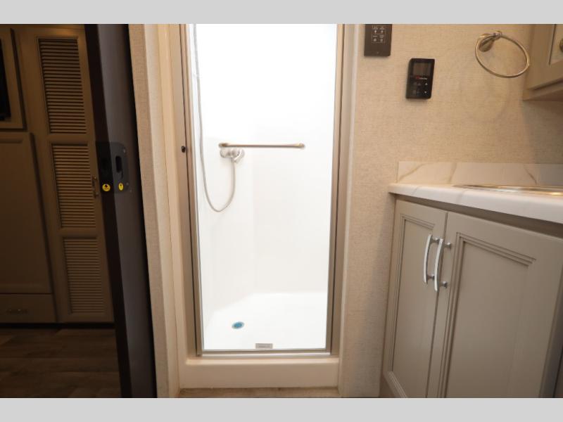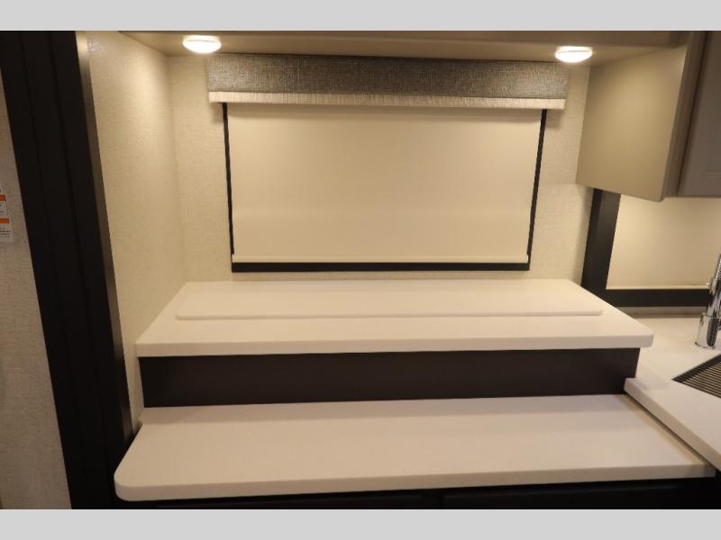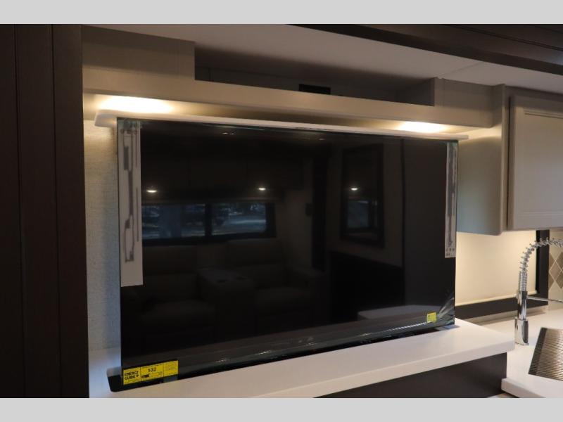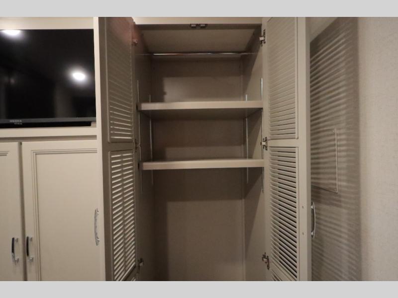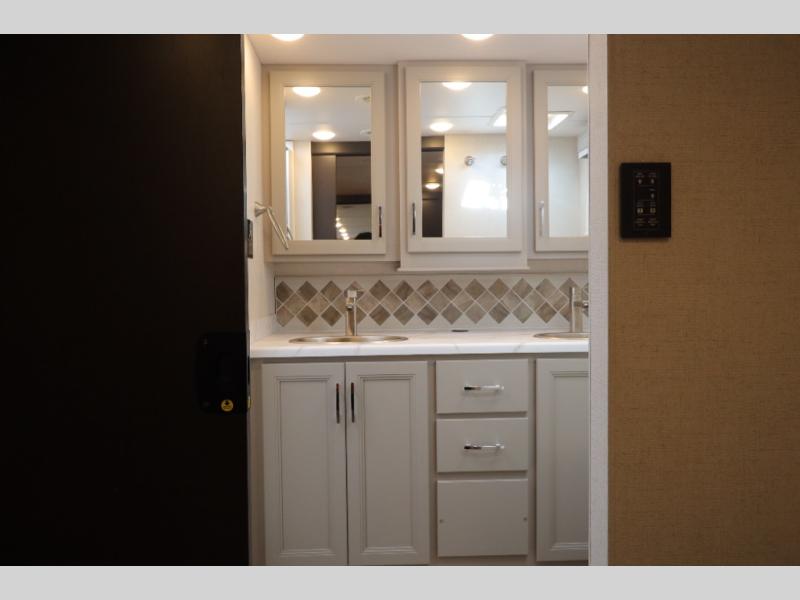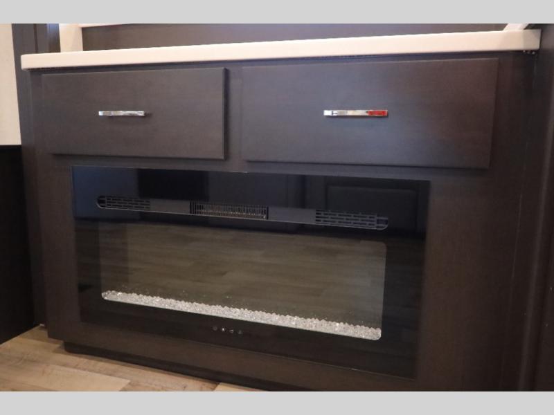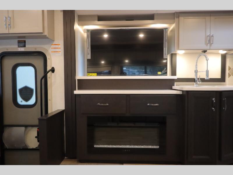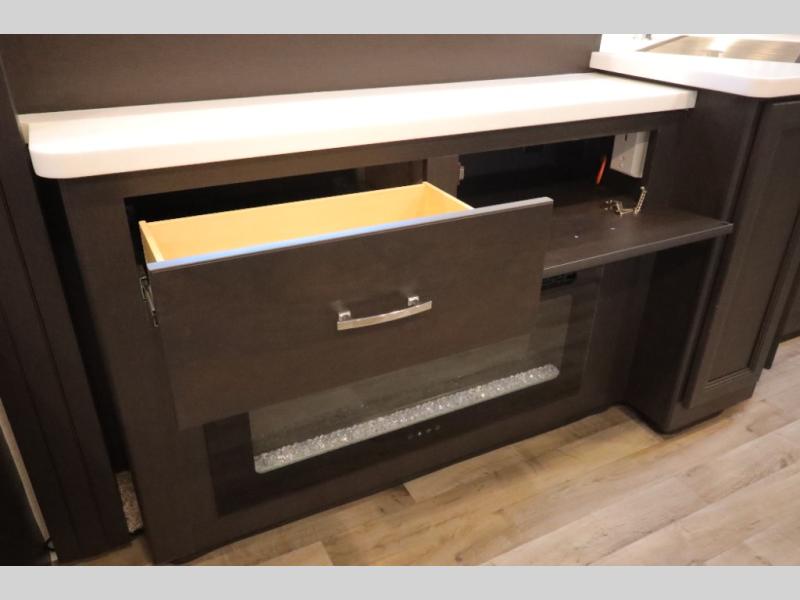 It's a clean decision to take this motorhome on your next vacation with a bath and a half! The 48" x 74" bunk over cab provides sleeping space in addition to the private bedroom which has a Tilt-A-View inclining queen bed slide for a good night's rest, a closet, a 32" LED TV to watch your favorite movies in comfort, and an area that has stacking washer and dryer prep next to a closet and pantry. Plus, you have access to the full rear bathroom which has a dual sink vanity and a 52" x 30" shower with a seat. You could even transform the 72" Dream Dinette and 74" jackknife sofa into extra sleeping spaces or switch out the sofa for optional 74" theater seating all located in front of the fireplace. Enjoy entertainment even outdoors with the outside TV.