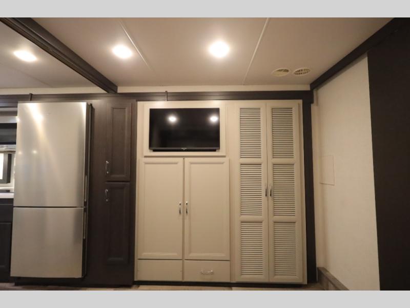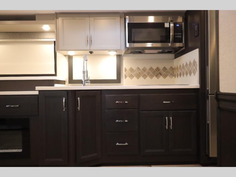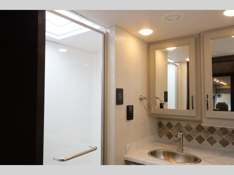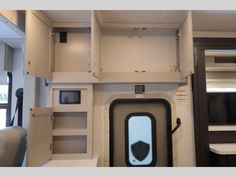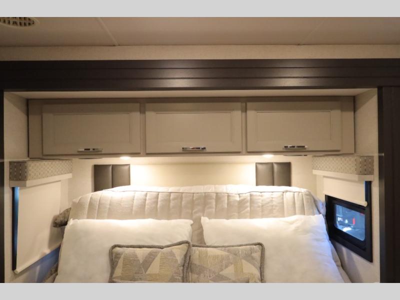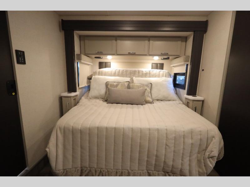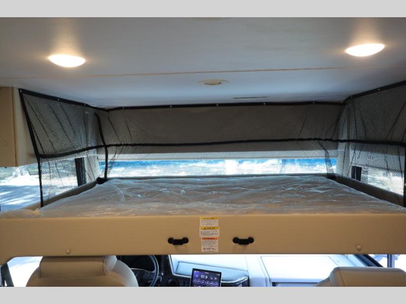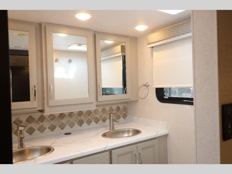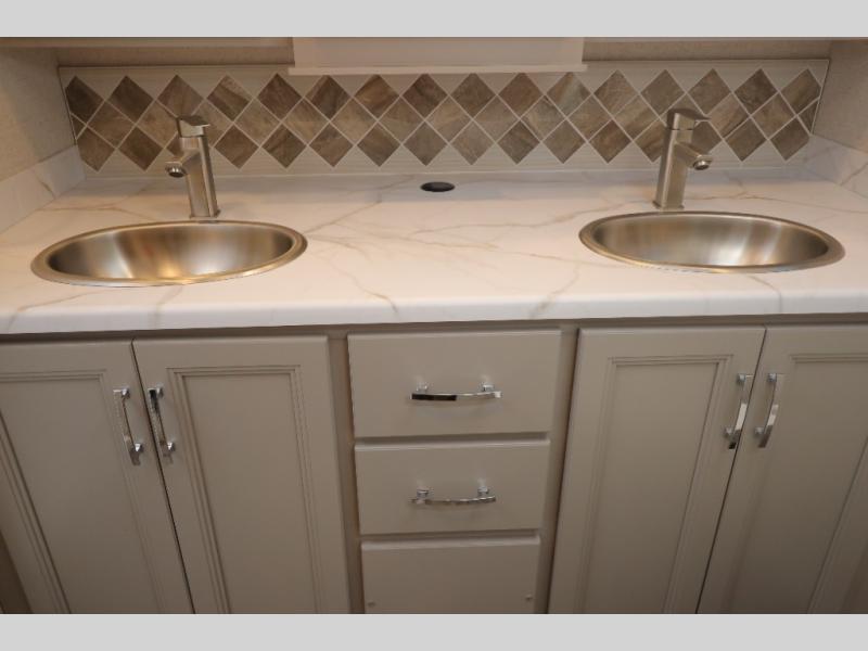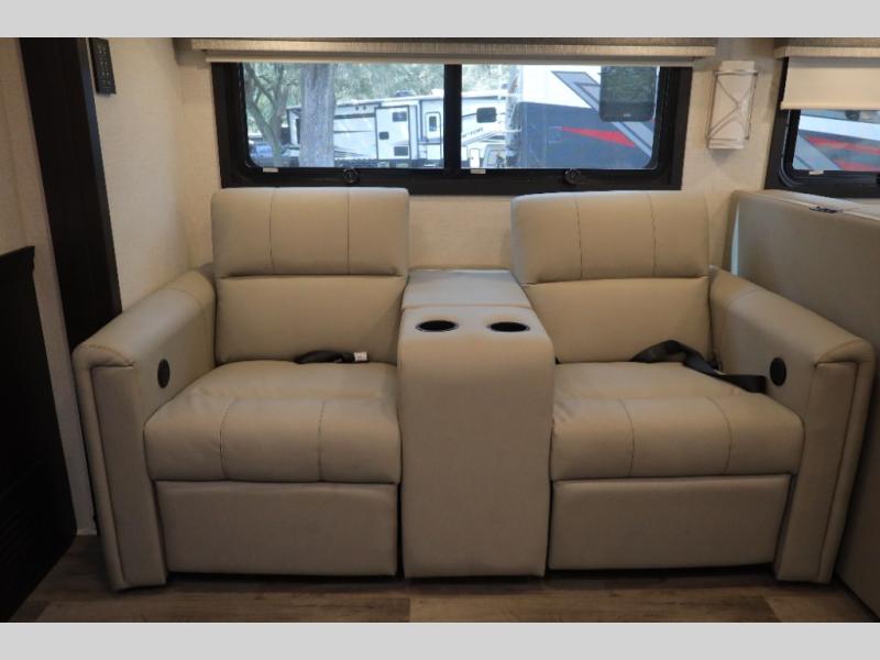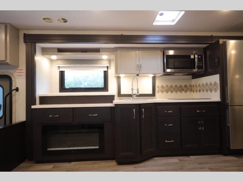 It's a clean decision to take this motorhome on your next vacation with a bath and a half! The 48" x 74" bunk over cab provides sleeping space in addition to the private bedroom which has a Tilt-A-View inclining queen bed slide for a good night's rest, a closet, a 32" LED TV to watch your favorite movies in comfort, and an area that has stacking washer and dryer prep next to a closet and pantry. Plus, you have access to the full rear bathroom which has a dual sink vanity and a 52" x 30" shower with a seat. You could even transform the 72" Dream Dinette and 74" jackknife sofa into extra sleeping spaces or switch out the sofa for optional 74" theater seating all located in front of the fireplace. Enjoy entertainment even outdoors with the outside TV.