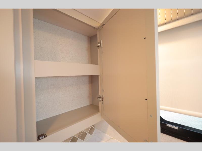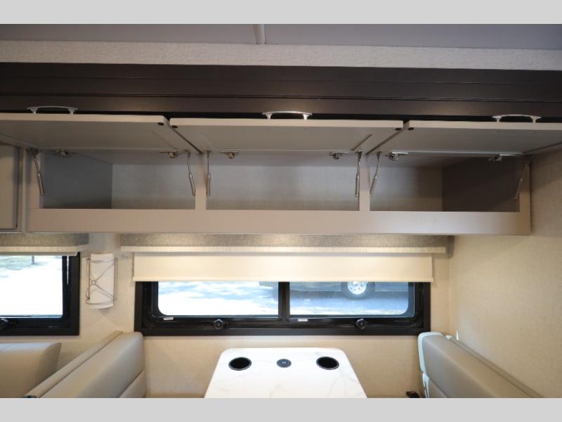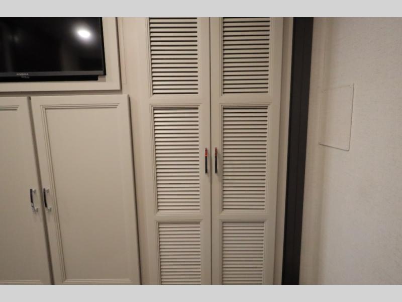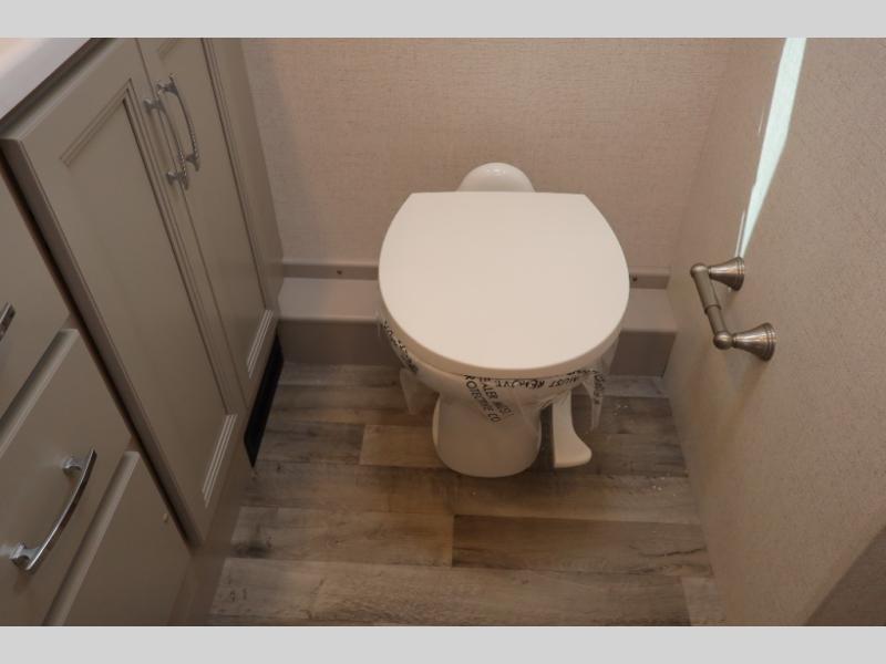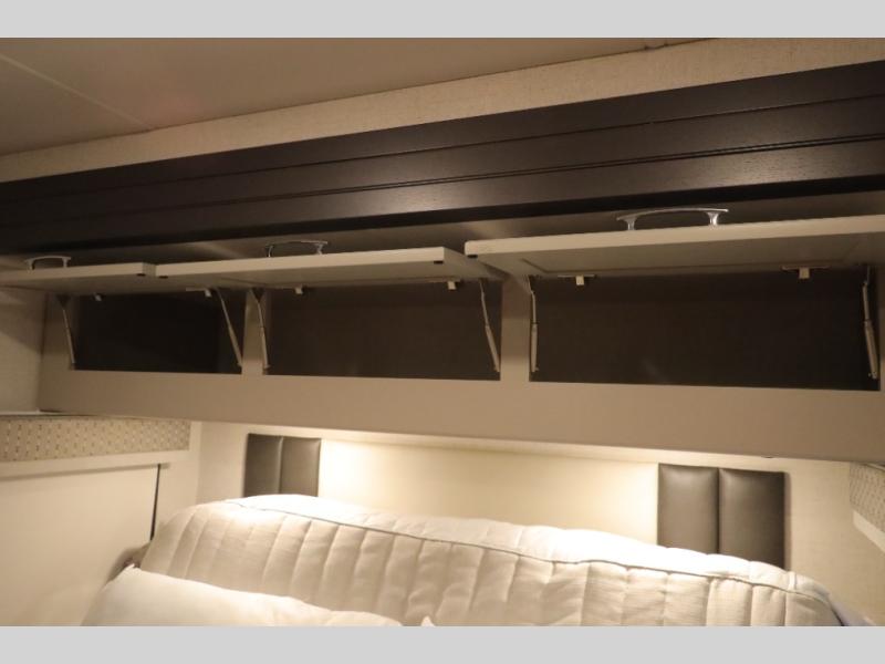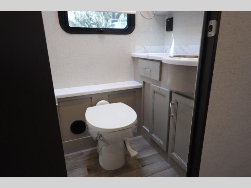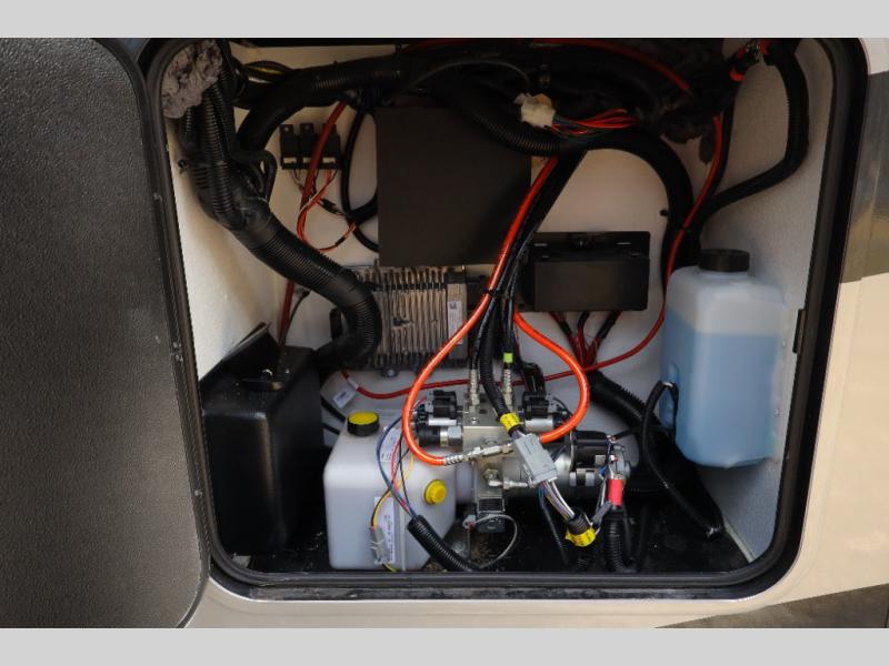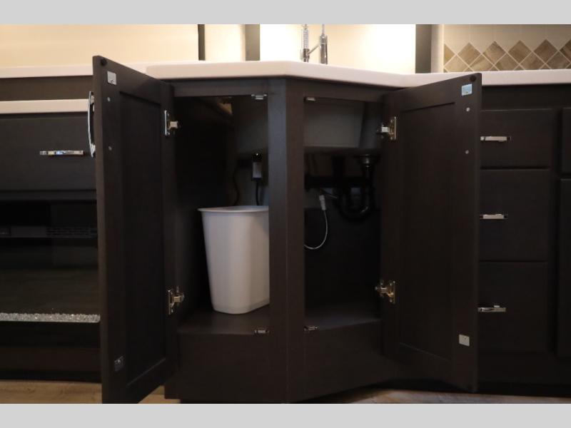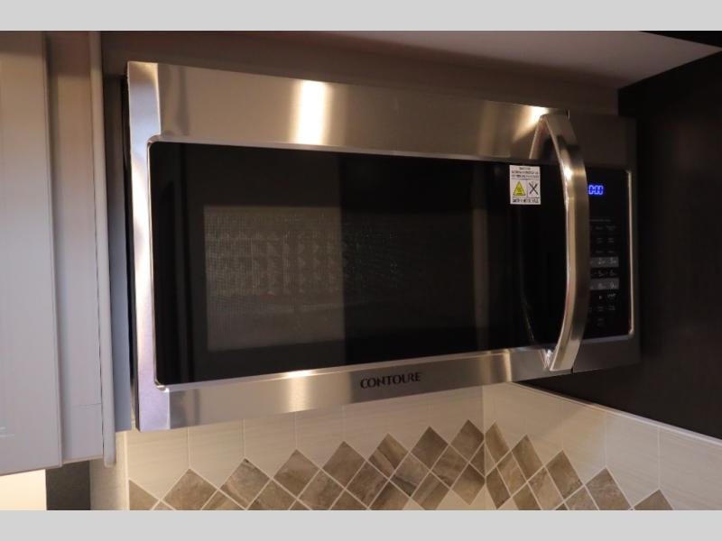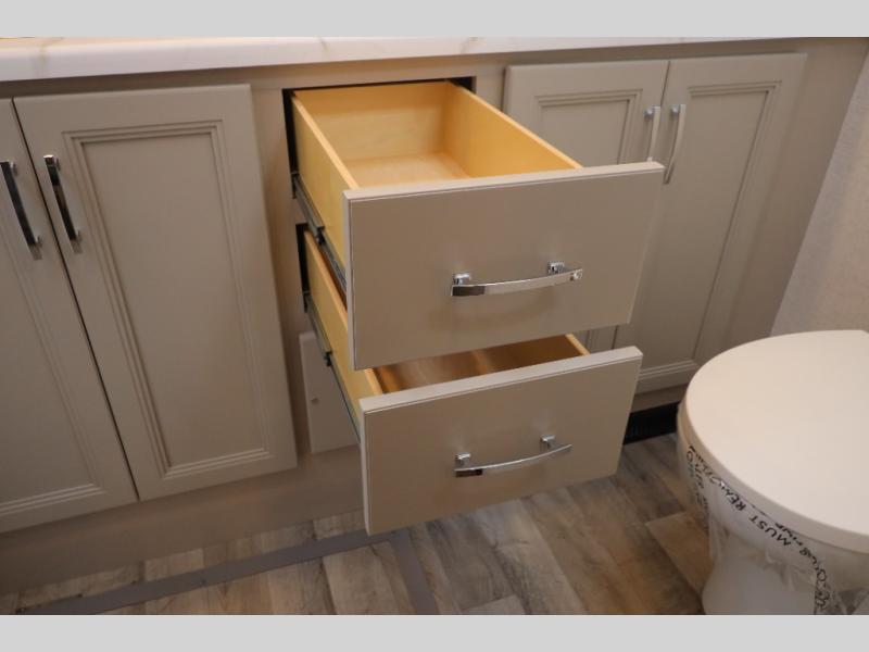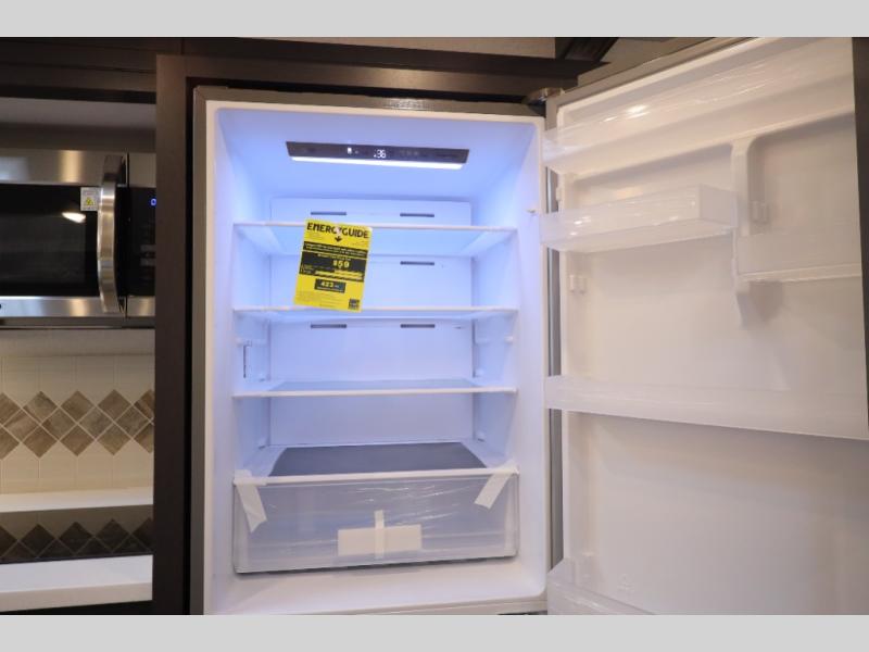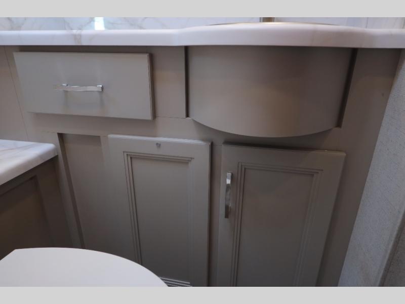 It's a clean decision to take this motorhome on your next vacation with a bath and a half! The 48" x 74" bunk over cab provides sleeping space in addition to the private bedroom which has a Tilt-A-View inclining queen bed slide for a good night's rest, a closet, a 32" LED TV to watch your favorite movies in comfort, and an area that has stacking washer and dryer prep next to a closet and pantry. Plus, you have access to the full rear bathroom which has a dual sink vanity and a 52" x 30" shower with a seat. You could even transform the 72" Dream Dinette and 74" jackknife sofa into extra sleeping spaces or switch out the sofa for optional 74" theater seating all located in front of the fireplace. Enjoy entertainment even outdoors with the outside TV.