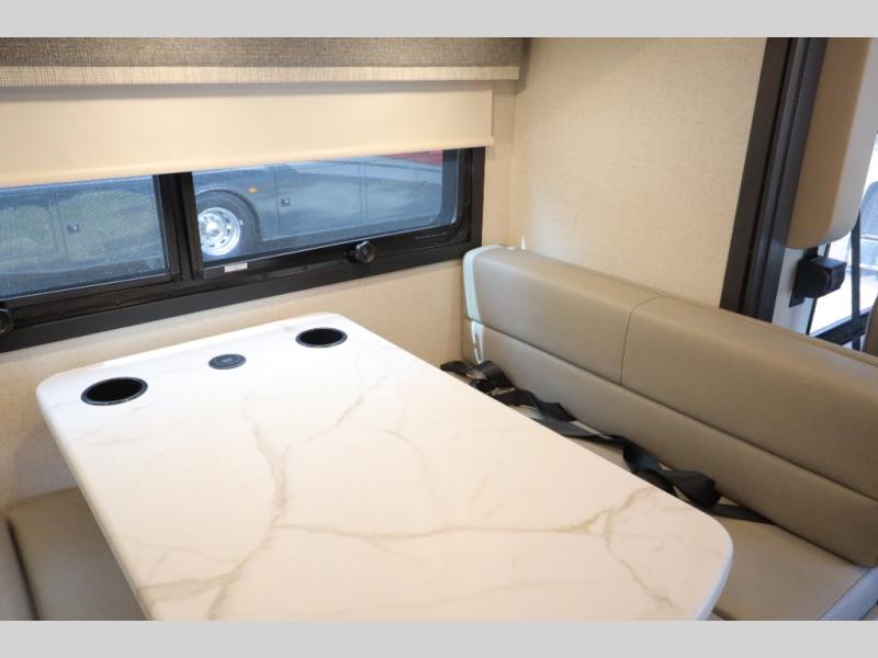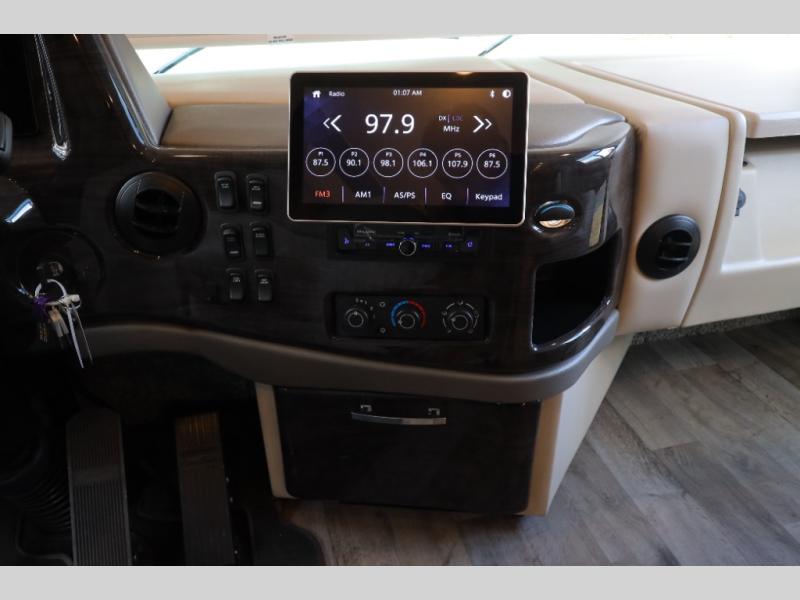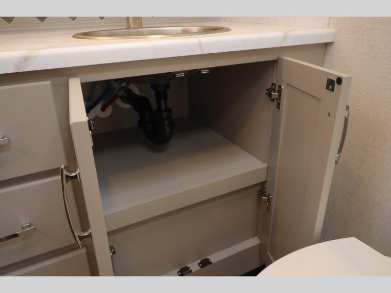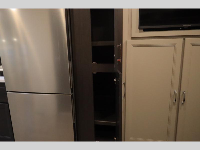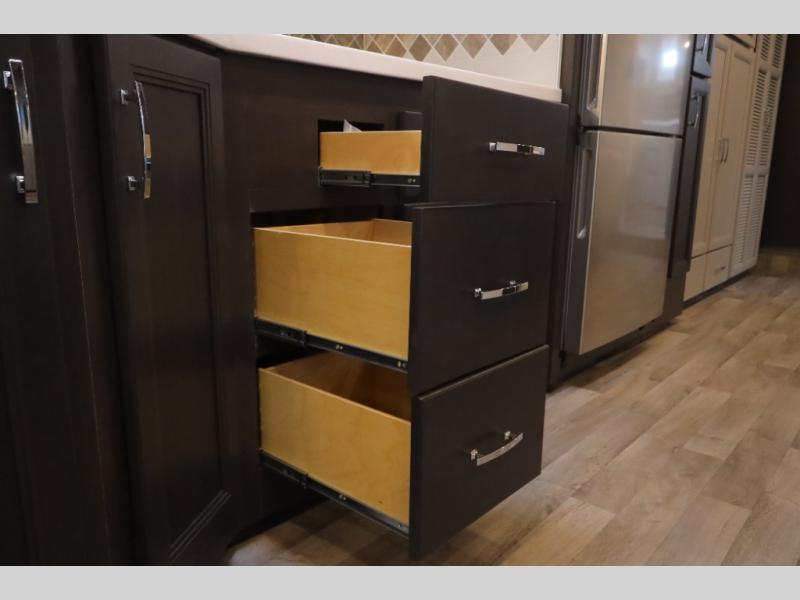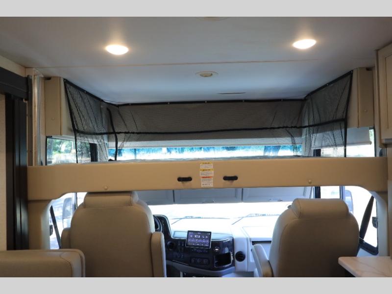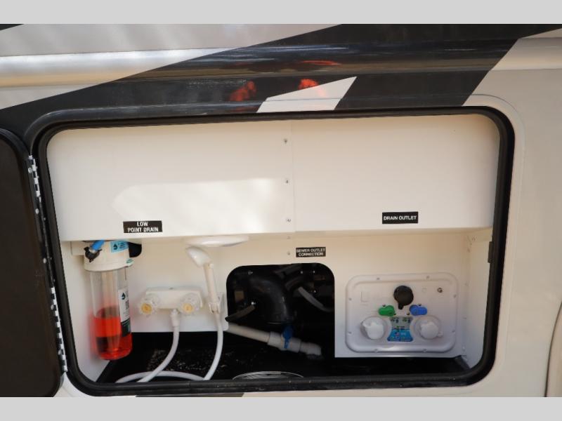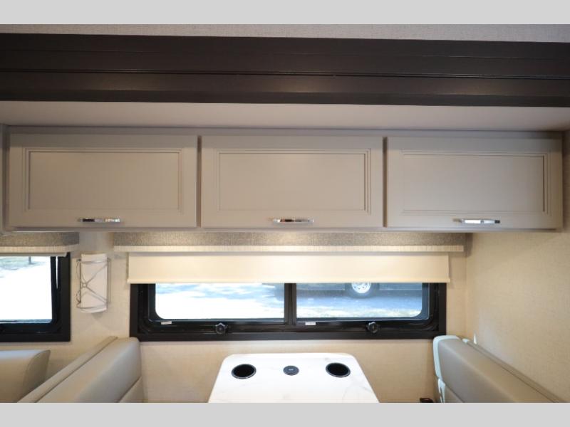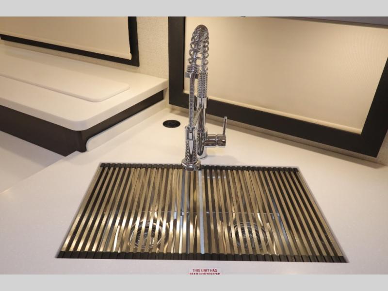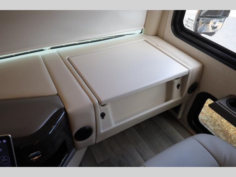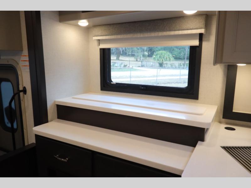 It's a clean decision to take this motorhome on your next vacation with a bath and a half! The 48" x 74" bunk over cab provides sleeping space in addition to the private bedroom which has a Tilt-A-View inclining queen bed slide for a good night's rest, a closet, a 32" LED TV to watch your favorite movies in comfort, and an area that has stacking washer and dryer prep next to a closet and pantry. Plus, you have access to the full rear bathroom which has a dual sink vanity and a 52" x 30" shower with a seat. You could even transform the 72" Dream Dinette and 74" jackknife sofa into extra sleeping spaces or switch out the sofa for optional 74" theater seating all located in front of the fireplace. Enjoy entertainment even outdoors with the outside TV.