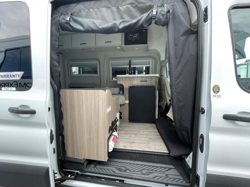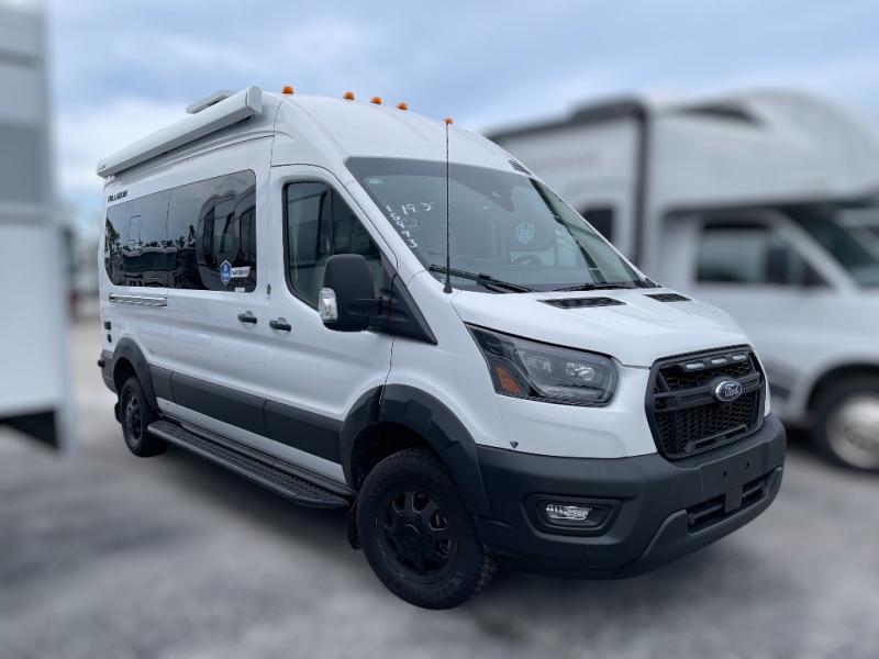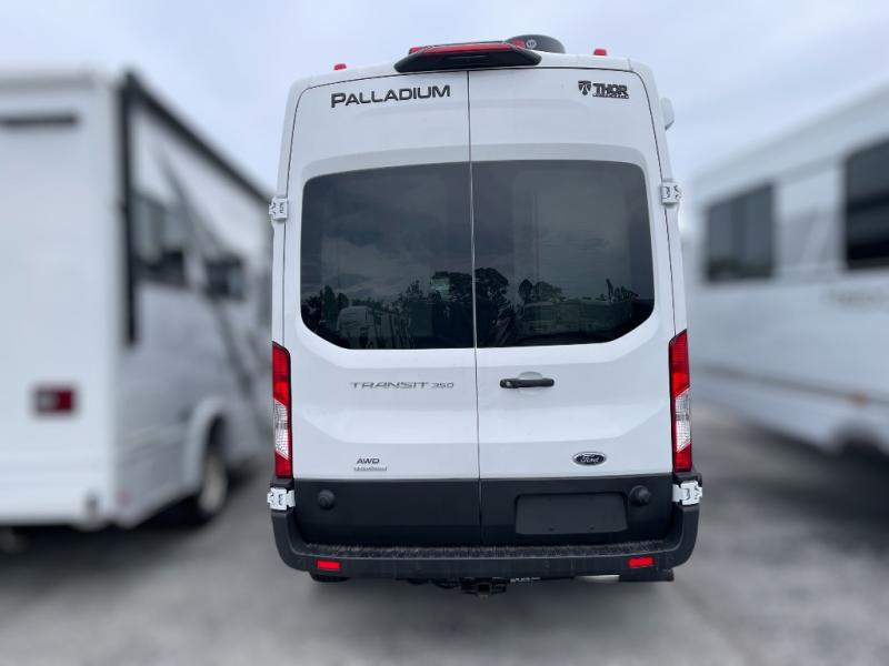 With any Palladium Class B gas motorhome by Thor Motor Coach, you can plan to go off-road with the Ford Transit Trail all-wheel drive chassis with a 3.5" body lift and Goodyear Wrangler Workhorse all-terrain tires. There is invisible front paint protection, a sliding door with an opening window, plus a 6,000 lb. trailer hitch for towing purposes. You will love the Thule lateral arm power awning with integrated LED lighting that will create an inviting outdoor space, and you can add the optional bike rack on the rear door if you plan to hit some trails! These camper vans include vinyl flooring inside, along with flat panel upper cabinet doors, Encompass Shades (cassette shades), large opening side windows, and many more comforts. You will also appreciate the solar charge controller with a 200W solar panel, the Combi Eco (LP) furnace and water heating system, and the FireFly multiplex wiring control system to name a few hassle-free amenities!