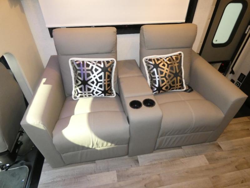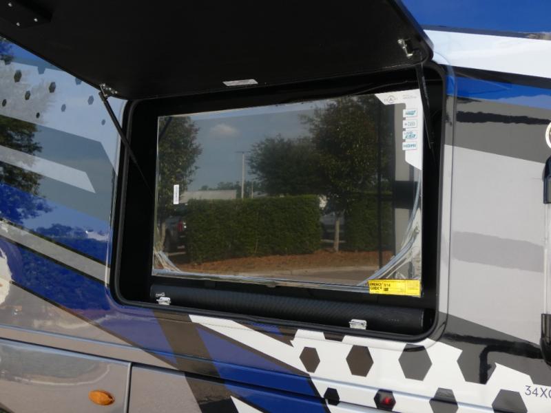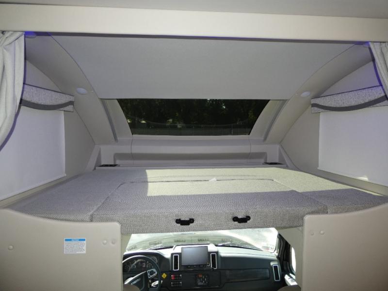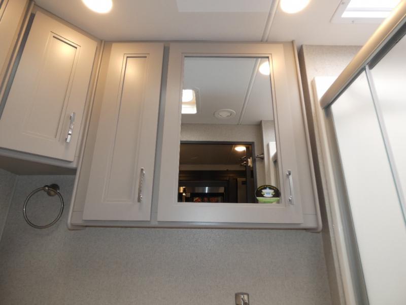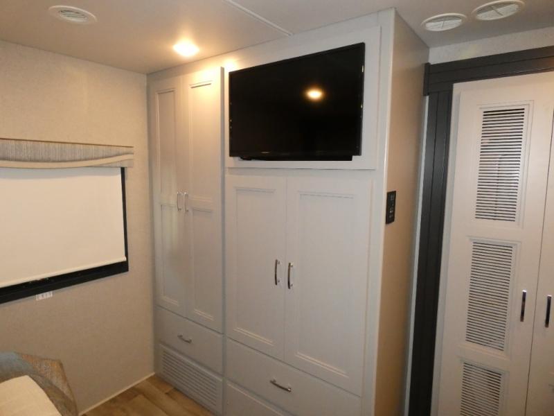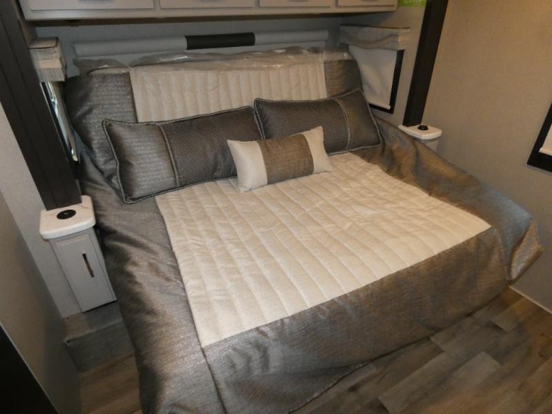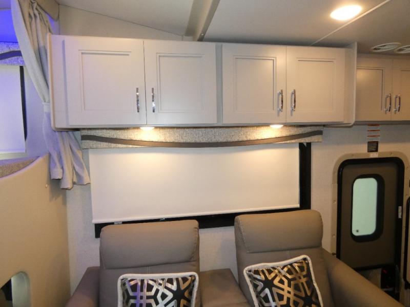 You will have a comfortable time traveling in this motorhome! With the power and smoothness of the ride, the driver might not want to stop very often when they get to experience air ride adjustable cockpit seating for the driver and passenger seats and an automotive dashboard with everything at arm's reach. Once you decide which RV park to set up at, the large kitchen slide and the bedroom slide provide more interior floor space to enjoy. The cook will have a 19 cu. ft. residential refrigerator, a two-burner gas range top with single induction cooktop, a convection microwave, a pantry, and a kitchen waste basket is also provided. The kids or your guests will love sleeping on the cab-over bunk, plus the furniture doubles as sleeping space. You will be able to relax and unwind while sleeping on a 72" x 80" Tilt-A-View inclining king bed in privacy of the rear bedroom!