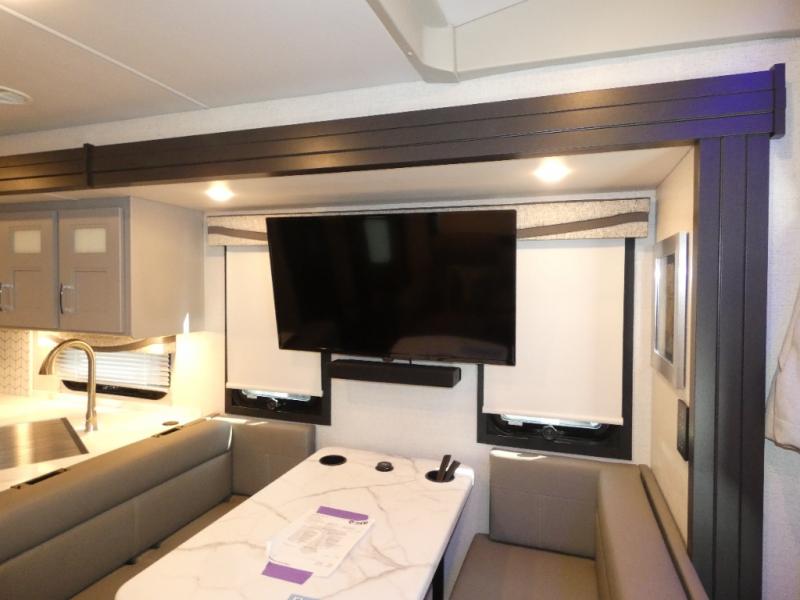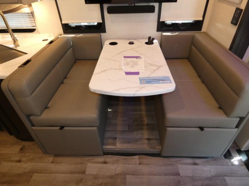 With any Pasadena Super C diesel motorhome by Thor Motor Coach, the rotocast basement pass-through storage compartments are durable and easy to clean. Other capabilities include the automotive dash with Android Auto and/or Apple CarPlay on a large 10.1" touch screen when you plug in your phone, and a side view camera system, plus a significant gross combined vehicle rating of the chassis allows plenty of pulling capacity even when fully loaded. There is even solar onboard and a Winegard ConnecT 5G system to stay connected. The S2RV Freightliner chassis with Atlas foundation might be the reason you looked at this coach, yet all the other features might be why you decide to go big and choose a Pasadena such as the residential linoleum throughout, the leatherette home theater seating with footrests, the solid surface countertops and designer backsplash in the kitchen, and the list continues!