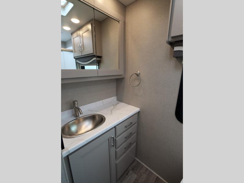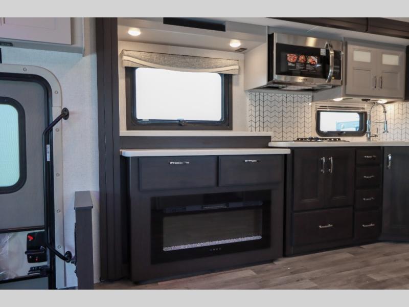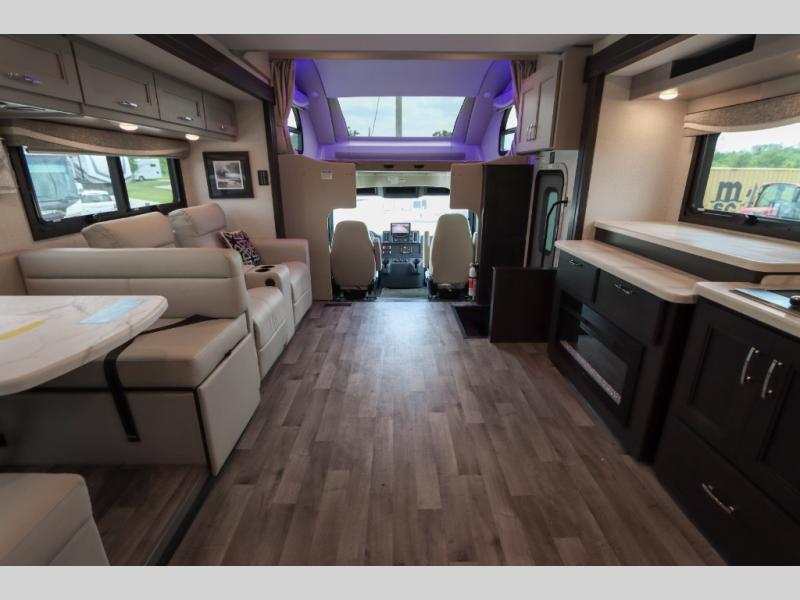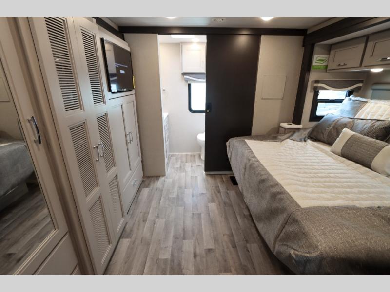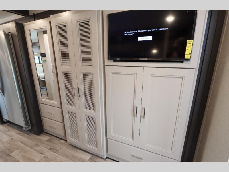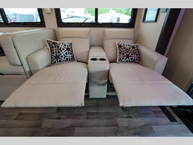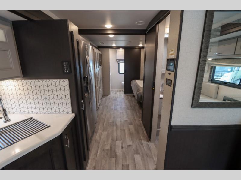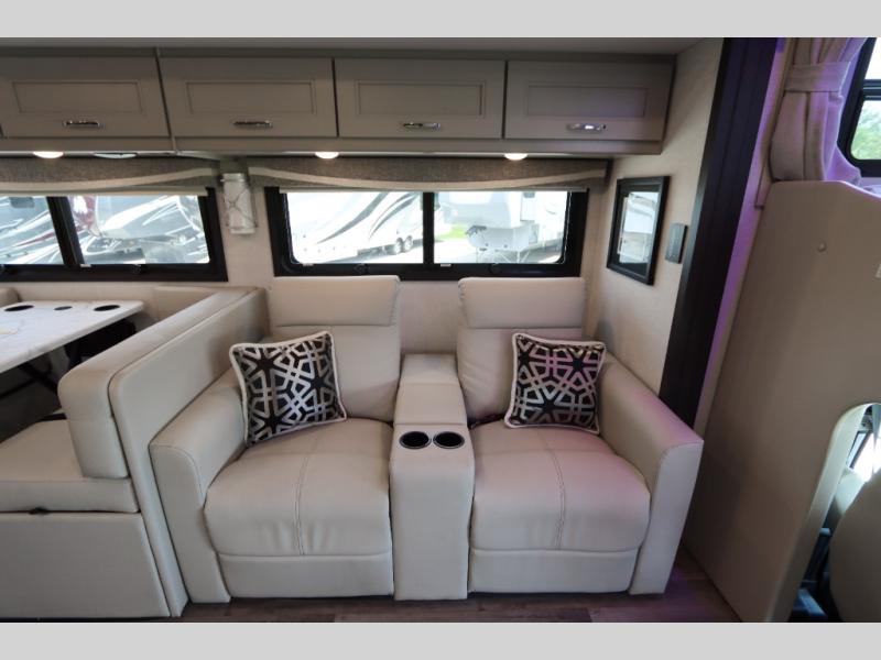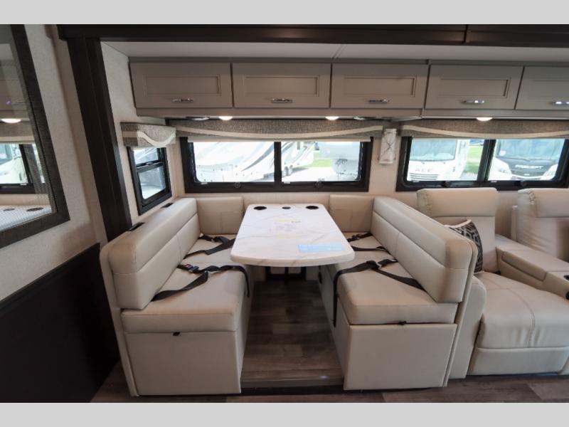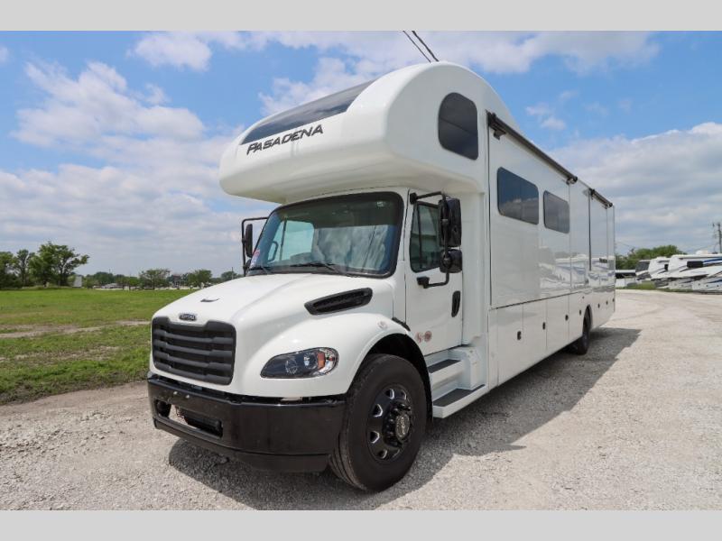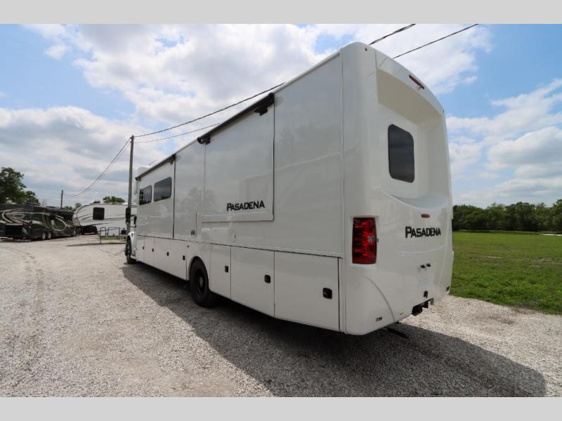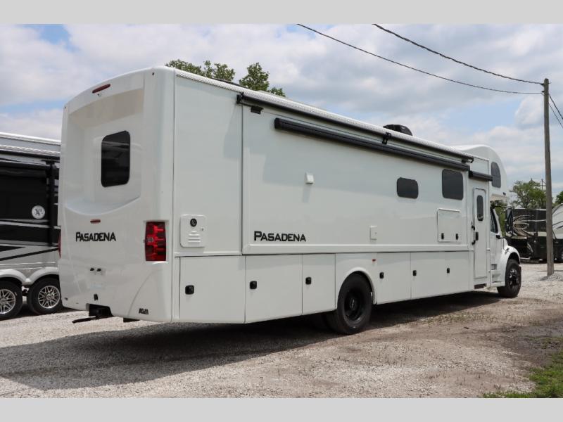 With any Pasadena Super C diesel motorhome by Thor Motor Coach, the rotocast basement pass-through storage compartments are durable and easy to clean. Other capabilities include the automotive dash with Android Auto and/or Apple CarPlay on a large 10.1" touch screen when you plug in your phone, and a side view camera system, plus a significant gross combined vehicle rating of the chassis allows plenty of pulling capacity even when fully loaded. There is even solar onboard and a Winegard ConnecT 2.0 system to stay connected. The S2RV Freightliner chassis with Atlas foundation might be the reason you looked at this coach, yet all the other features might be why you decide to go big and choose a Pasadena such as the residential luxury vinyl tile flooring, the leatherette home theater seating with footrests, the solid surface countertops and designer backsplash in the kitchen, and the list continues!