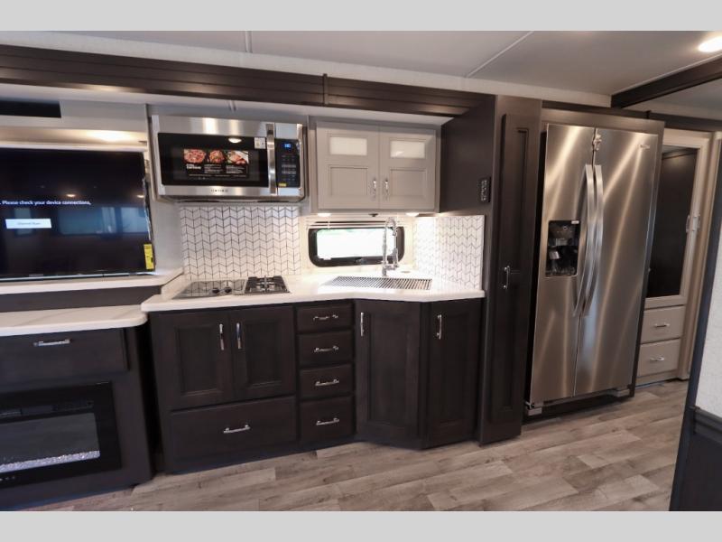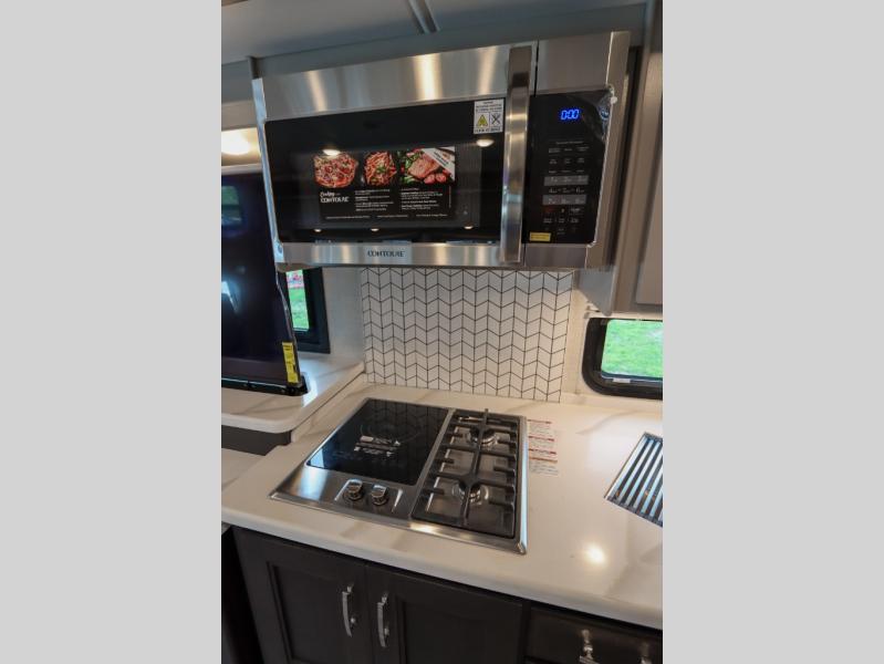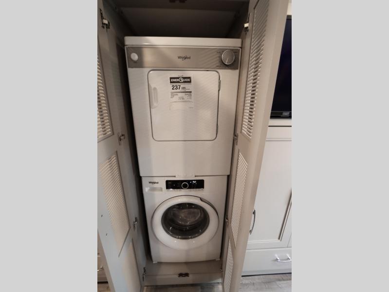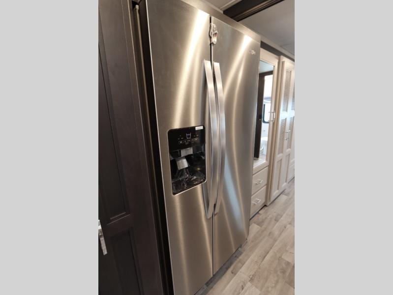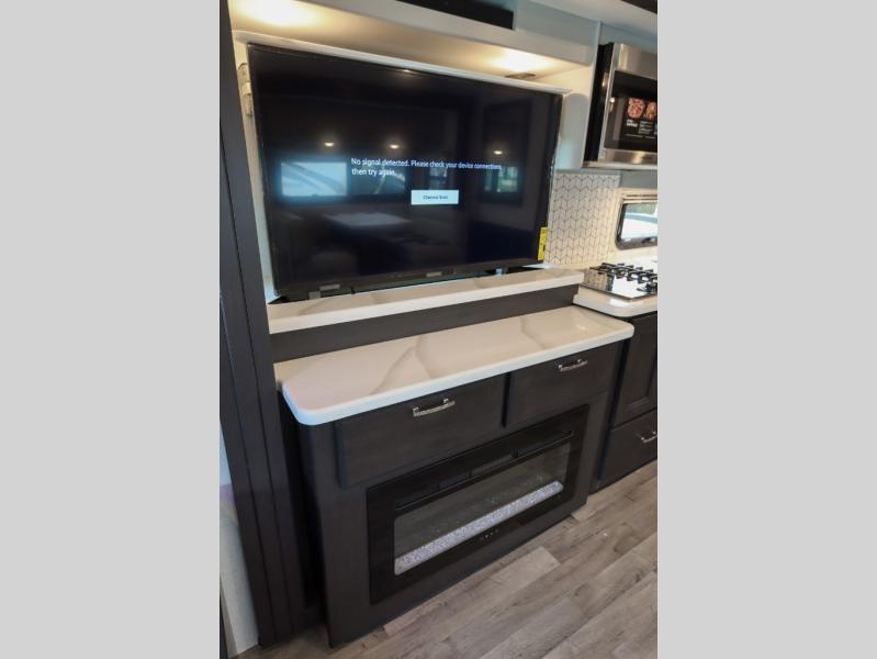Wherever you decide to roam, you will be met with comfort at each turn! The full-wall slide will open up your whole space, plus you will have two additional slides for maximum space. Your crew can play a game at the Dream Dinette, relax on the theater seating across from the TV and fireplace, or head outdoors to watch the exterior TV! The fully-equipped kitchen comes with a 21 cu. ft. residential refrigerator, a two burner high-output gas range, plus a 30" stainless steel over-the-range convection oven to make daily meals. You will feel right at home with the master bedroom that includes a Tilt-A-View inclining king bed slide, a 32" LED Smart TV, plus tons of storage space for your belongings. There is even stackable washer and dryer prep to make laundry day easier than ever. The full rear bath will be perfect for you, and the mid-coach half bath will be perfect for guests!