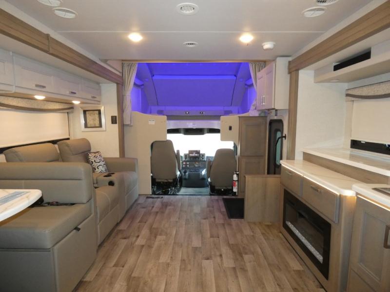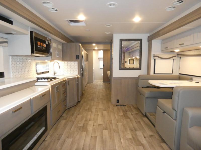 With any Pasadena Super C diesel motorhome by Thor Motor Coach, the rotocast basement pass-through storage compartments are durable and easy to clean. Other capabilities include the automotive dash with Android Auto and/or Apple CarPlay on a large 10.1" touch screen when you plug in your phone, and a side view camera system, plus a significant gross combined vehicle rating of the chassis allows plenty of pulling capacity even when fully loaded. There is even solar onboard and a Winegard ConnecT 5G system to stay connected. The S2RV Freightliner chassis with Atlas foundation might be the reason you looked at this coach, yet all the other features might be why you decide to go big and choose a Pasadena such as the residential linoleum throughout, the leatherette home theater seating with footrests, the solid surface countertops and designer backsplash in the kitchen, and the list continues!