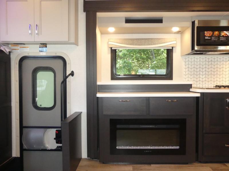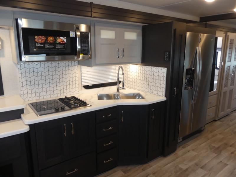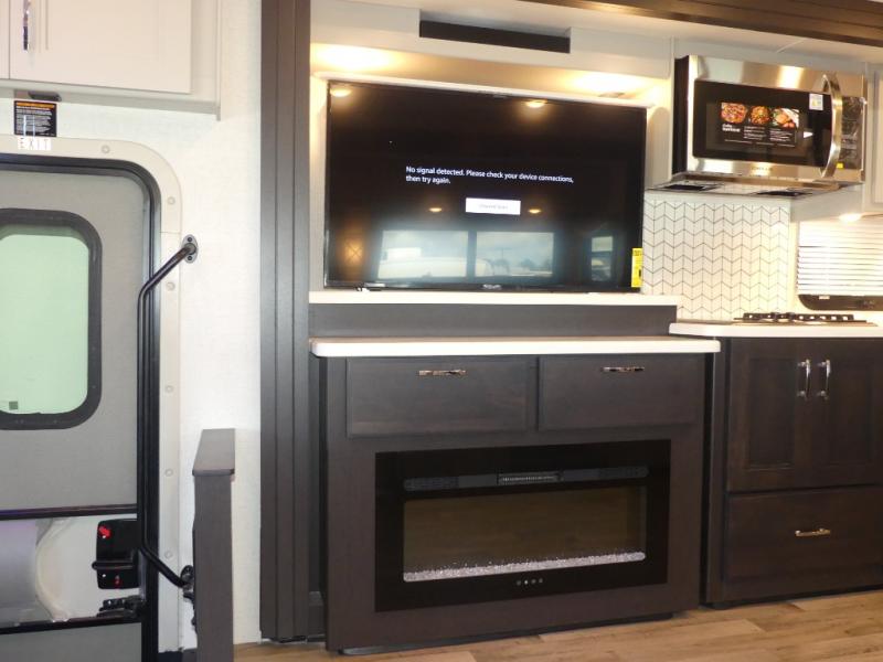 Wherever you decide to roam, you will be met with comfort at each turn! The full-wall slide will open up your whole space, plus you will have two additional slides for maximum space. Your crew can play a game at the Dream Dinette, relax on the theater seating across from the TV and fireplace, or head outdoors to watch the exterior TV! The fully-equipped kitchen comes with a 21 cu. ft. residential refrigerator, a two burner high-output gas range, plus a 30" stainless steel over-the-range convection oven to make daily meals. You will feel right at home with the master bedroom that includes a Tilt-A-View inclining king bed slide, a 32" LED Smart TV, plus tons of storage space for your belongings. There is even stackable washer and dryer prep to make laundry day easier than ever. The full rear bath will be perfect for you, and the mid-coach half bath will be perfect for guests!