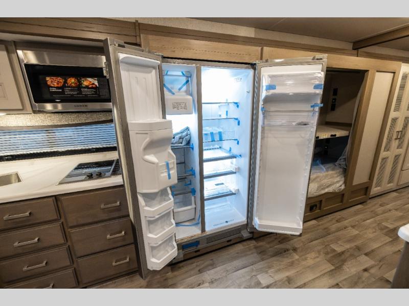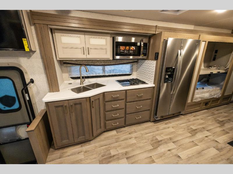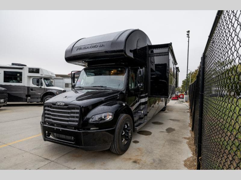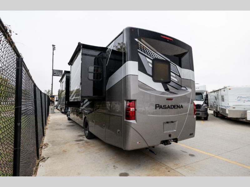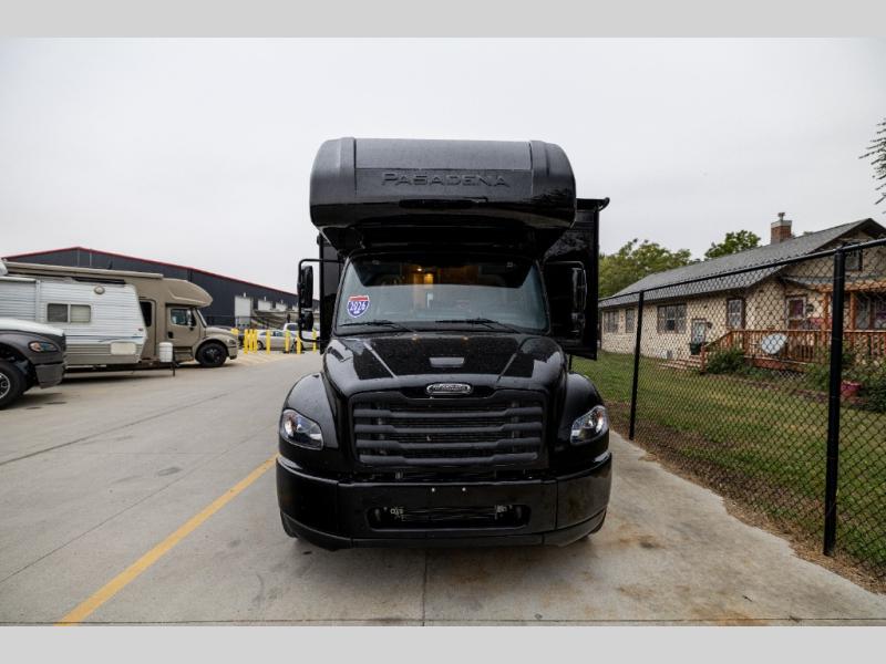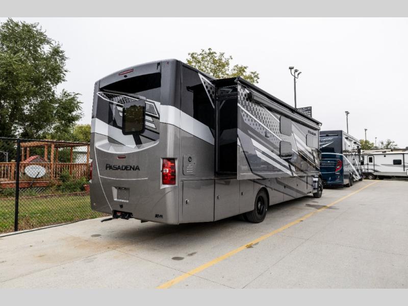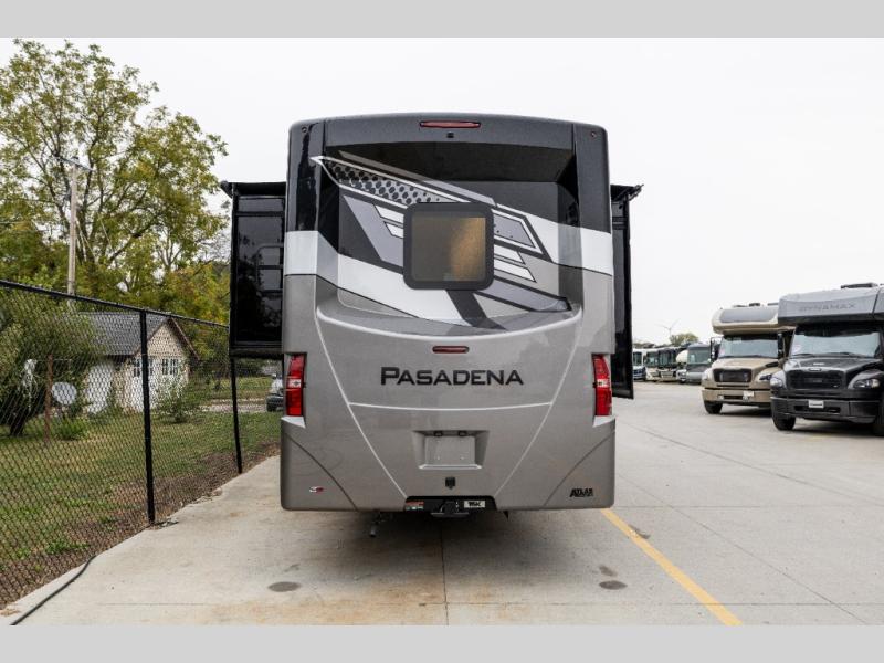 With any Pasadena Super C diesel motorhome by Thor Motor Coach, the rotocast basement pass-through storage compartments are durable and easy to clean. Other capabilities include the automotive dash with Android Auto and/or Apple CarPlay on a large 10.1" touch screen when you plug in your phone, and a side view camera system, plus a significant gross combined vehicle rating of the chassis allows plenty of pulling capacity even when fully loaded. There is even solar onboard and a Winegard ConnecT 5G system to stay connected. The S2RV Freightliner chassis with Atlas foundation might be the reason you looked at this coach, yet all the other features might be why you decide to go big and choose a Pasadena such as the residential linoleum throughout, the leatherette home theater seating with footrests, the solid surface countertops and designer backsplash in the kitchen, and the list continues!