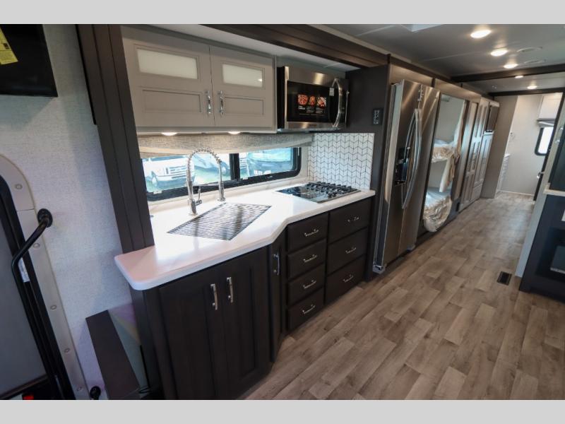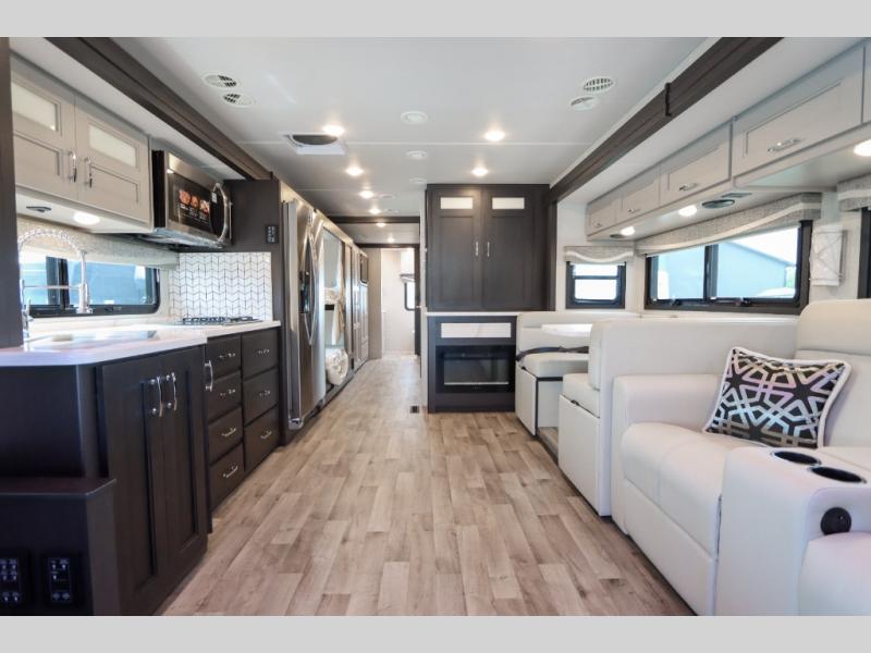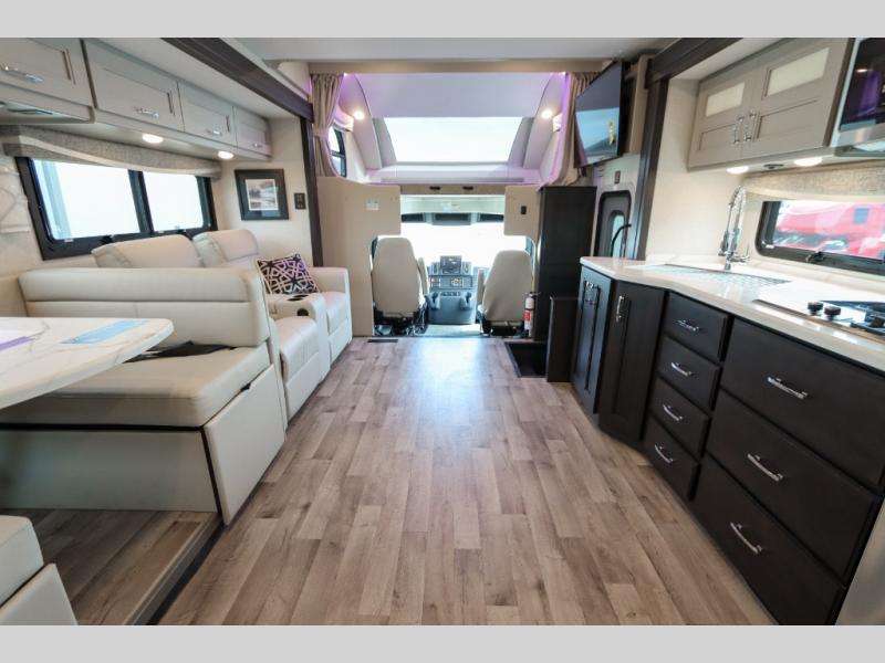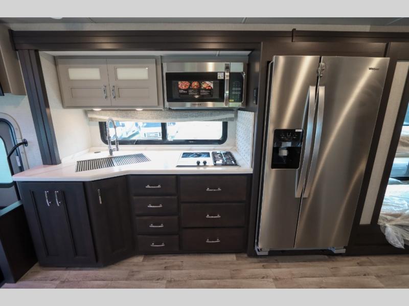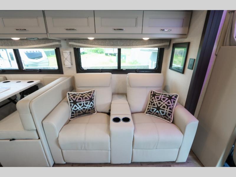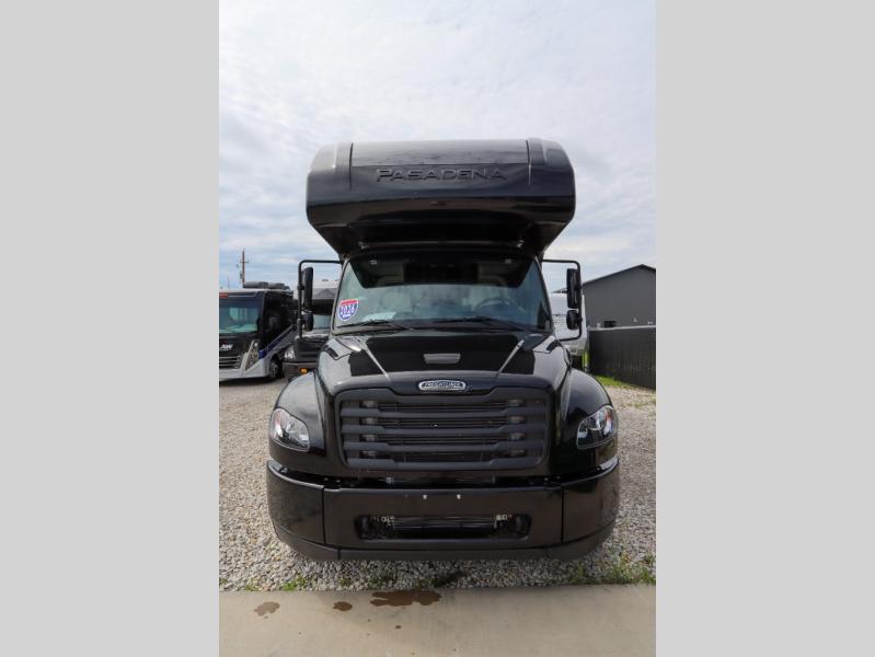 With any Pasadena Super C diesel motorhome by Thor Motor Coach, the rotocast basement pass-through storage compartments are durable and easy to clean. Other capabilities include the automotive dash with Android Auto and/or Apple CarPlay on a large 10.1" touch screen when you plug in your phone, and a side view camera system, plus a significant gross combined vehicle rating of the chassis allows plenty of pulling capacity even when fully loaded. There is even solar onboard and a Winegard ConnecT 5G system to stay connected. The S2RV Freightliner chassis with Atlas foundation might be the reason you looked at this coach, yet all the other features might be why you decide to go big and choose a Pasadena such as the residential linoleum throughout, the leatherette home theater seating with footrests, the solid surface countertops and designer backsplash in the kitchen, and the list continues!