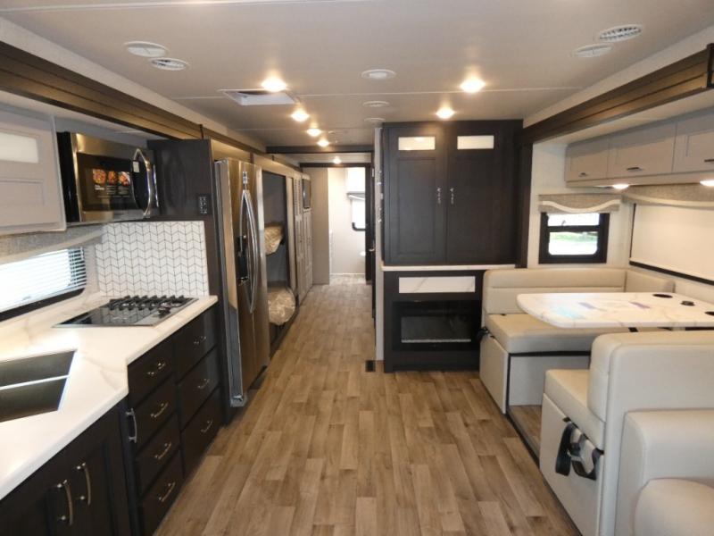 Get ready for a trip of a lifetime each and every time you hit the road in this Super C diesel coach! With the power and smoothness of the ride, the driver might not want to stop very often when they get to experience air ride adjustable cockpit seating for the driver and passenger seats. The cook will have a residential refrigerator, a two-burner gas range top, a convection microwave, a pantry and a 78" dream dinette is provided. The kids or your guests will love sleeping on the bunk beds and the cab-over bunk, plus the 27" x 74" bunk beds furnish more sleeping space. You will be able to relax and unwind while sleeping on a 72" x 80" Tilt-A-View inclining king bed in privacy of the bedroom. Relaxation is ensured thanks to the full rear bathroom equipped with everything you need to take care of yourself, this unit also features a half bath adding more comfort for your family or guests!