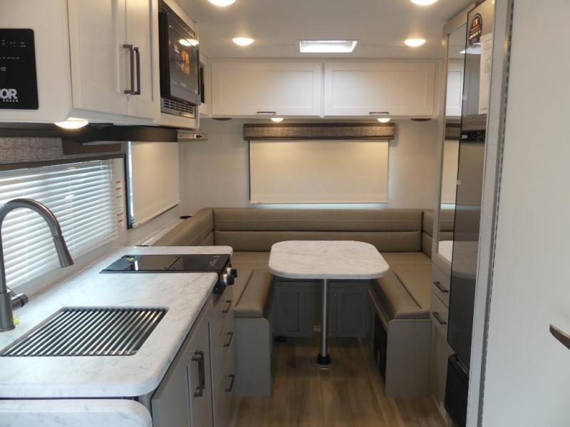 This compact, yet cozy coach is perfect for trips to the campground each weekend! Once you've reached your destination, you can set up the 11' power awning, unload the exterior storage compartments, and relax in your camp chairs. The two burner gas cooktop and convection microwave with an air fryer will let you make meals each day, and there is a 12V refrigerator to keep food fresh. A flip-up counter is another great feature that will give you more prep space! You can freshen up in the wet bath, grab your night clothes from the closet, then convert the U-shaped dinette into a 54" x 77" bed for a great night's rest!
