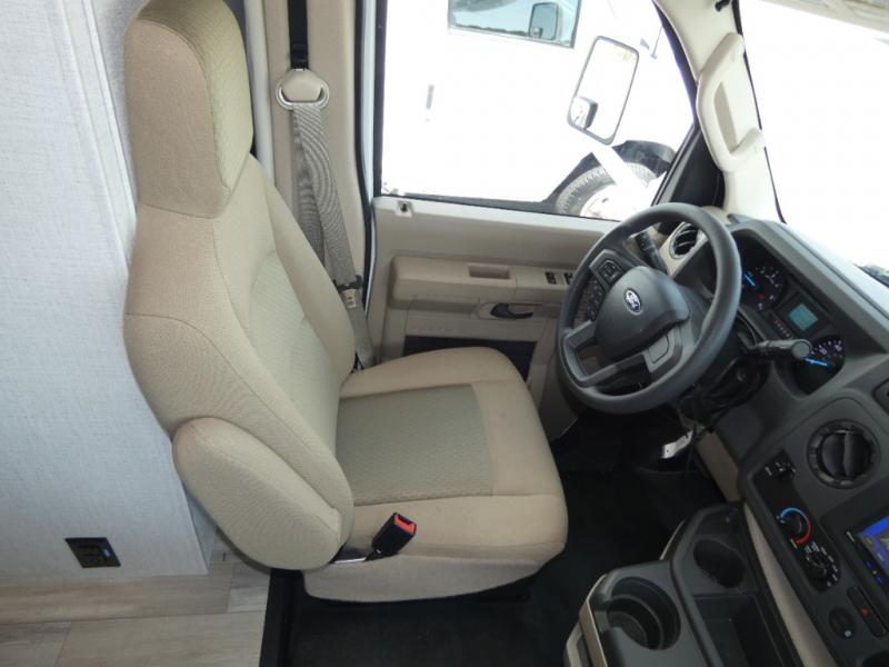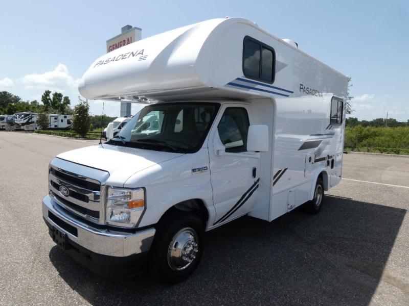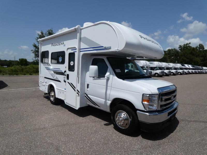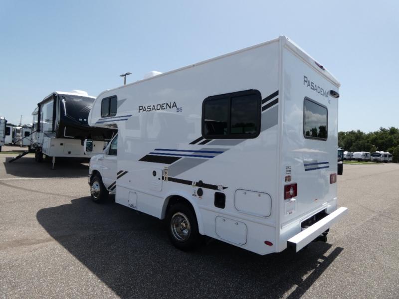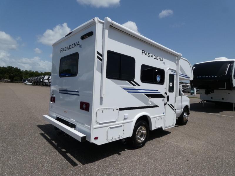 With any Pasadena SE Class C gas motorhome by Thor Motor Coach, you will find convenient amenities, a modern interior, and a reliable Ford E-Series chassis on select models to power your adventures. There is a one-piece fiberglass front cap, and premium one-piece roofing for added strength. Residential vinyl flooring will be easy to keep clean, and you'll love the LED lighting, pressed laminate countertops throughout, and full-extensions ball-bearing drawer guides. These motorhomes also include a generator and a 30-amp shoreline power cord to keep you going, along with a tankless water heater to ensure your comfort!