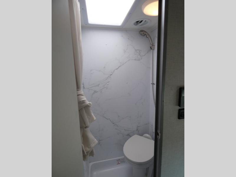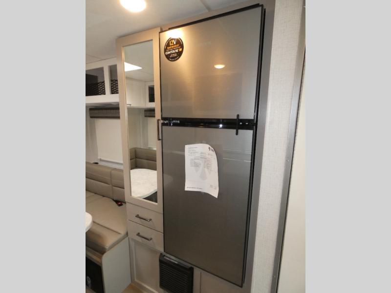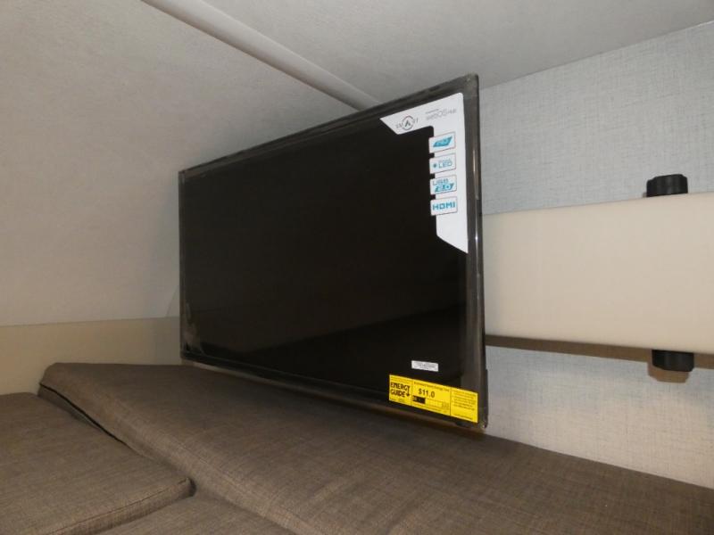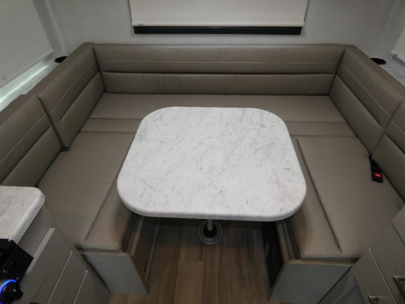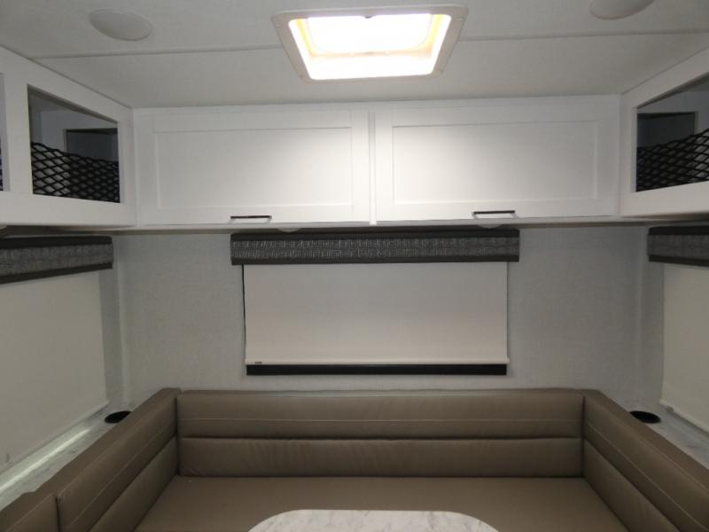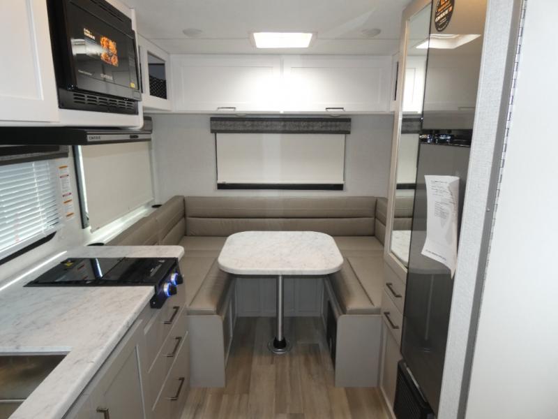 This compact, yet cozy coach is perfect for trips to the campground each weekend! Once you've reached your destination, you can set up the 11' power awning, unload the exterior storage compartments, and relax in your camp chairs. The two burner gas cooktop and convection microwave with an air fryer will let you make meals each day, and there is a 12V refrigerator to keep food fresh. A flip-up counter is another great feature that will give you more prep space! You can freshen up in the wet bath, grab your night clothes from the closet, then convert the U-shaped dinette into a 54" x 77" bed for a great night's rest!