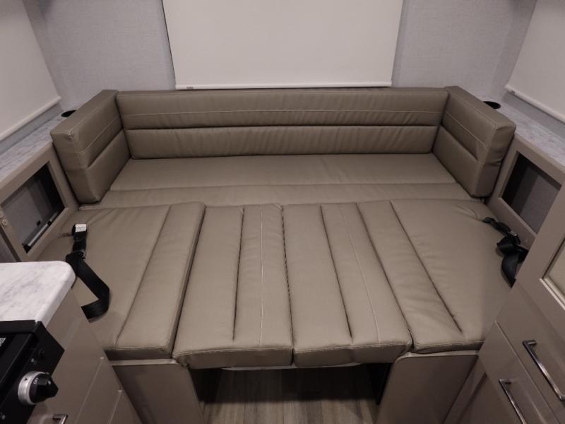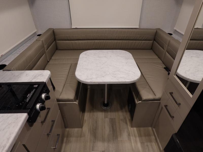This compact, yet cozy coach is perfect for trips to the campground each weekend! Once you've reached your destination, you can set up the 11' power awning, unload the exterior storage compartments, and relax in your camp chairs. The two burner gas cooktop and convection microwave with an air fryer will let you make meals each day, and there is a 12V refrigerator to keep food fresh. A flip-up counter is another great feature that will give you more prep space! You can freshen up in the wet bath, grab your night clothes from the closet, then convert the U-shaped dinette into a 54" x 77" bed for a great night's rest!