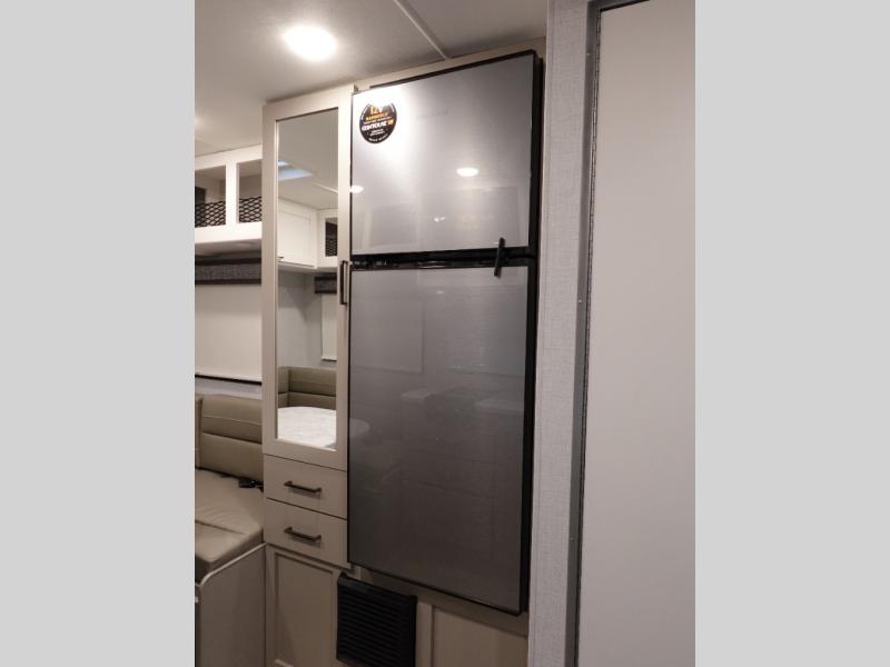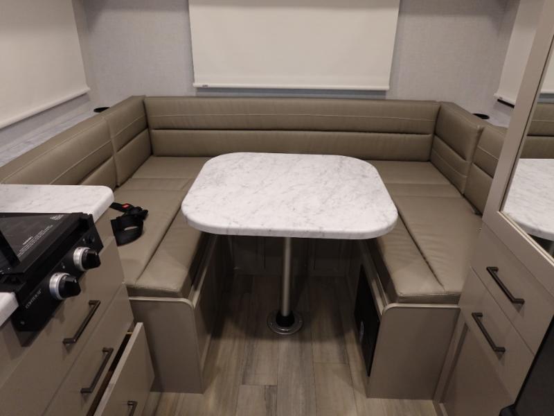 This compact, yet cozy coach is perfect for trips to the campground each weekend! Once you've reached your destination, you can set up the 11' power awning, unload the exterior storage compartments, and relax in your camp chairs. The two burner gas cooktop and convection microwave with an air fryer will let you make meals each day, and there is a 12V refrigerator to keep food fresh. A flip-up counter is another great feature that will give you more prep space! You can freshen up in the wet bath, grab your night clothes from the closet, then convert the U-shaped dinette into a 54" x 77" bed for a great night's rest!