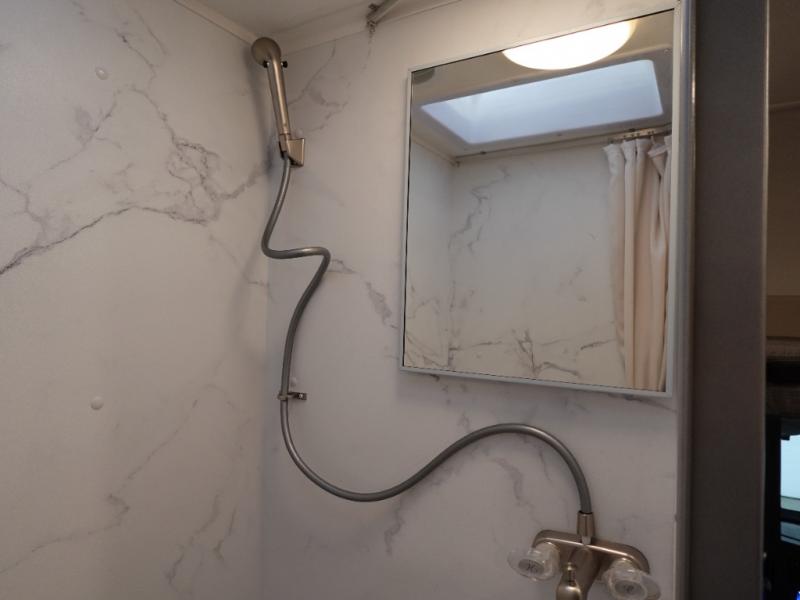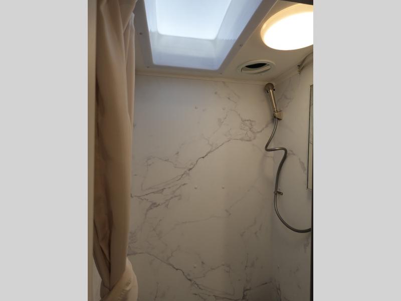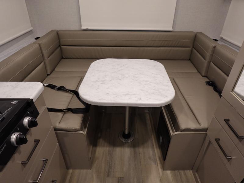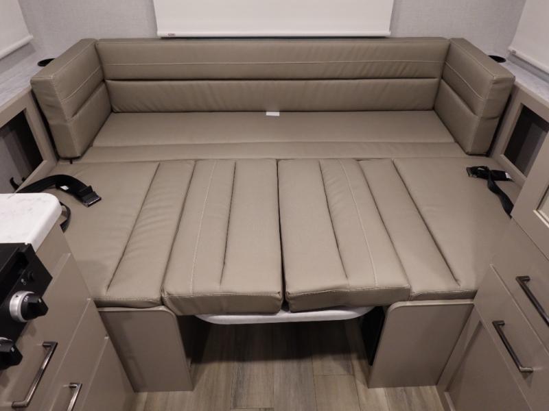 This compact, yet cozy coach is perfect for trips to the campground each weekend! Once you've reached your destination, you can set up the 11' power awning, unload the exterior storage compartments, and relax in your camp chairs. The two burner gas cooktop and convection microwave with an air fryer will let you make meals each day, and there is a 12V refrigerator to keep food fresh. A flip-up counter is another great feature that will give you more prep space! You can freshen up in the wet bath, grab your night clothes from the closet, then convert the U-shaped dinette into a 54" x 77" bed for a great night's rest!