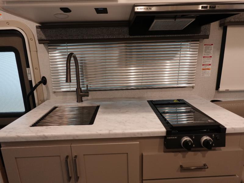 This compact, yet cozy coach is perfect for trips to the campground each weekend! Once you've reached your destination, you can set up the 11' power awning, unload the exterior storage compartments, and relax in your camp chairs. The two burner gas cooktop and convection microwave with an air fryer will let you make meals each day, and there is a 12V refrigerator to keep food fresh. A flip-up counter is another great feature that will give you more prep space! You can freshen up in the wet bath, grab your night clothes from the closet, then convert the U-shaped dinette into a 54" x 77" bed for a great night's rest!