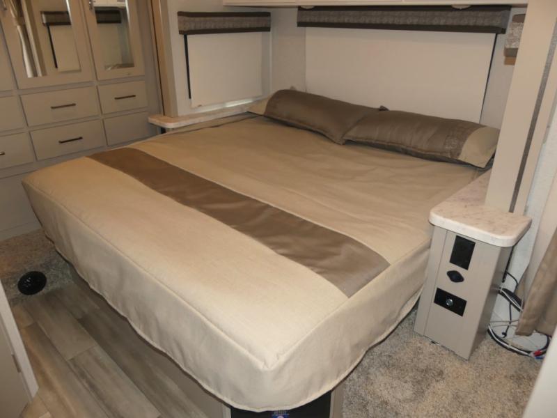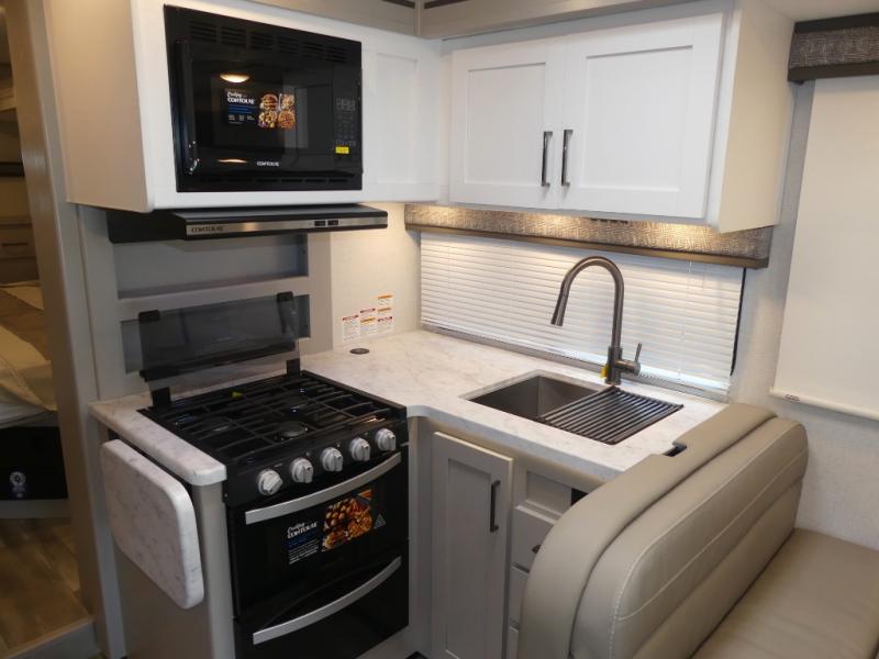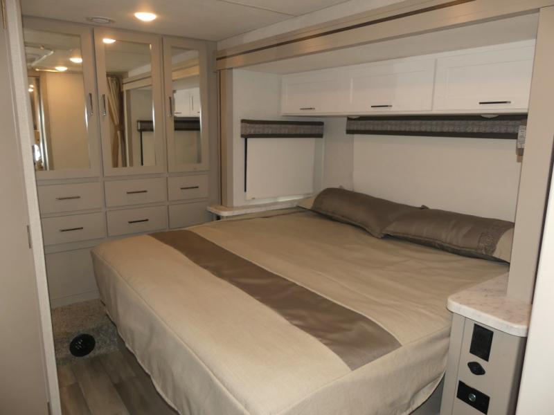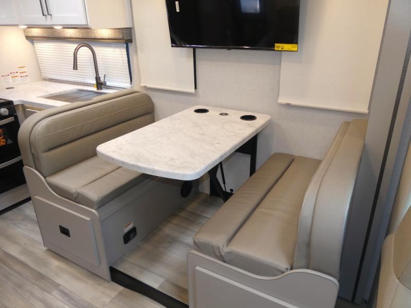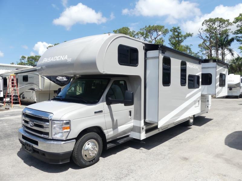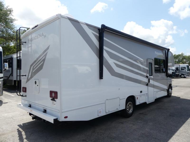 With any Pasadena SE Class C gas motorhome by Thor Motor Coach, you will find convenient amenities, a modern interior, and a reliable Ford E-Series chassis, with an optional Chevy chassis on select models to power your adventures. There is a one-piece fiberglass front cap, and premium one-piece roofing for added strength. Residential vinyl flooring will be easy to keep clean, and you'll love the LED lighting, pressed laminate countertops throughout, and full-extensions ball-bearing drawer guides. These motorhomes also include a 4.0 kW gas generator and a 30-amp shoreline power cord to keep you going, along with a tankless water heater to ensure your comfort!