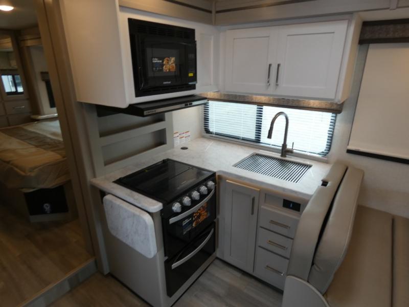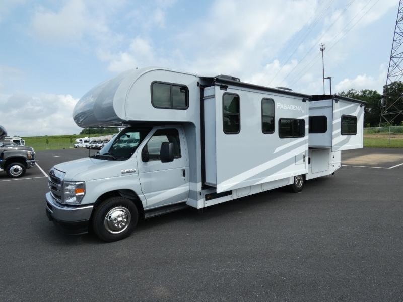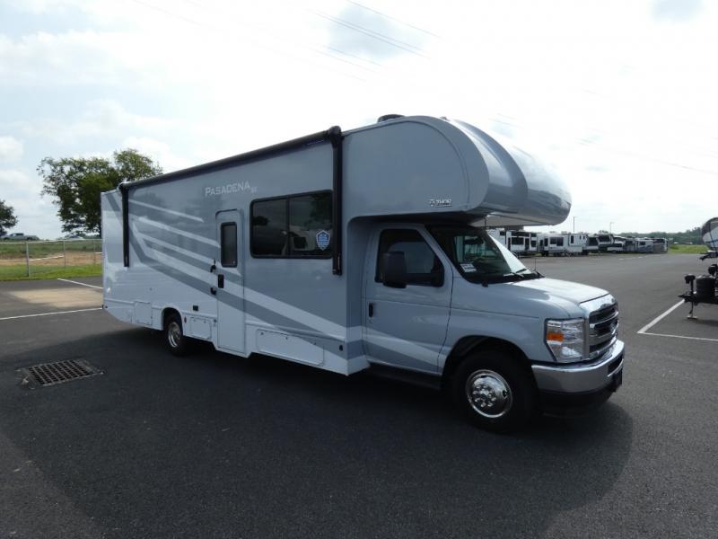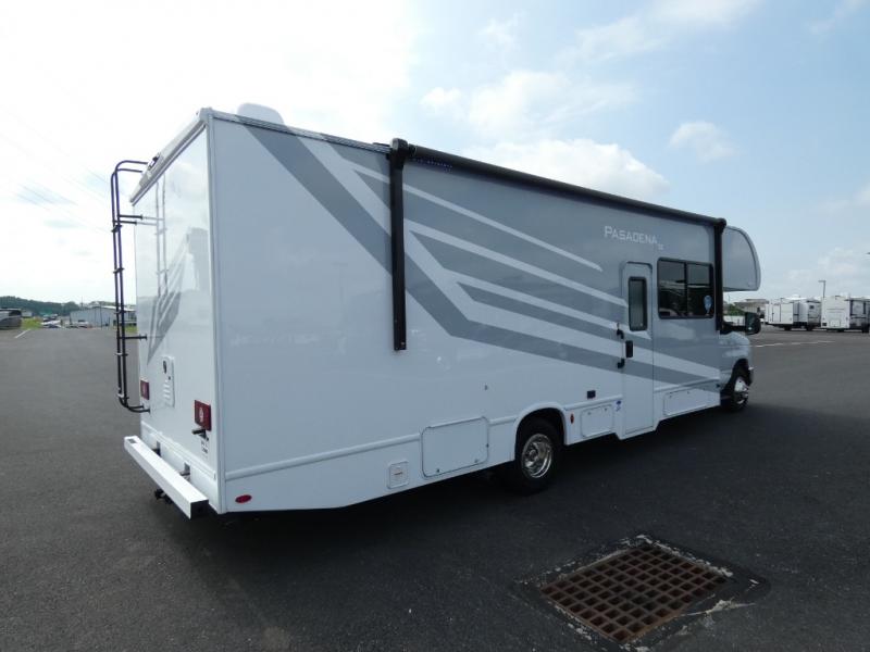 With any Pasadena SE Class C gas motorhome by Thor Motor Coach, you will find convenient amenities, a modern interior, and a reliable Ford E-Series chassis, with an optional Chevy chassis on select models to power your adventures. There is a one-piece fiberglass front cap, and premium one-piece roofing for added strength. Residential vinyl flooring will be easy to keep clean, and you'll love the LED lighting, pressed laminate countertops throughout, and full-extensions ball-bearing drawer guides. These motorhomes also include a generator and a 30-amp shoreline power cord to keep you going, along with a tankless water heater to ensure your comfort!