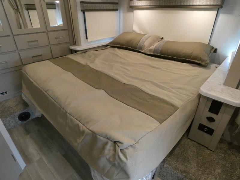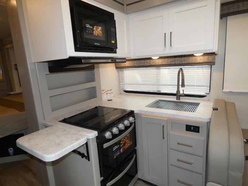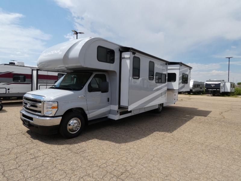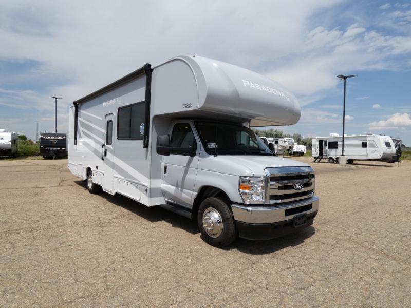 With any Pasadena SE Class C gas motorhome by Thor Motor Coach, you will find convenient amenities, a modern interior, and a reliable Ford E-Series chassis. There is a one-piece fiberglass front cap, and premium one-piece roofing for added strength. Residential vinyl flooring will be easy to keep clean, and you'll love the LED lighting, pressed laminate countertops throughout, and full-extensions ball-bearing drawer guides. These motorhomes also include a generator and a 30-amp shoreline power cord to keep you going, along with a tankless water heater to ensure your comfort!