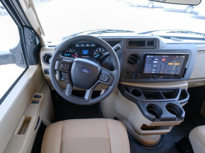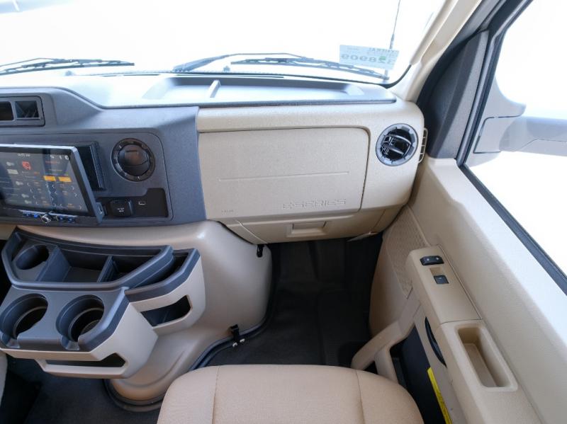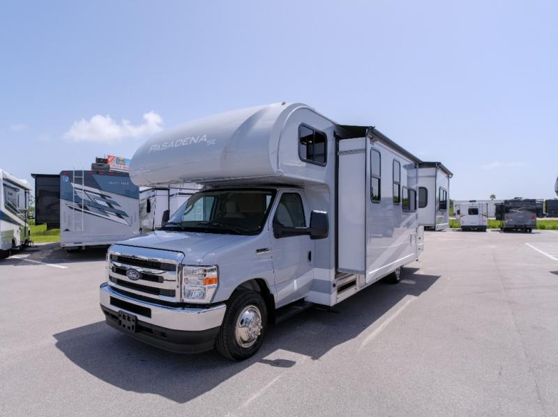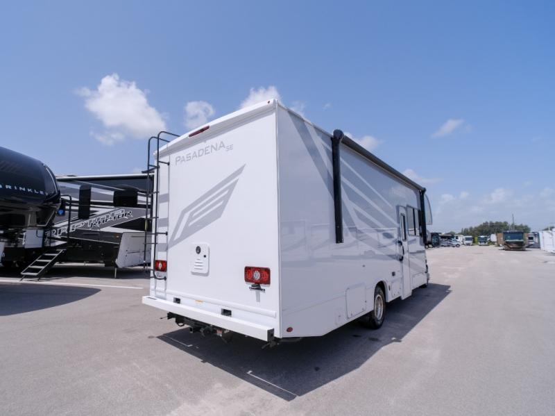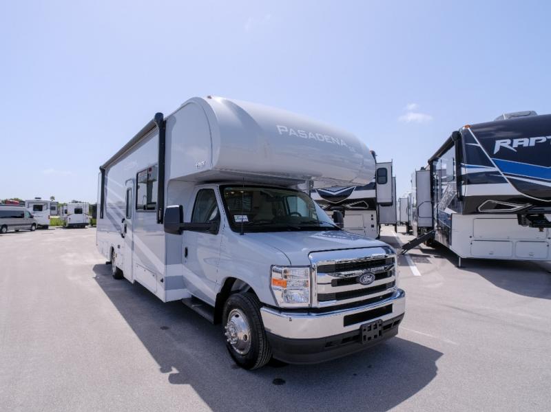 With any Pasadena SE Class C gas motorhome by Thor Motor Coach, you will find convenient amenities, a modern interior, and a reliable Ford E-Series chassis on select models to power your adventures. There is a one-piece fiberglass front cap, and premium one-piece roofing for added strength. Residential vinyl flooring will be easy to keep clean, and you'll love the LED lighting, pressed laminate countertops throughout, and full-extensions ball-bearing drawer guides. These motorhomes also include a generator and a 30-amp shoreline power cord to keep you going, along with a tankless water heater to ensure your comfort!