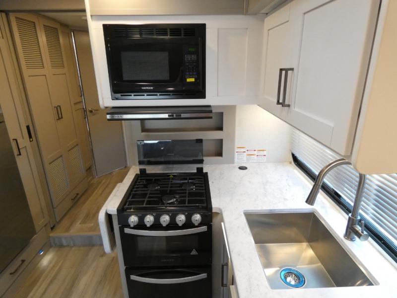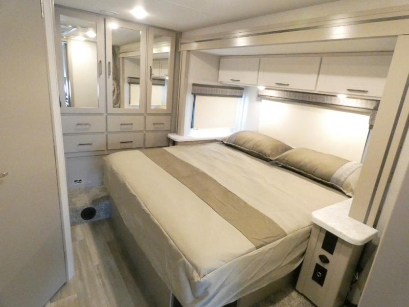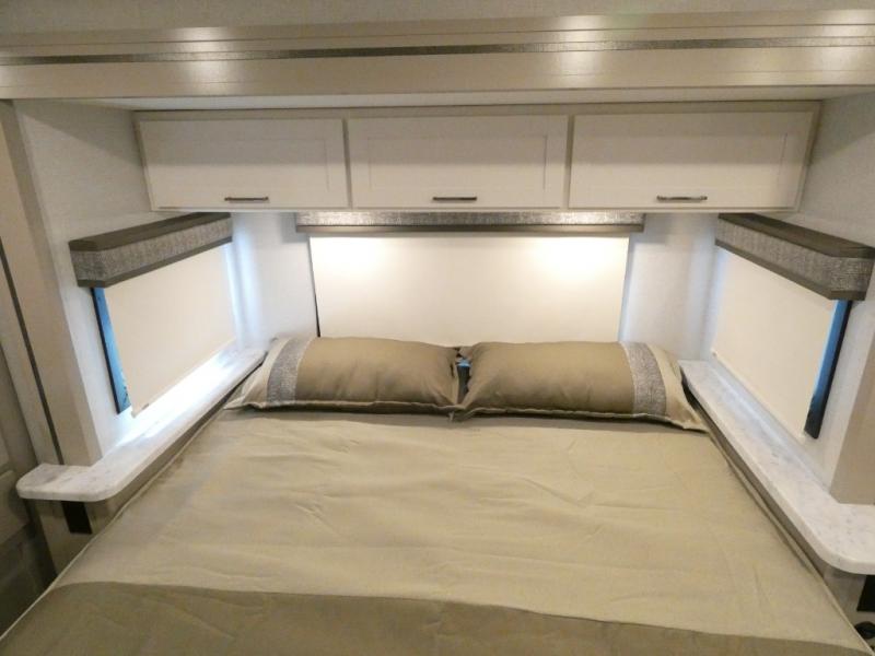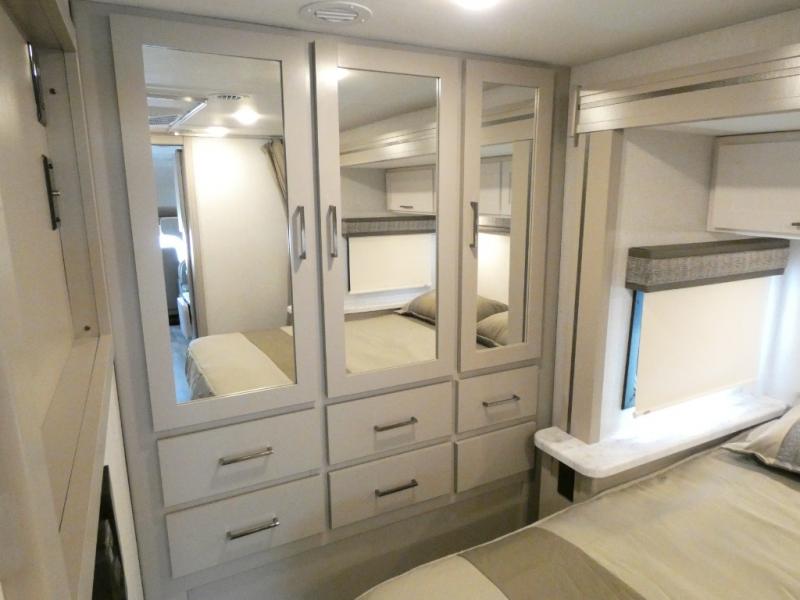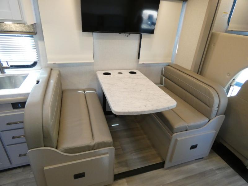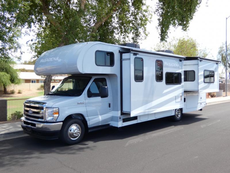 With any Pasadena SE Class C gas motorhome by Thor Motor Coach, you will find convenient amenities, a modern interior, and a reliable Ford E-Series chassis to power your adventures. There is a one-piece fiberglass front cap, and premium one-piece roofing for added strength. Residential vinyl flooring will be easy to keep clean, and you'll love the LED lighting, pressed laminate countertops throughout, and full-extensions ball-bearing drawer guides. These motorhomes also include a generator and a 30-amp shoreline power cord to keep you going, along with a tankless water heater to ensure your comfort!